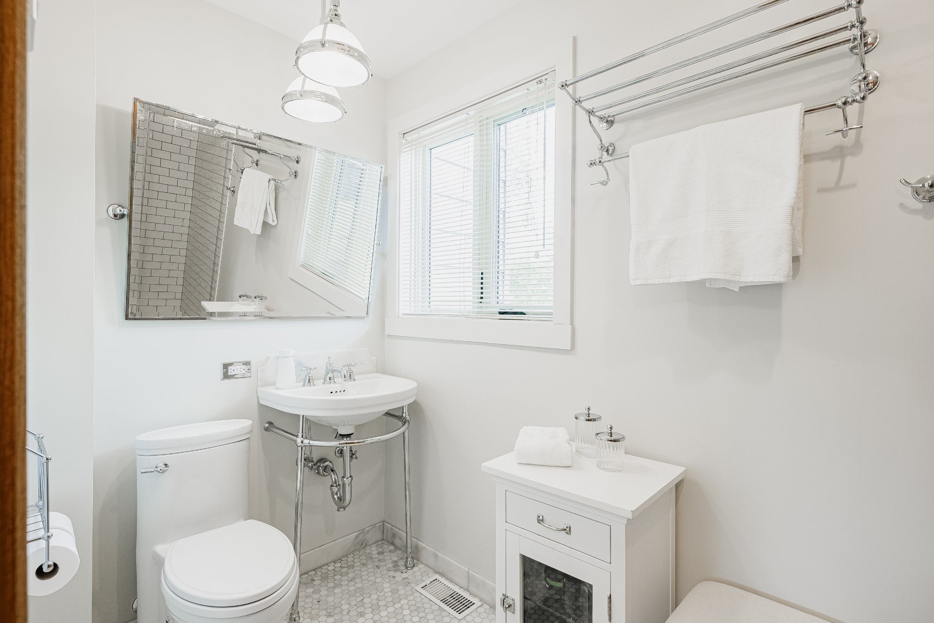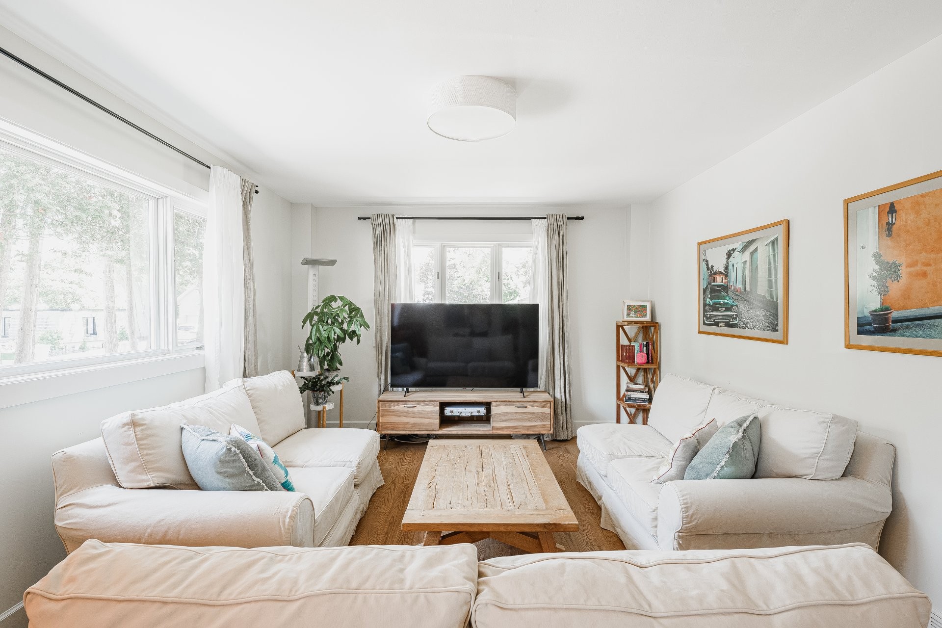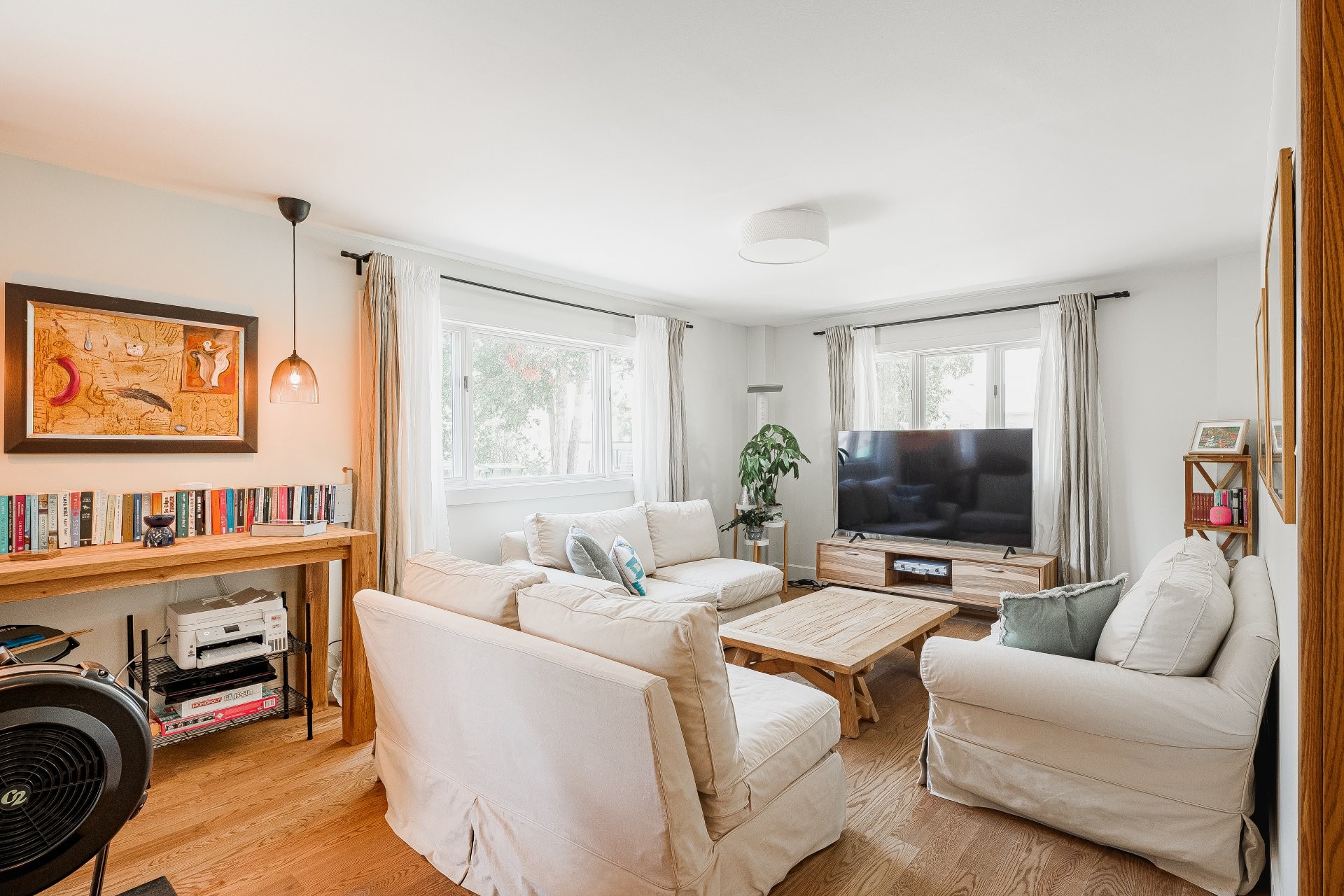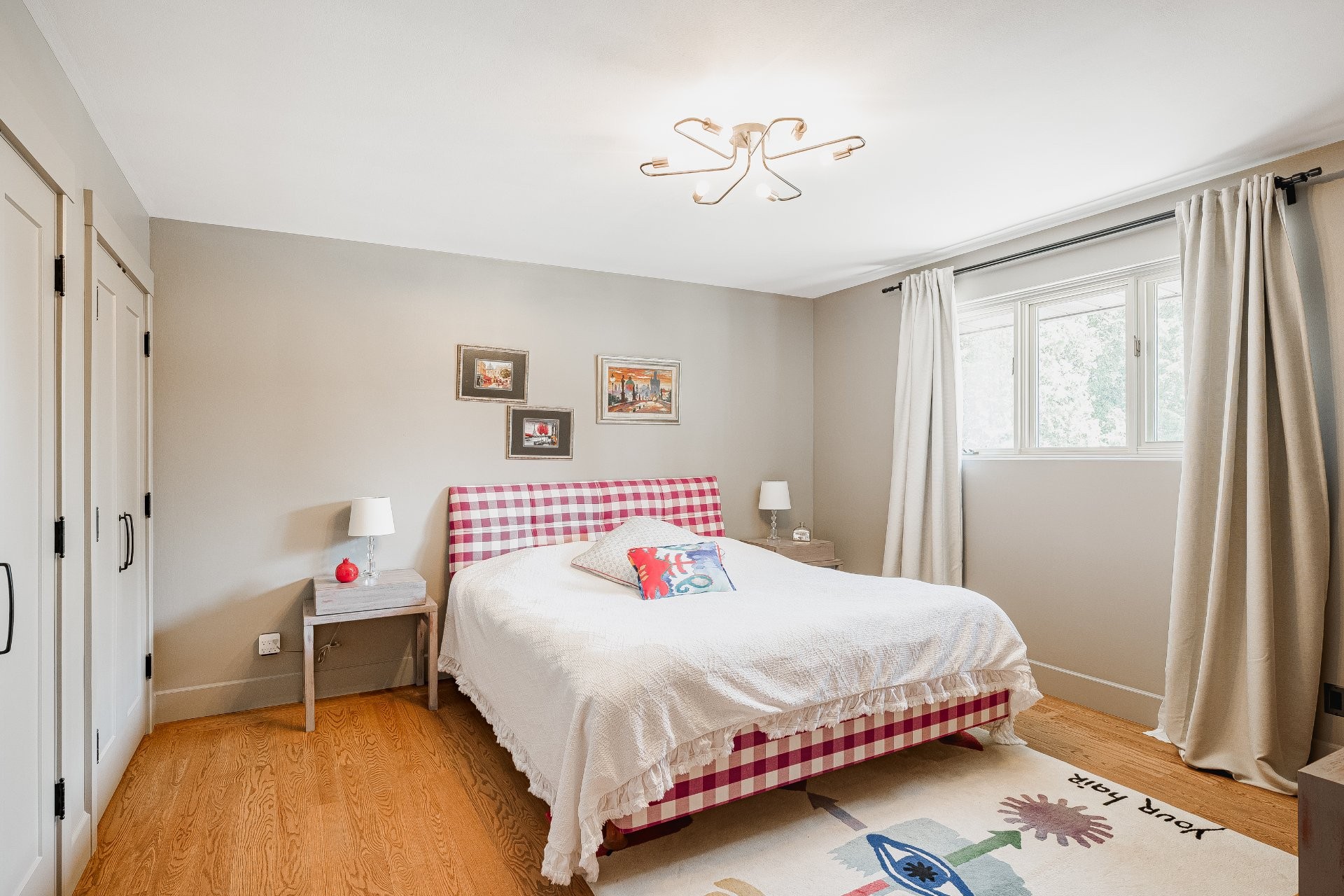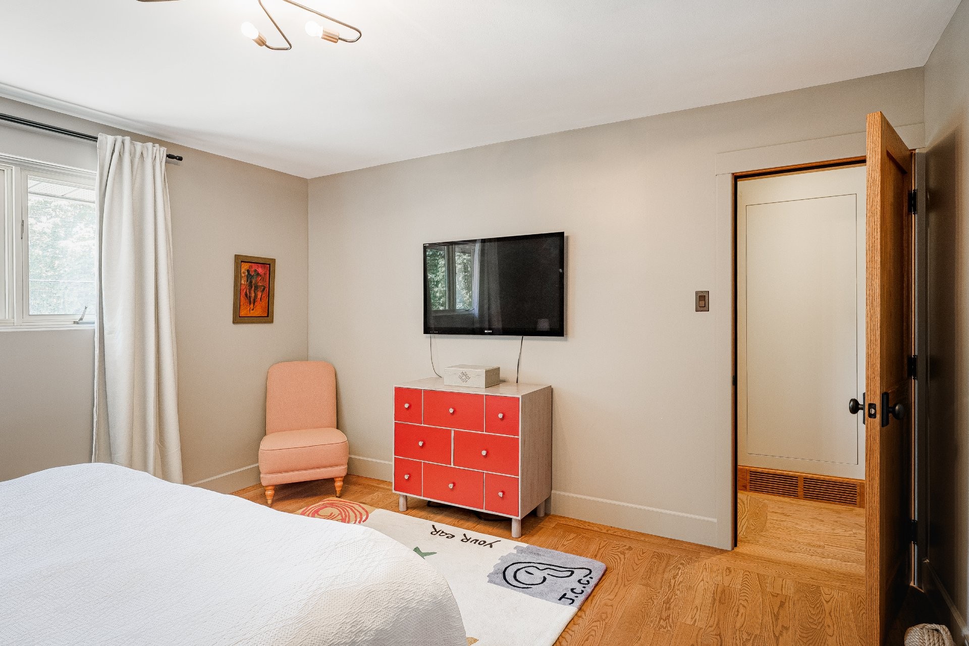 Le rez-de-jardin lumineux et aéré comprend une salle familiale confortable avec de grandes fenêtres, une quatrième chambre et une deuxième salle de bain complète. Ce niveau donne également accès à un pratique vestibule de service (mudroom), relié à la fois à la cour arrière et au garage attenant.