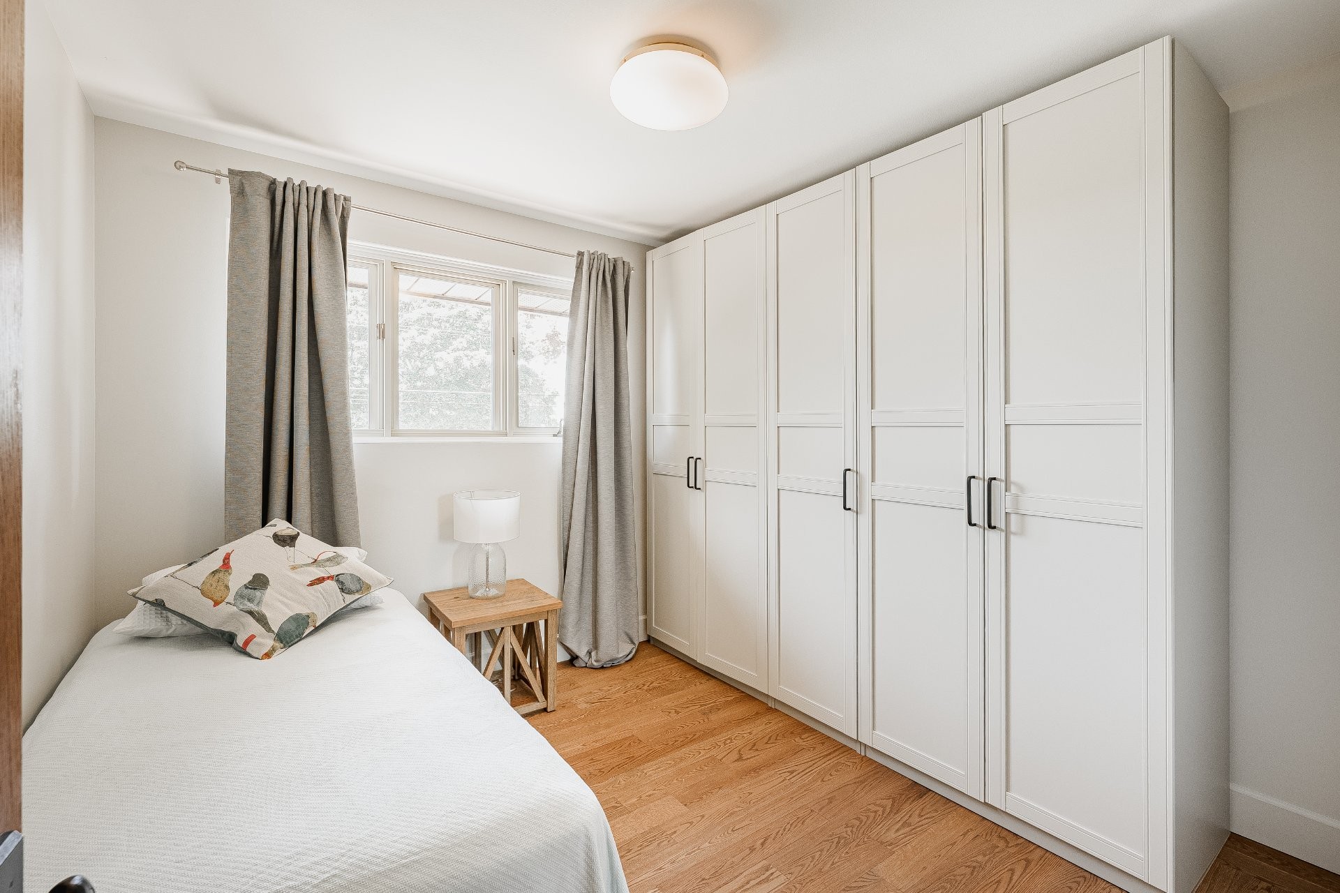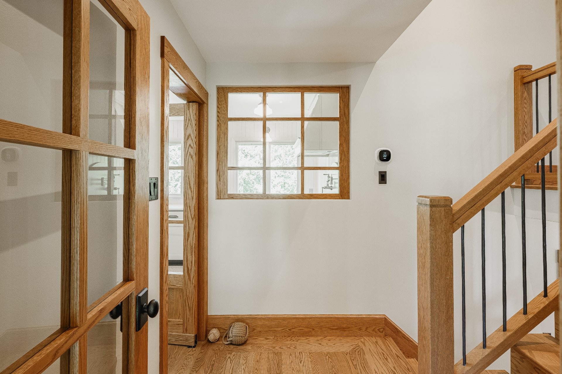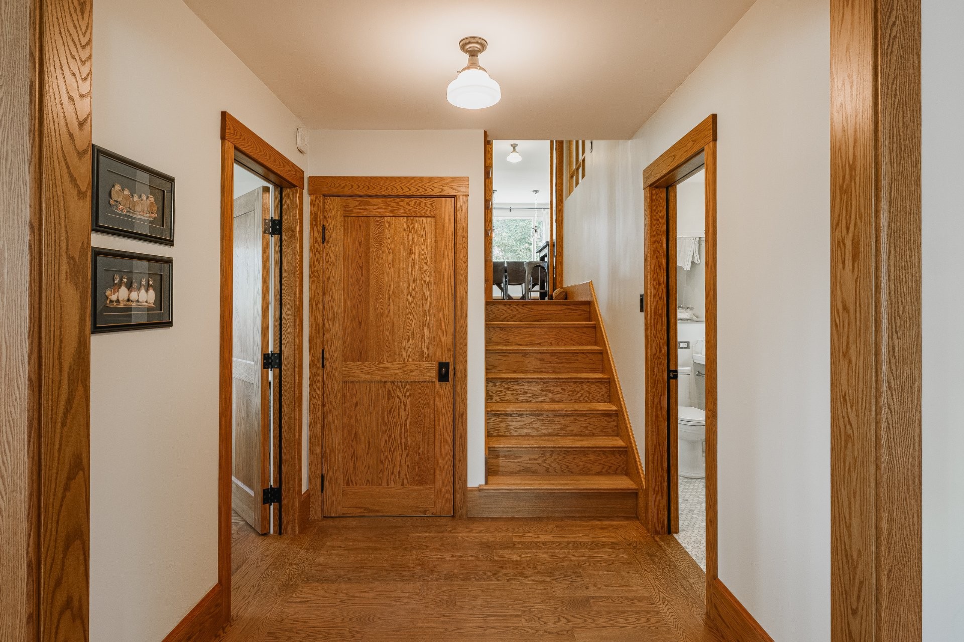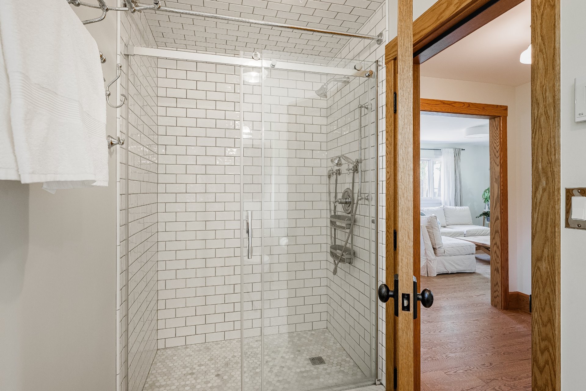 Le rez-de-jardin lumineux et aéré comprend une salle familiale confortable avec de grandes fenêtres, une quatrième chambre et une deuxième salle de bain complète. Ce niveau donne également accès à un pratique vestibule de service (mudroom), relié à la fois à la cour arrière et au garage attenant.