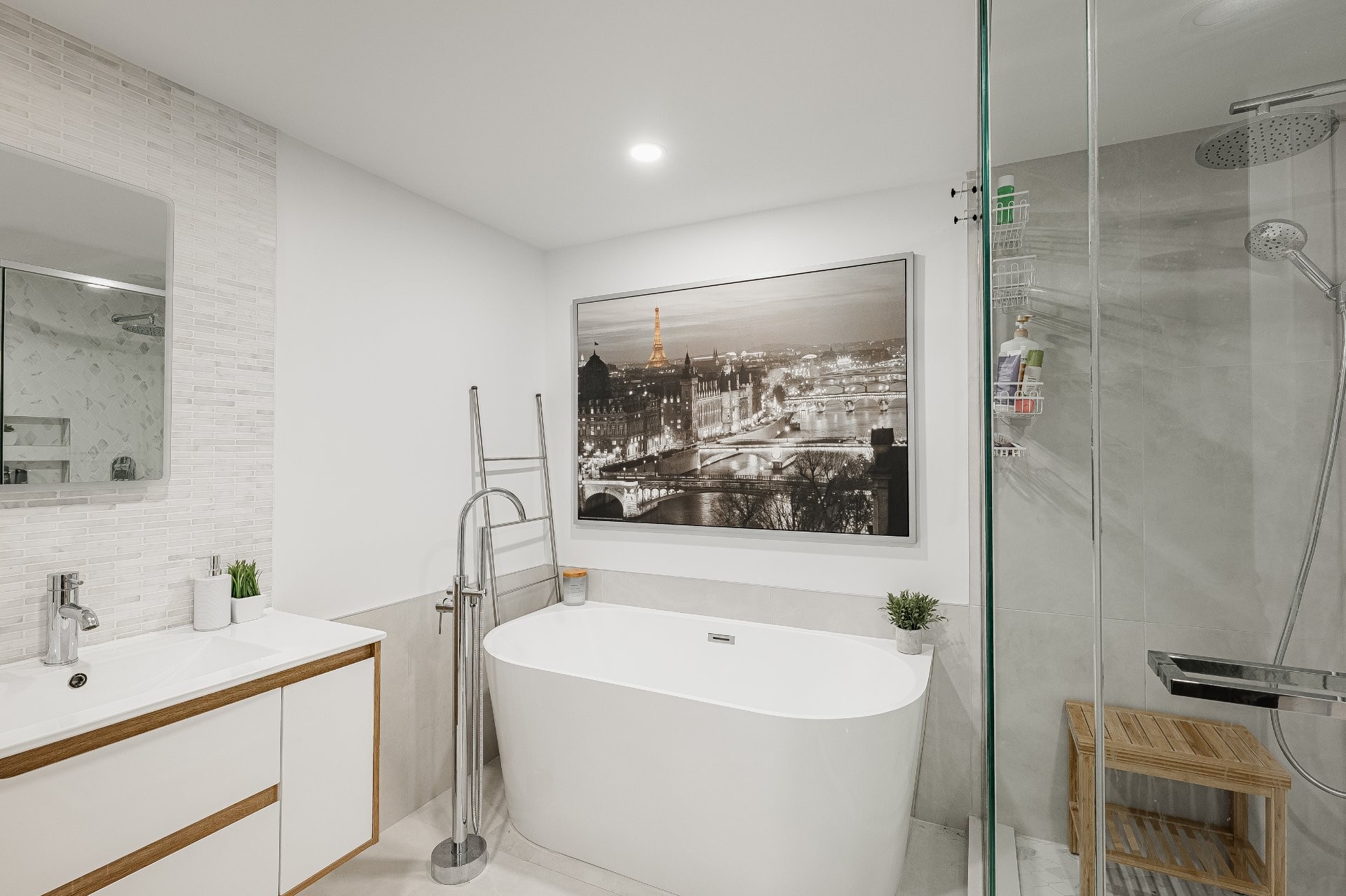 - Salle de bain complète au rez-de-chaussée et salle d'eau en mezzanine