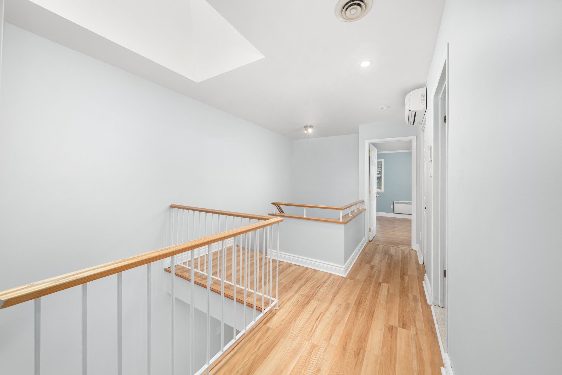 À l'étage, un puits de lumière illumine le couloir. La chambre principale, vaste et lumineuse, offre amplement d'espace de rangement. Deux autres chambres de bonnes dimensions offrent de la flexibilité pour accueillir une famille, des invités ou aménager un bureau à domicile. La salle de bain principale, entièrement rénovée, comprend une douche séparée et une baignoire autoportante idéale pour se détendre après une longue journée.