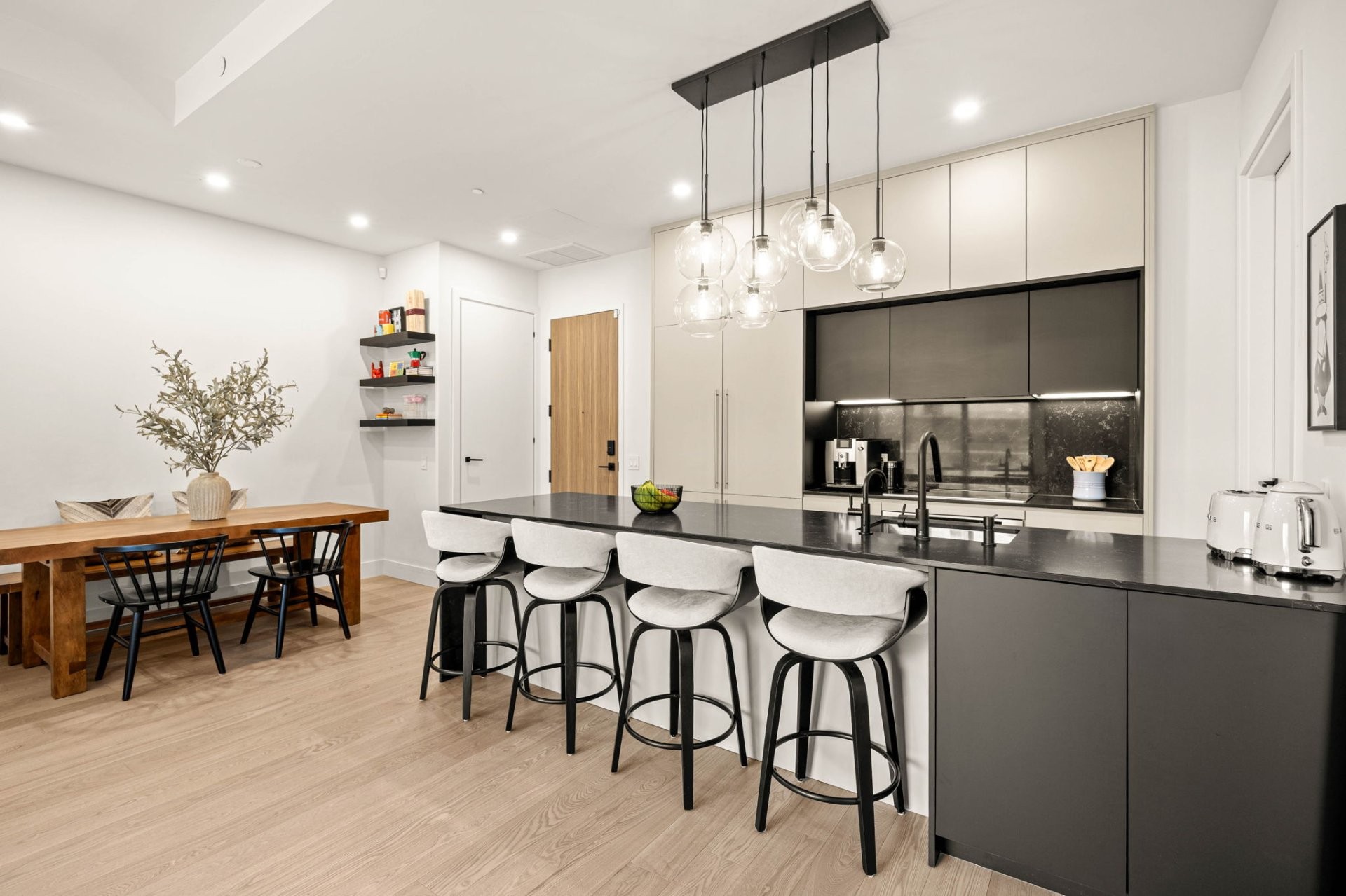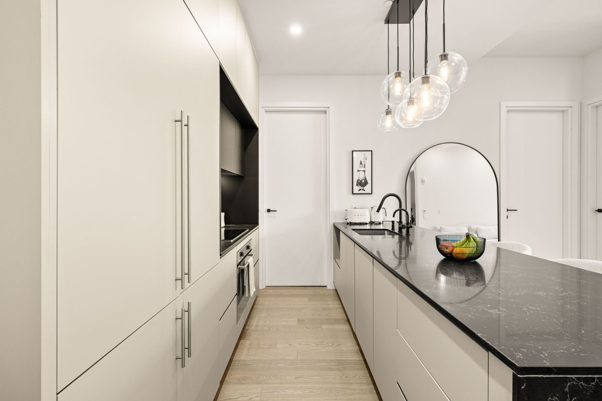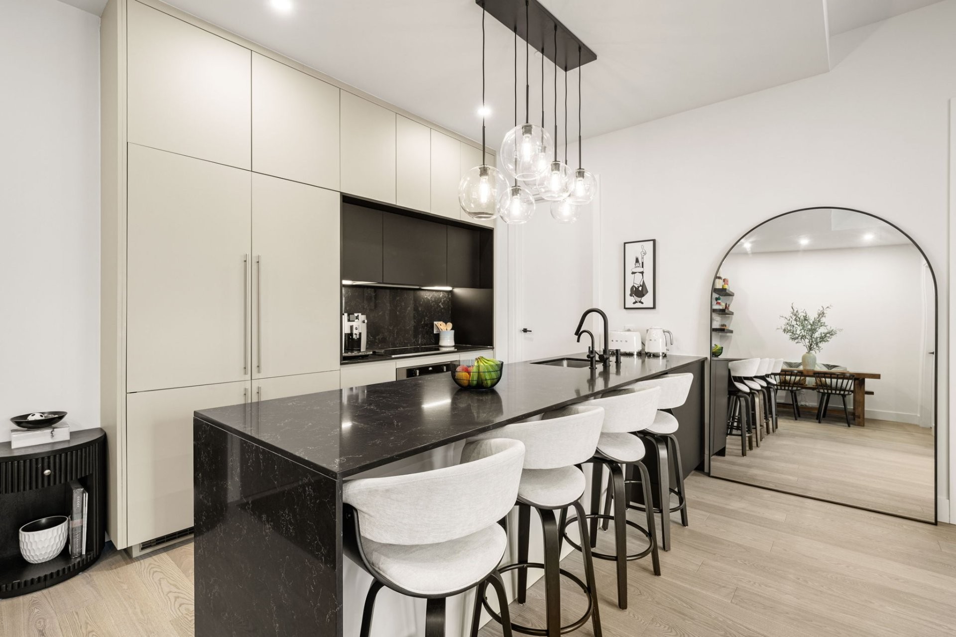 Réfrigérateur, cuisinière, lave-vaisselle, stores électriques, luminaire au-dessus de l'îlot, système de filtration d'eau (évier de cuisine seulement) et distributeur de savon.
