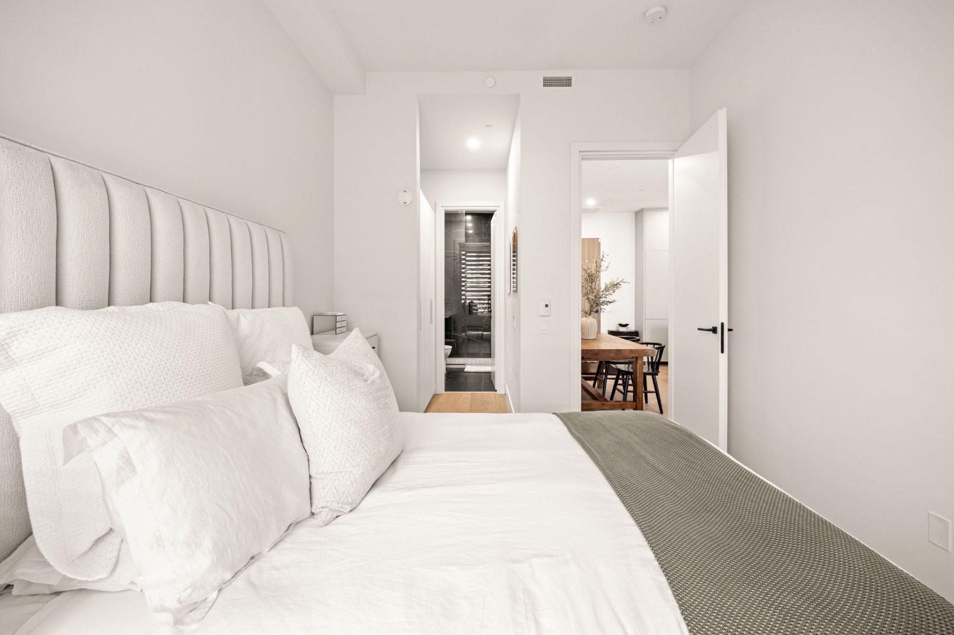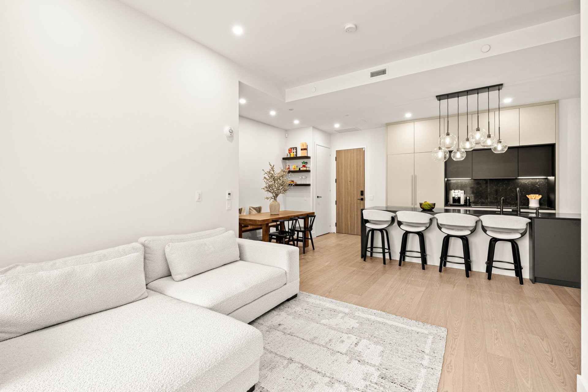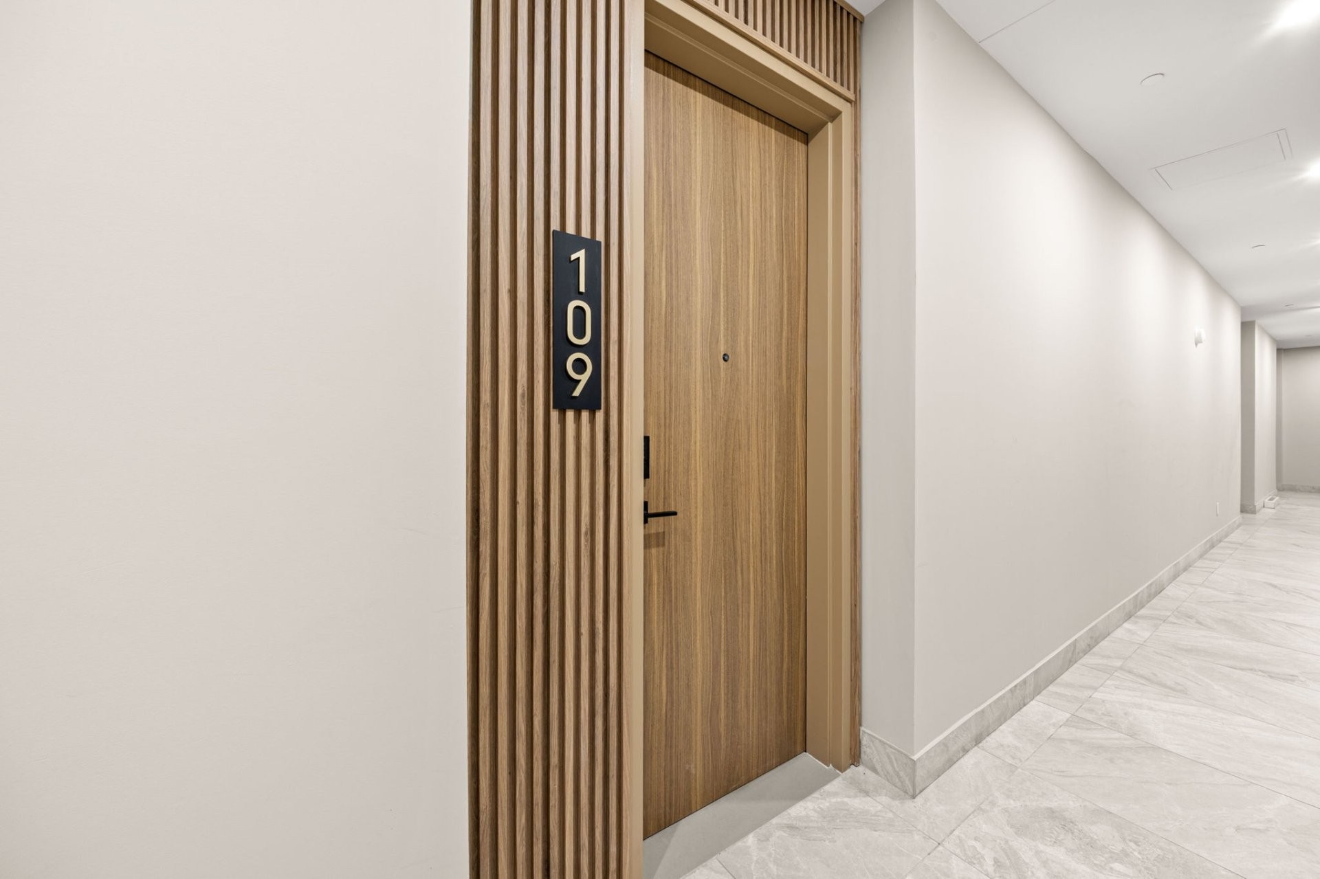 L'unité 109 est un condo lumineux, orienté à l'ouest et doté d'impressionnants plafonds de 11 pieds. Deux chambres à coucher et deux salles de bains, l'espace est à la fois pratique et confortable. La cuisine moderne est équipée d'électroménagers encastrés haut de gamme et d'un grand garde-manger walk-in qui sert également de salle de lavage. Stores électriques et système de filtration d'eau installés à l'évier de cuisine. Profitez de votre balcon privé pour admirer le soleil de l'après-midi, avec une sortie de gaz pour BBQ - la consommation de gaz étant incluse. L'unité comprend également un espace de rangement ainsi que deux stationnement