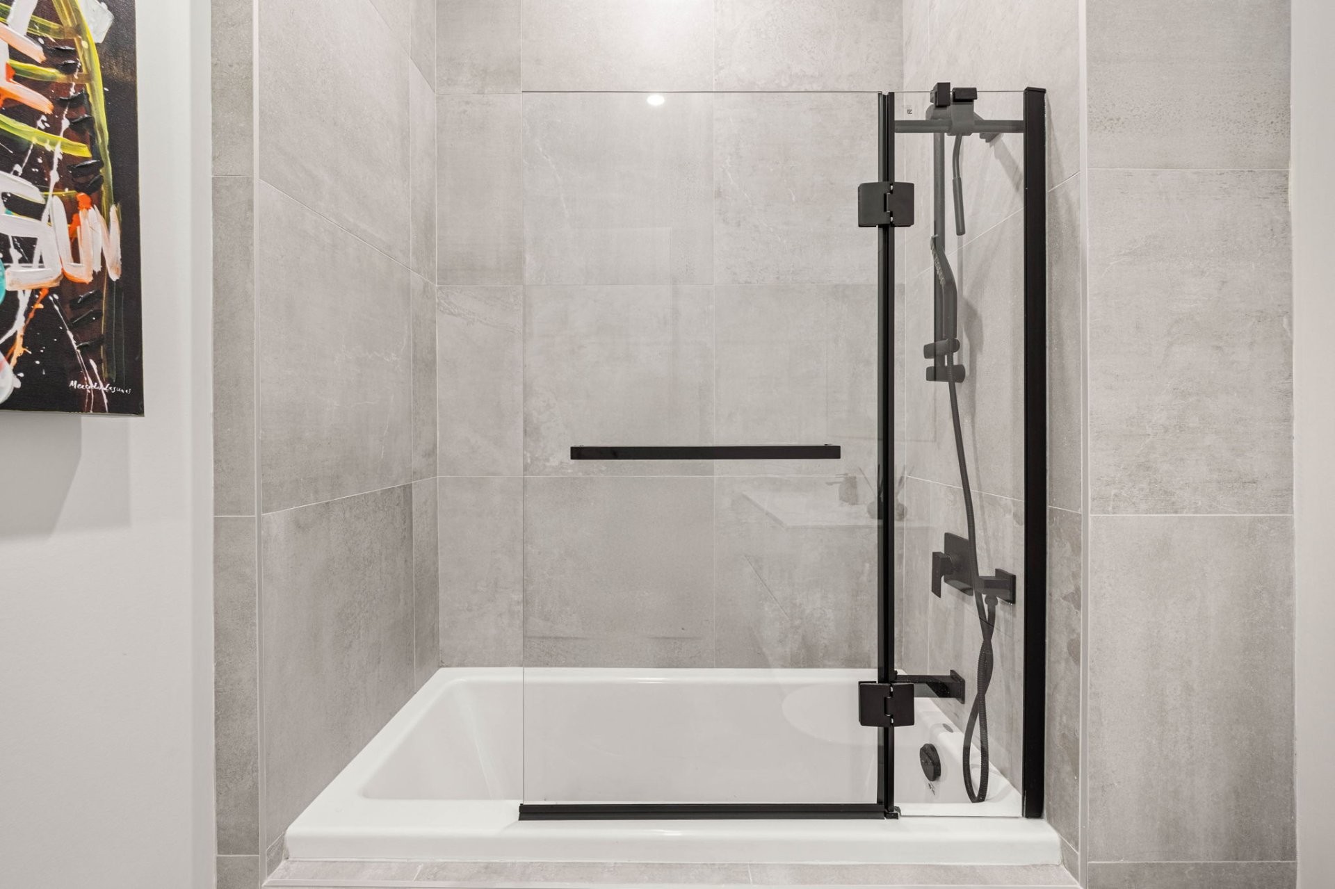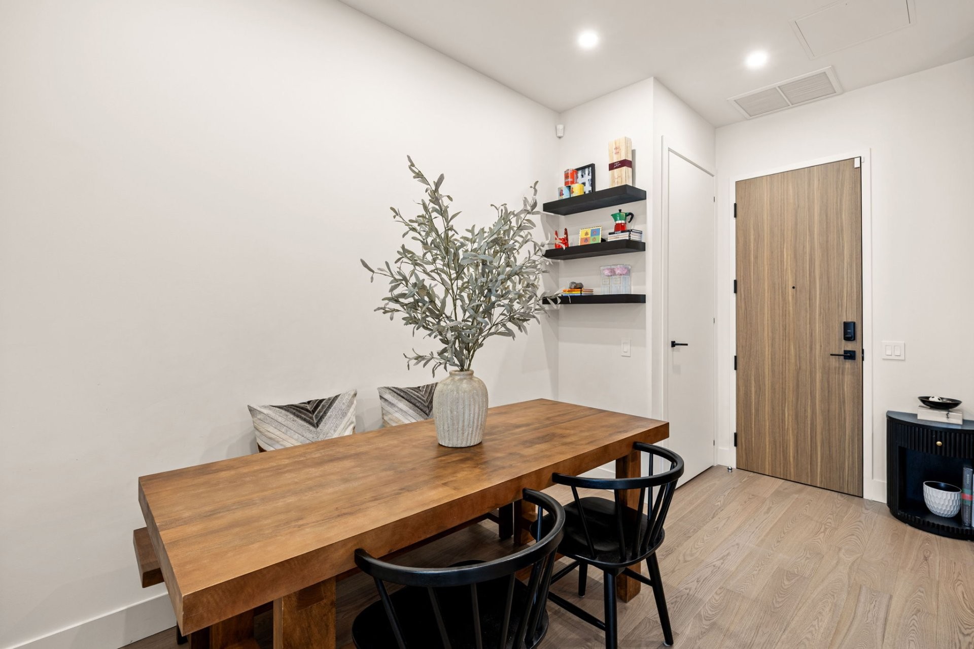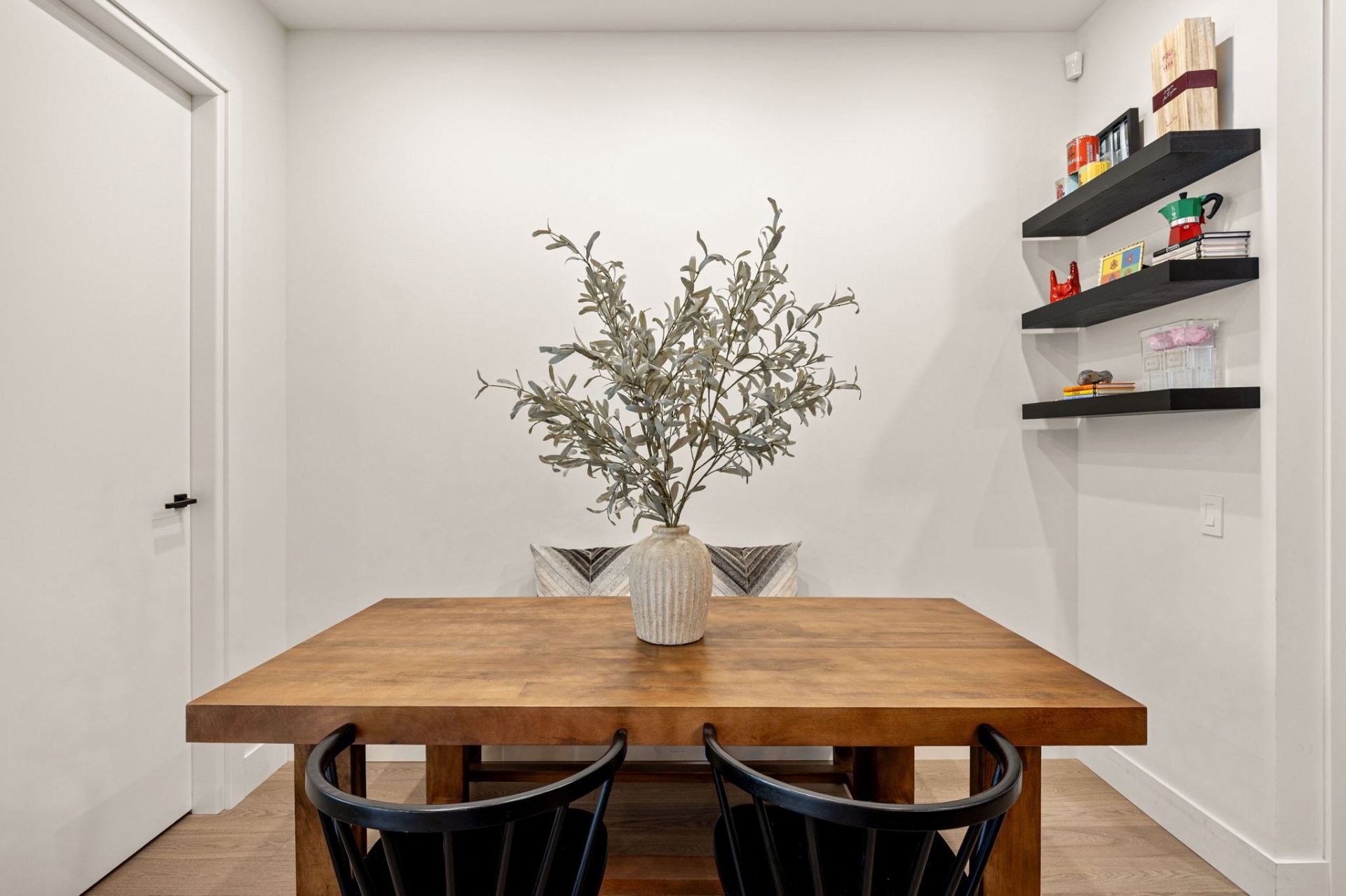 L'unité 109 est un condo lumineux, orienté à l'ouest et doté d'impressionnants plafonds de 11 pieds. Deux chambres à coucher et deux salles de bains, l'espace est à la fois pratique et confortable. La cuisine moderne est équipée d'électroménagers encastrés haut de gamme et d'un grand garde-manger walk-in qui sert également de salle de lavage. Stores électriques et système de filtration d'eau installés à l'évier de cuisine. Profitez de votre balcon privé pour admirer le soleil de l'après-midi, avec une sortie de gaz pour BBQ - la consommation de gaz étant incluse. L'unité comprend également un espace de rangement ainsi que deux stationnement