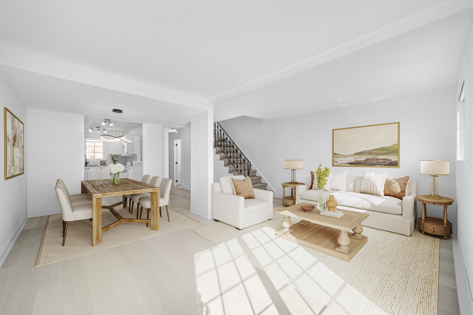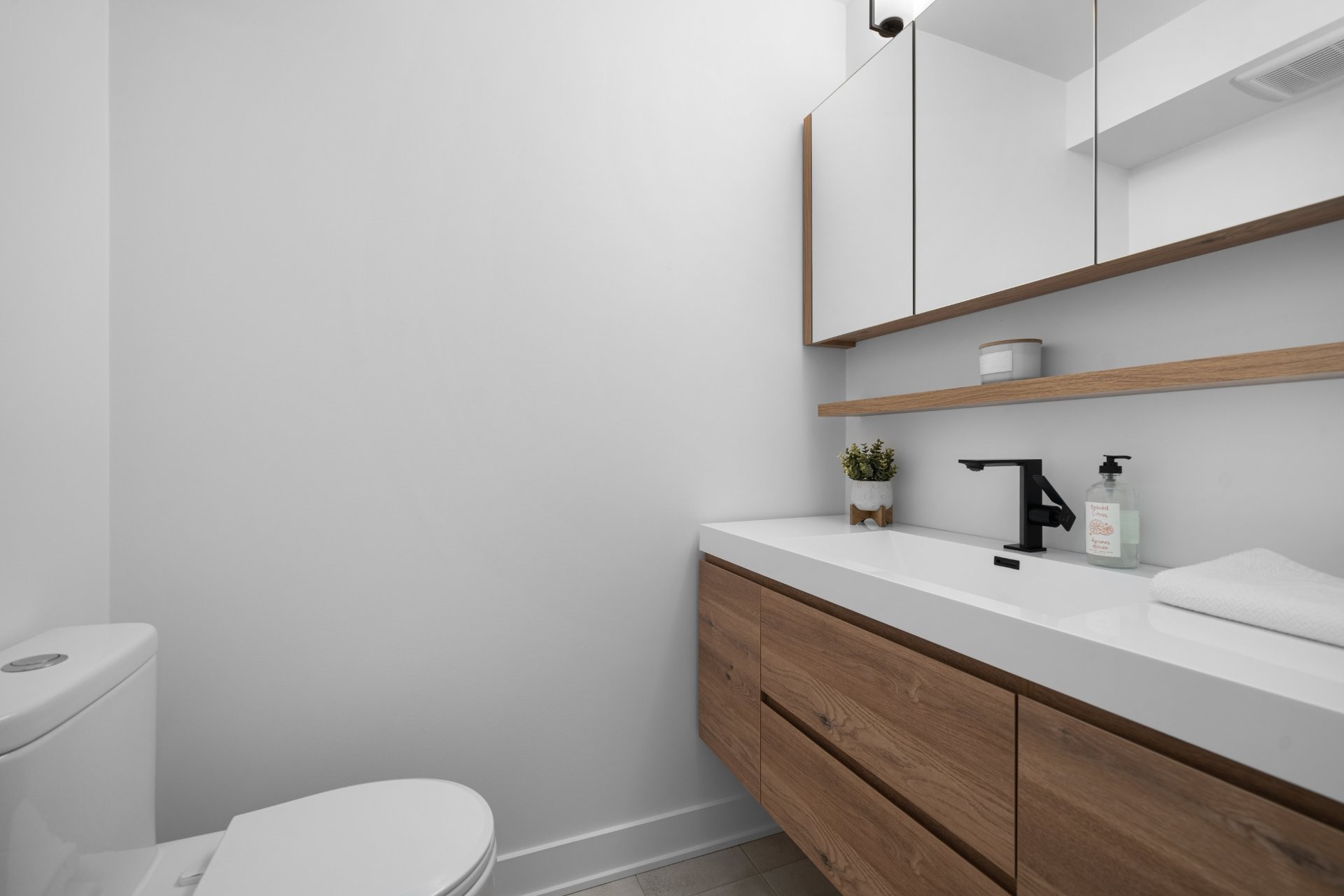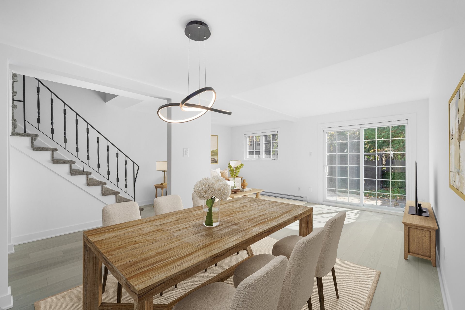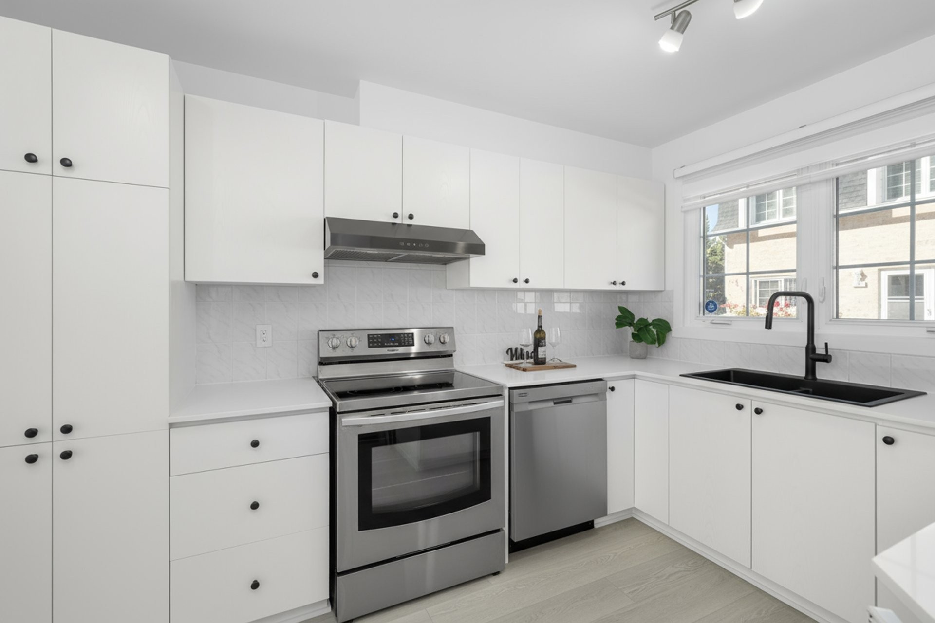 Le rez-de-chaussée offre un espace à aire ouverte accueillant, avec un salon et une salle à manger spacieux, parfaits pour recevoir. La cuisine repensée se distingue par ses élégants comptoirs en quartz et son vaste espace de rangement, tandis que les grandes fenêtres inondent la pièce de lumière naturelle. Depuis l'aire de vie, accédez à votre cour arrière privée orientée sud, entièrement clôturée -- idéale pour se détendre ou recevoir famille et amis. Une élégante salle d'eau se trouve également à proximité de l'entrée.