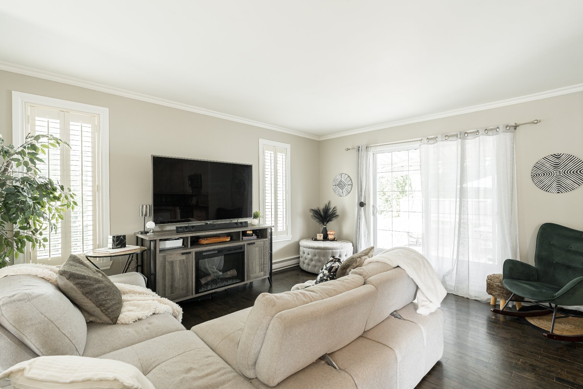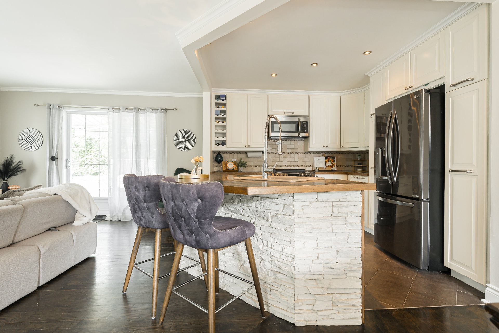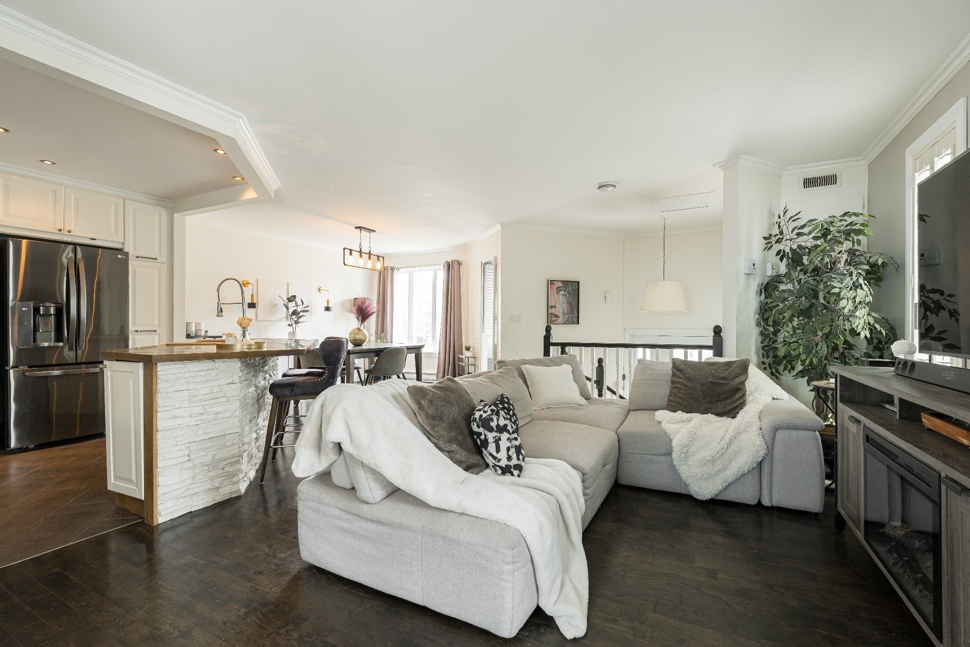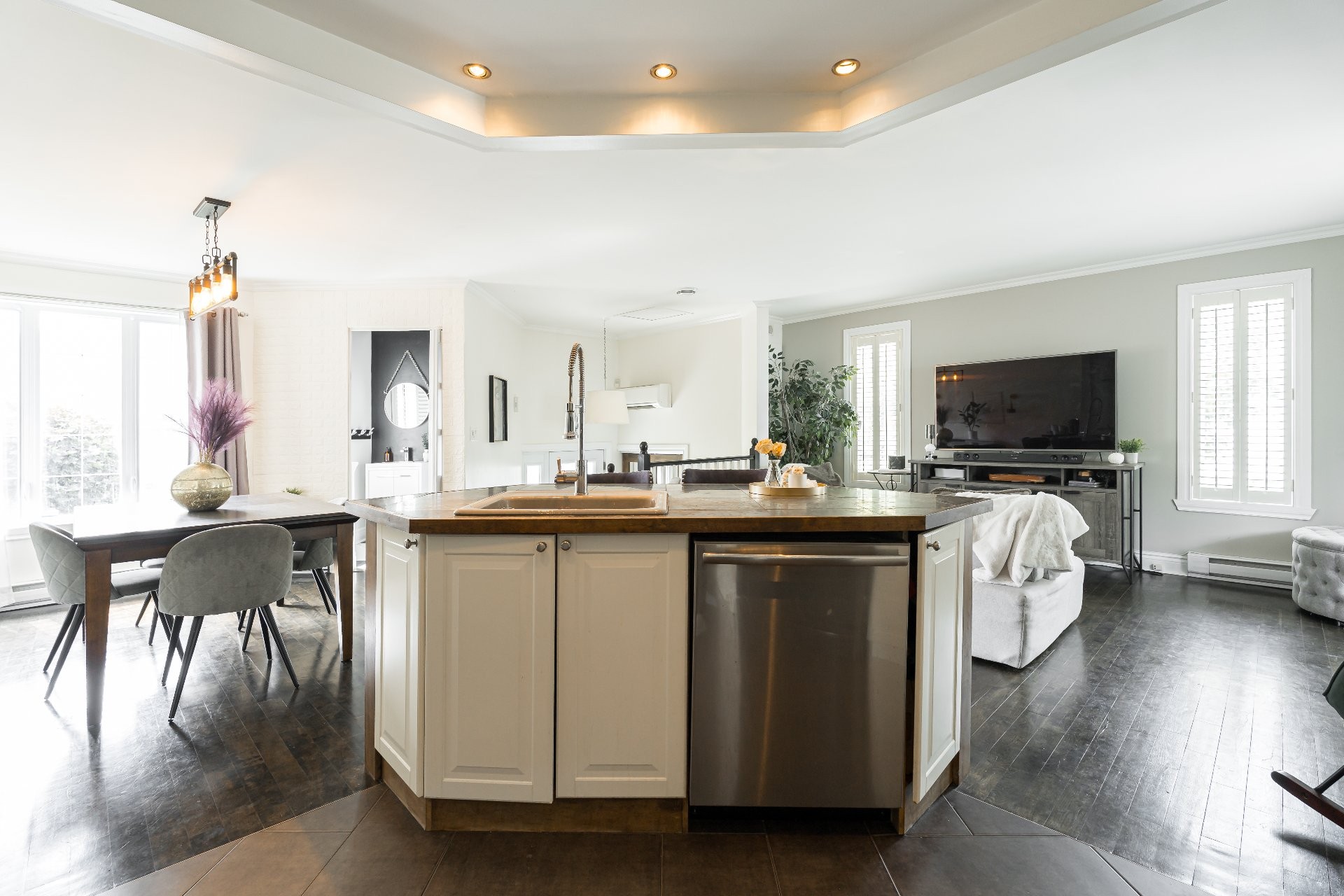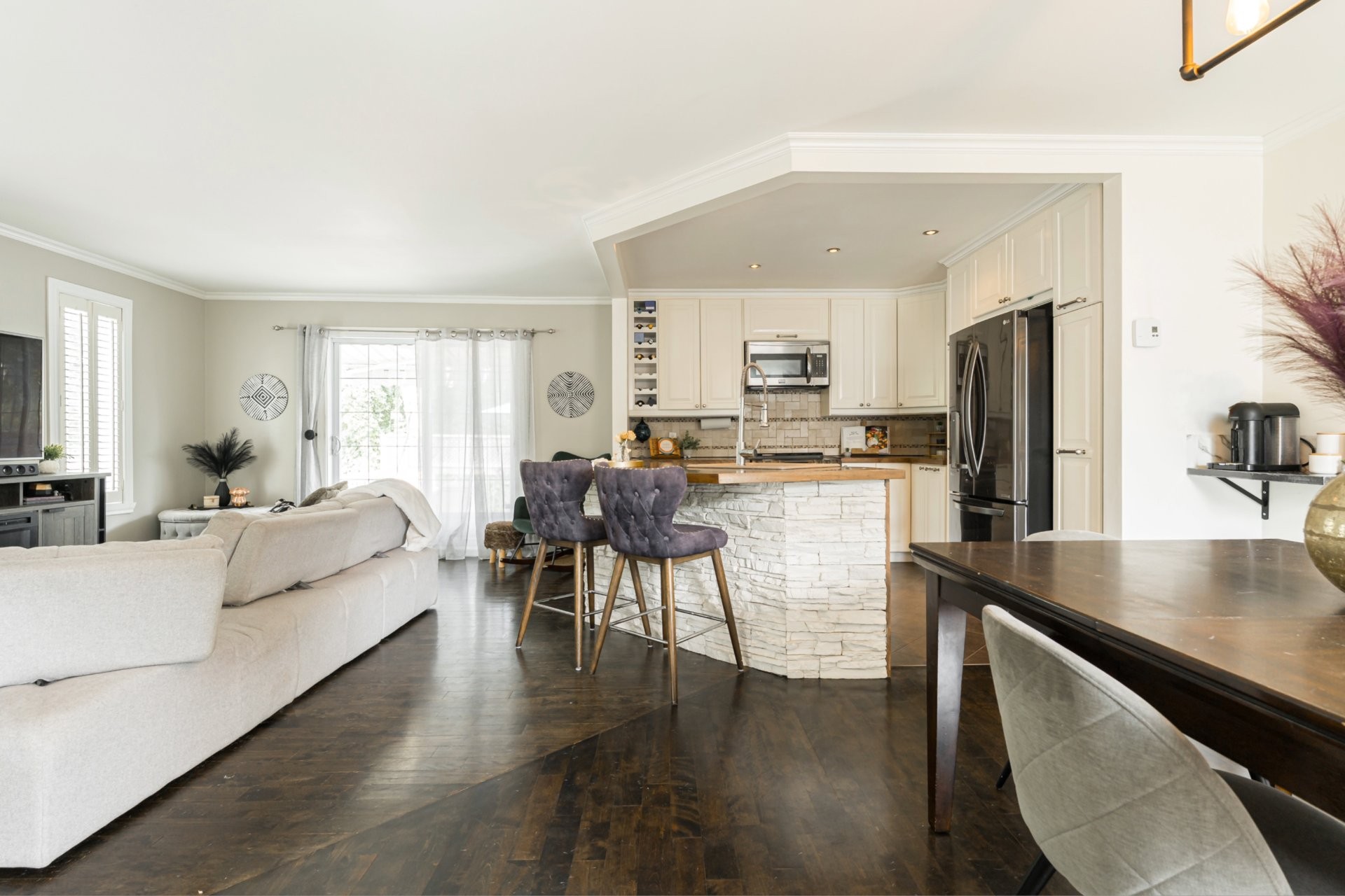 L'espace de vie principal comprend un salon, une salle à manger et une cuisine baignés de lumière naturelle grâce à de grandes fenêtres et une porte patio.