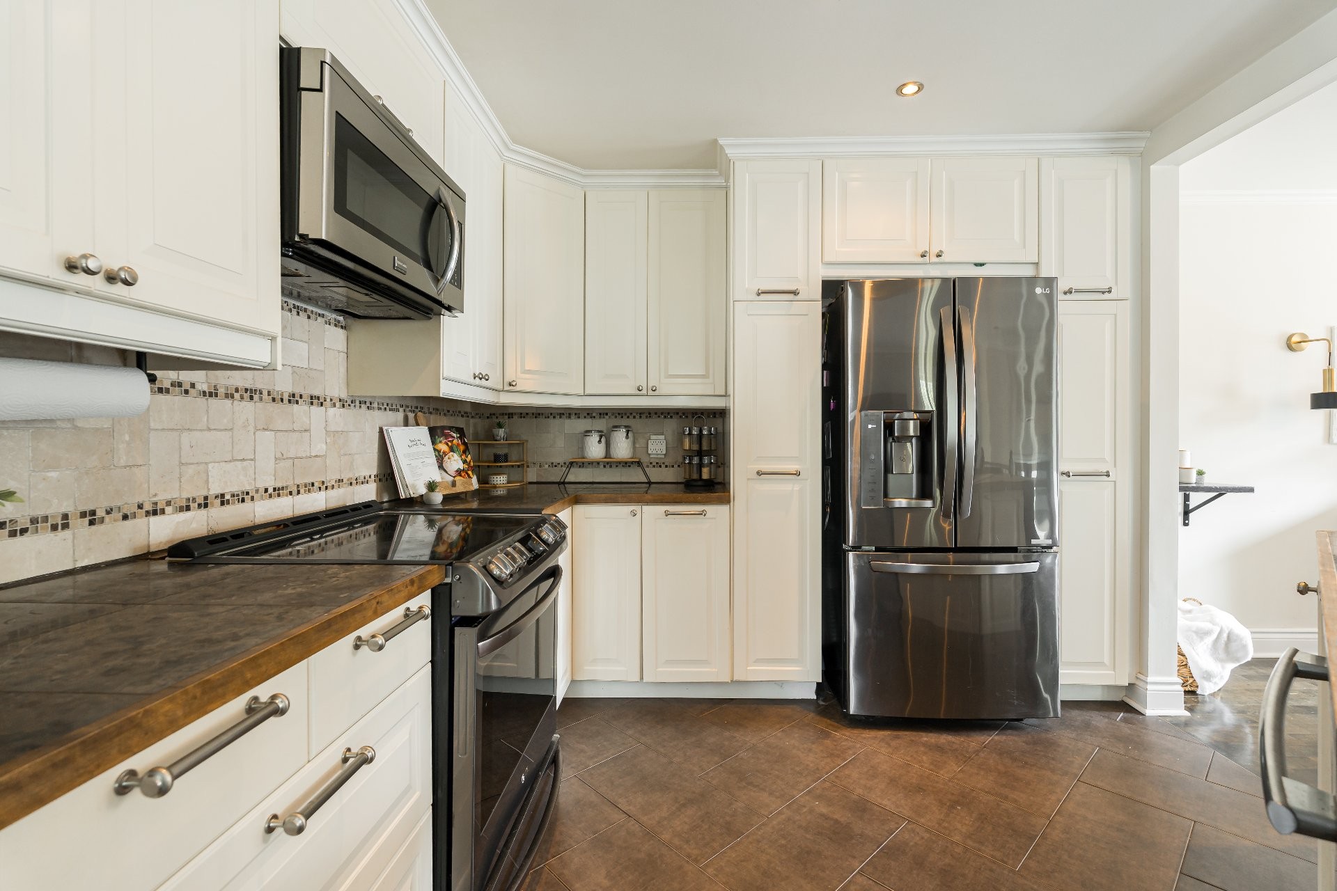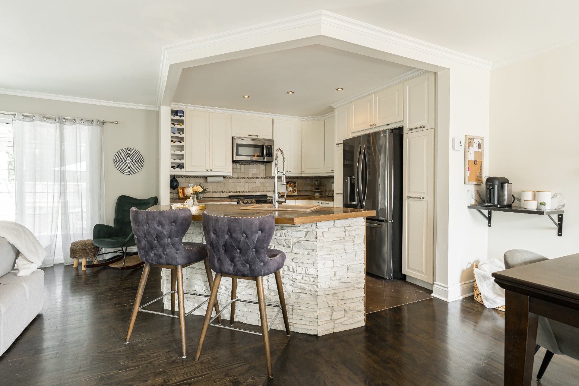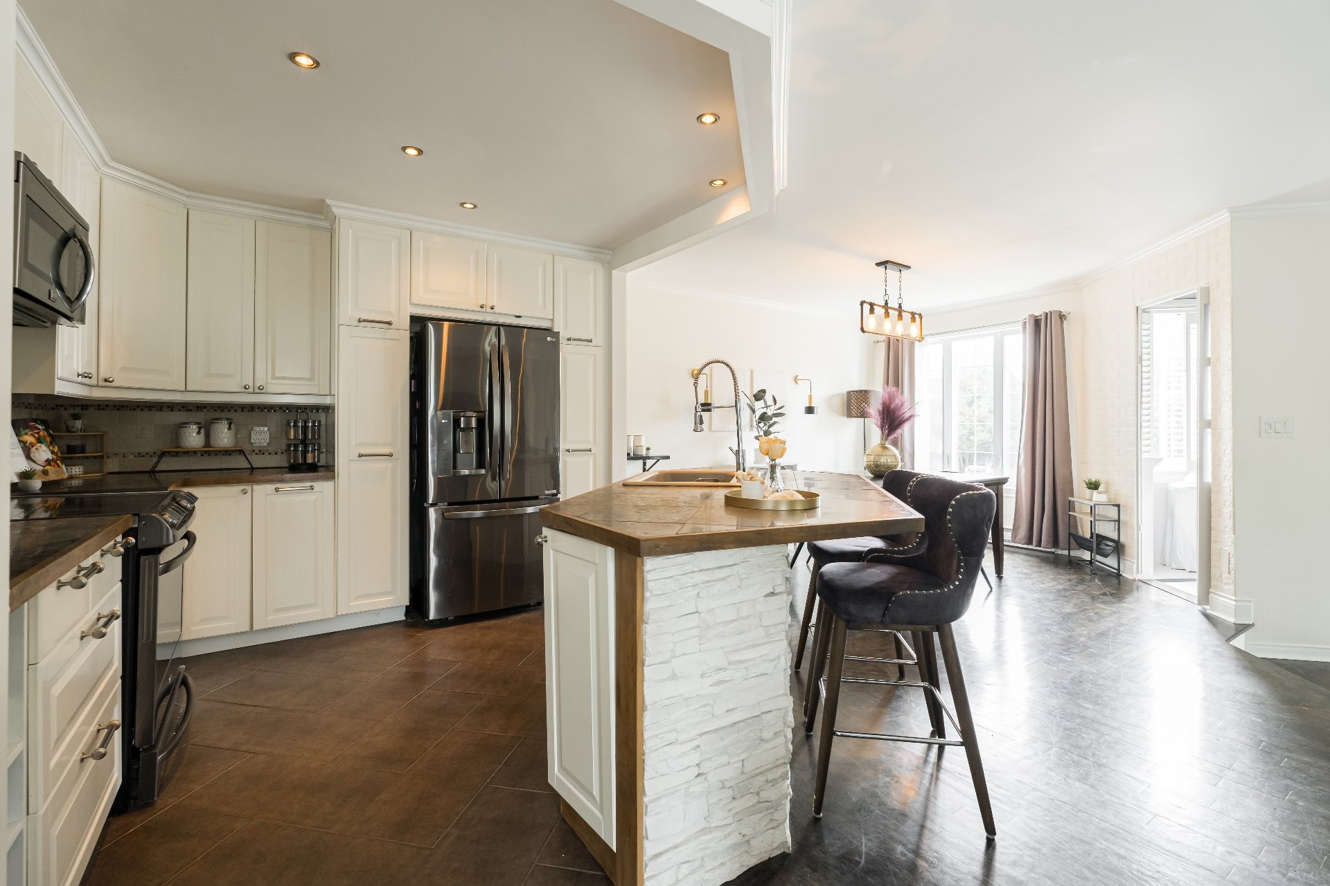 La cuisine impressionnante est dotée d'armoires d'un blanc doux et d'un îlot central avec des places assises. Parfait pour recevoir vos invités, avec de considérable espace de rangement et un vaste surface de travail pour vos activités culinaires.