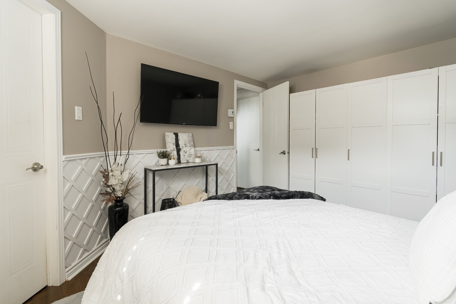 - Chambre principale avec garde-robe walk-in et boiseries décoratives apportant une touche d'élégance