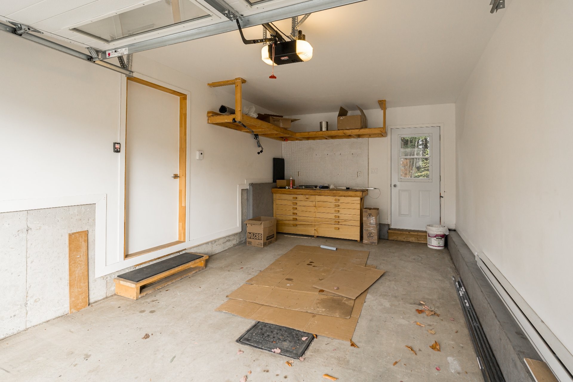 Refrigerator, stove, washer, dryer, blinds, light fixtures, central vacuum and accessories, garage door opener and work bench in the garage.
