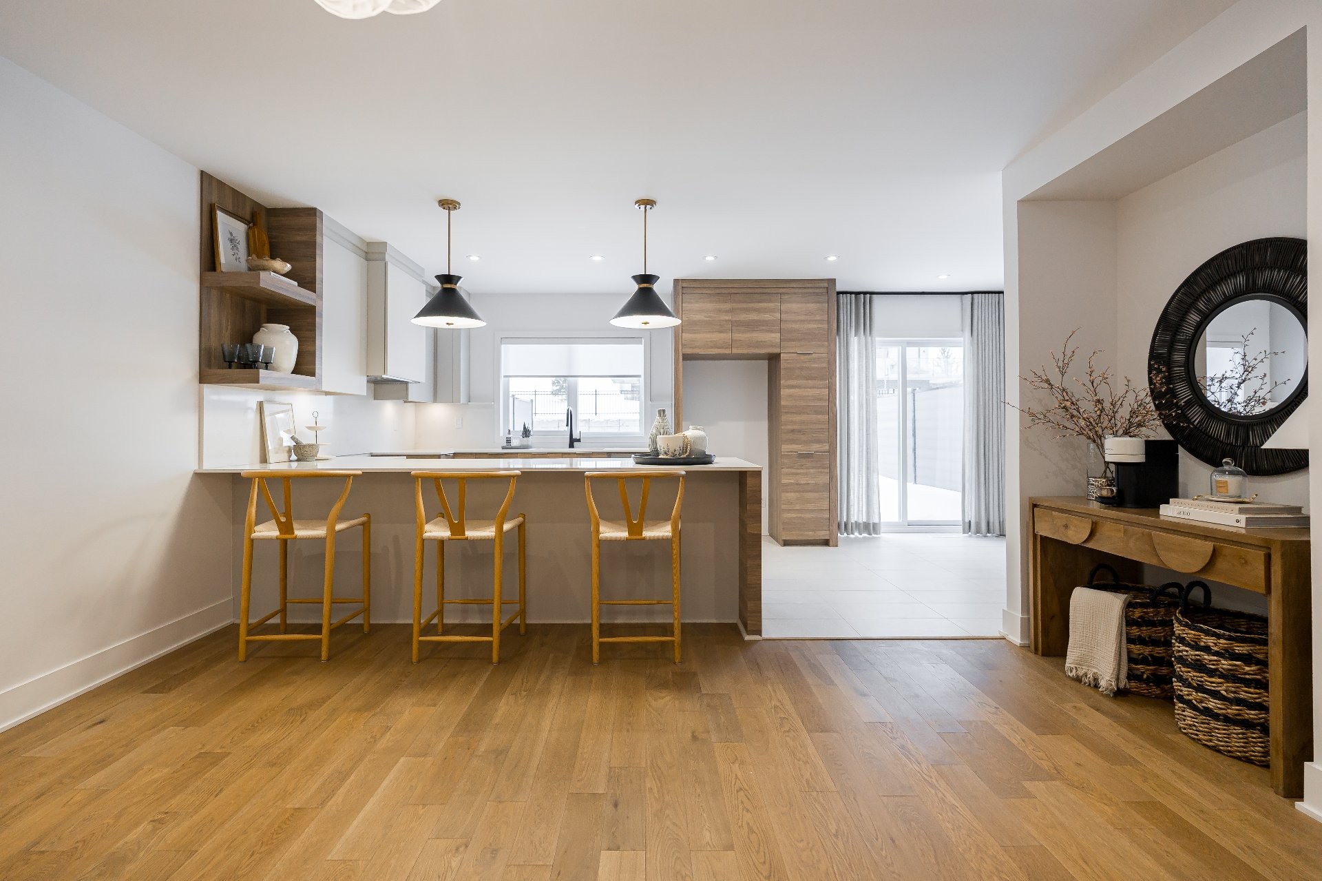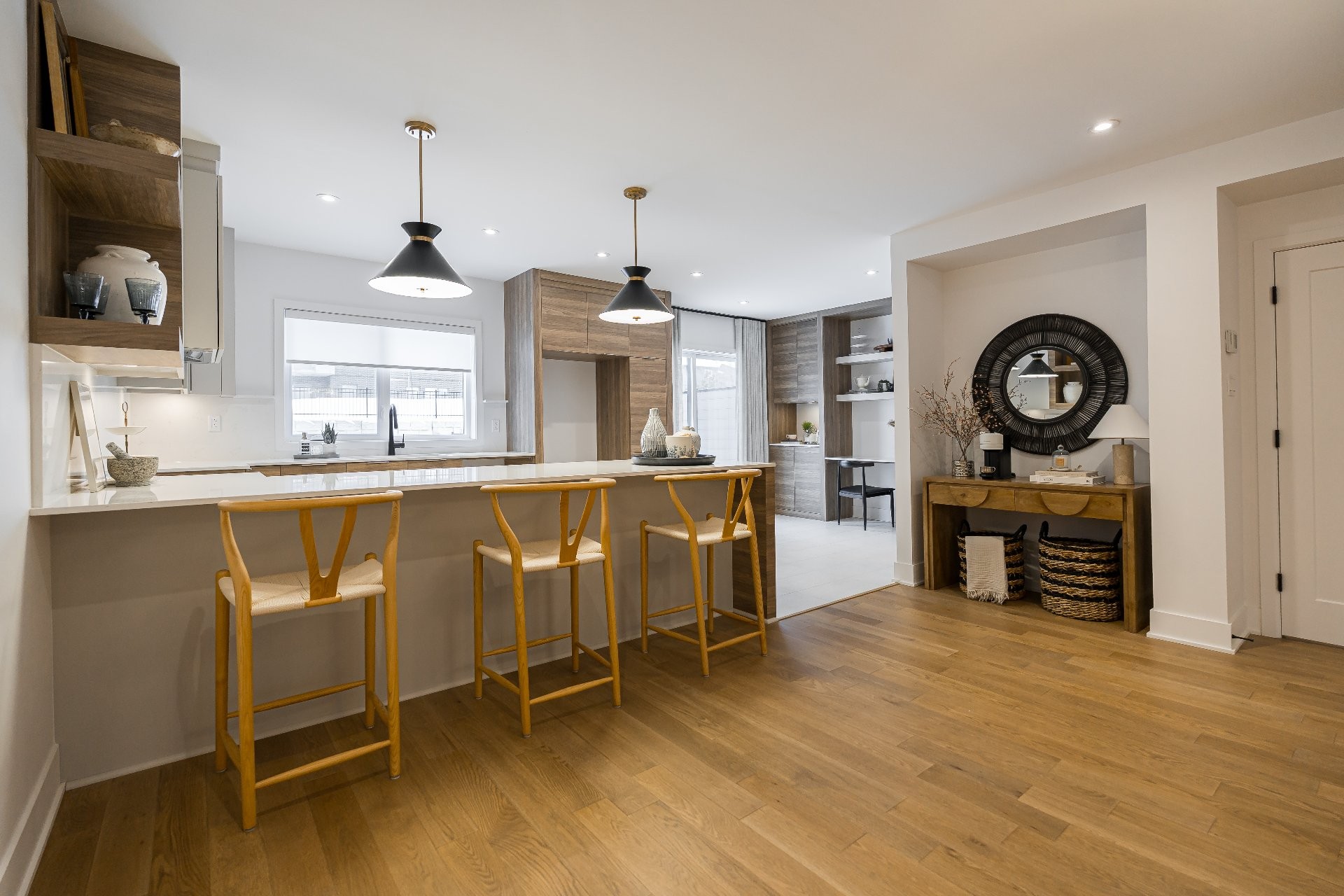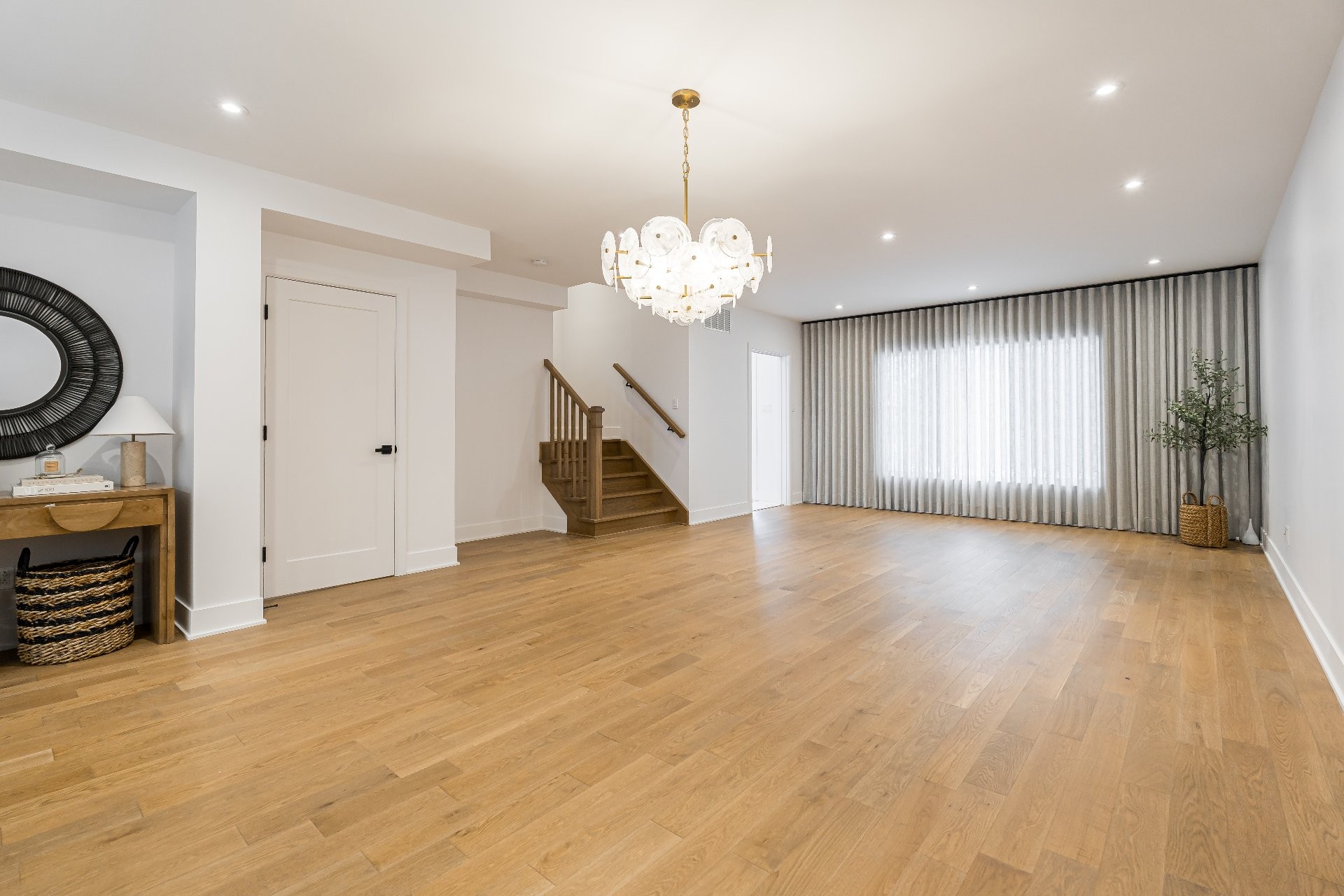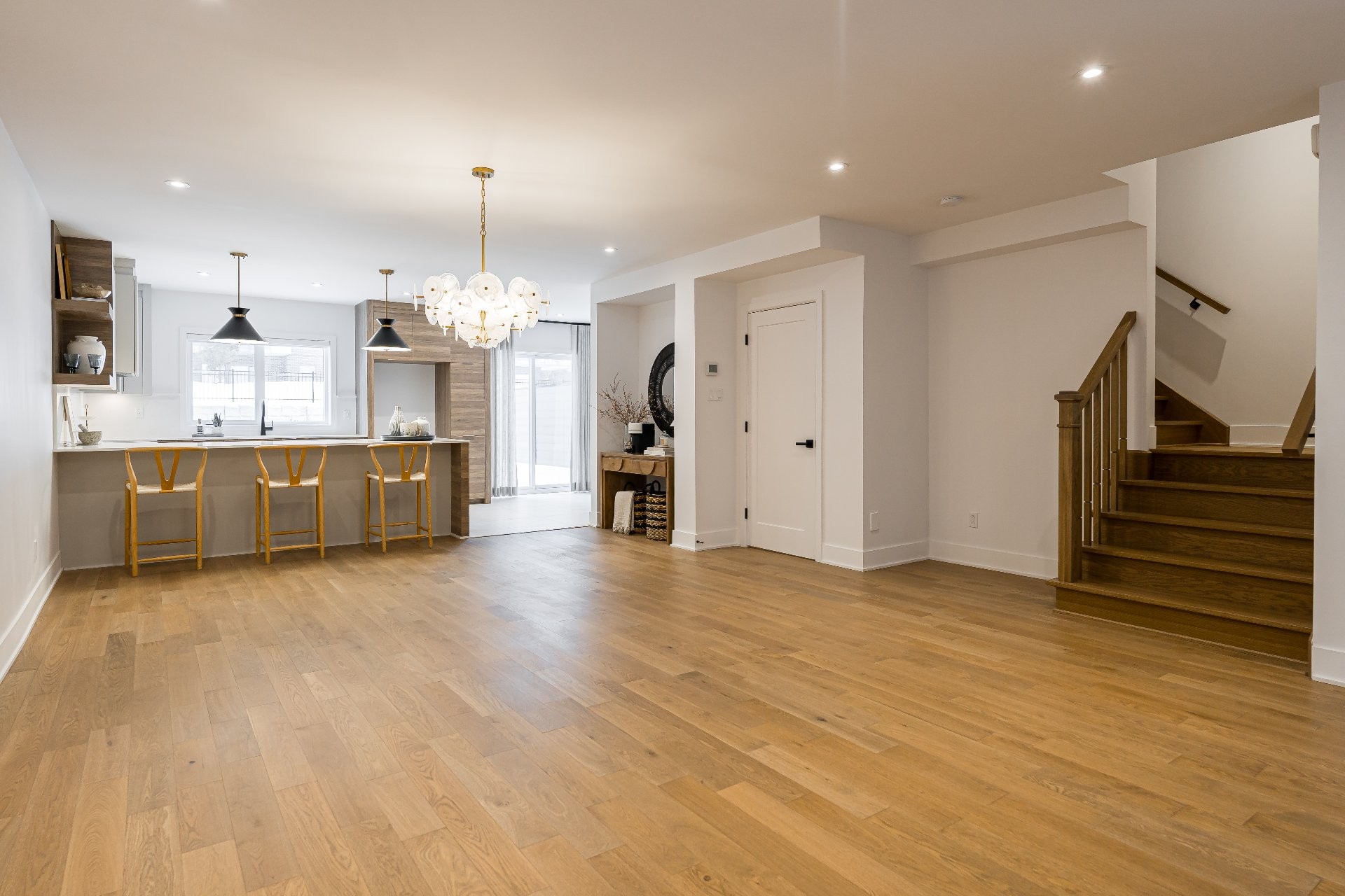 - Plancher contemporain en chêne d'ingénierie, planches larges (7.5") aux niveaux principal, nivaux des chambres et sous-sol.