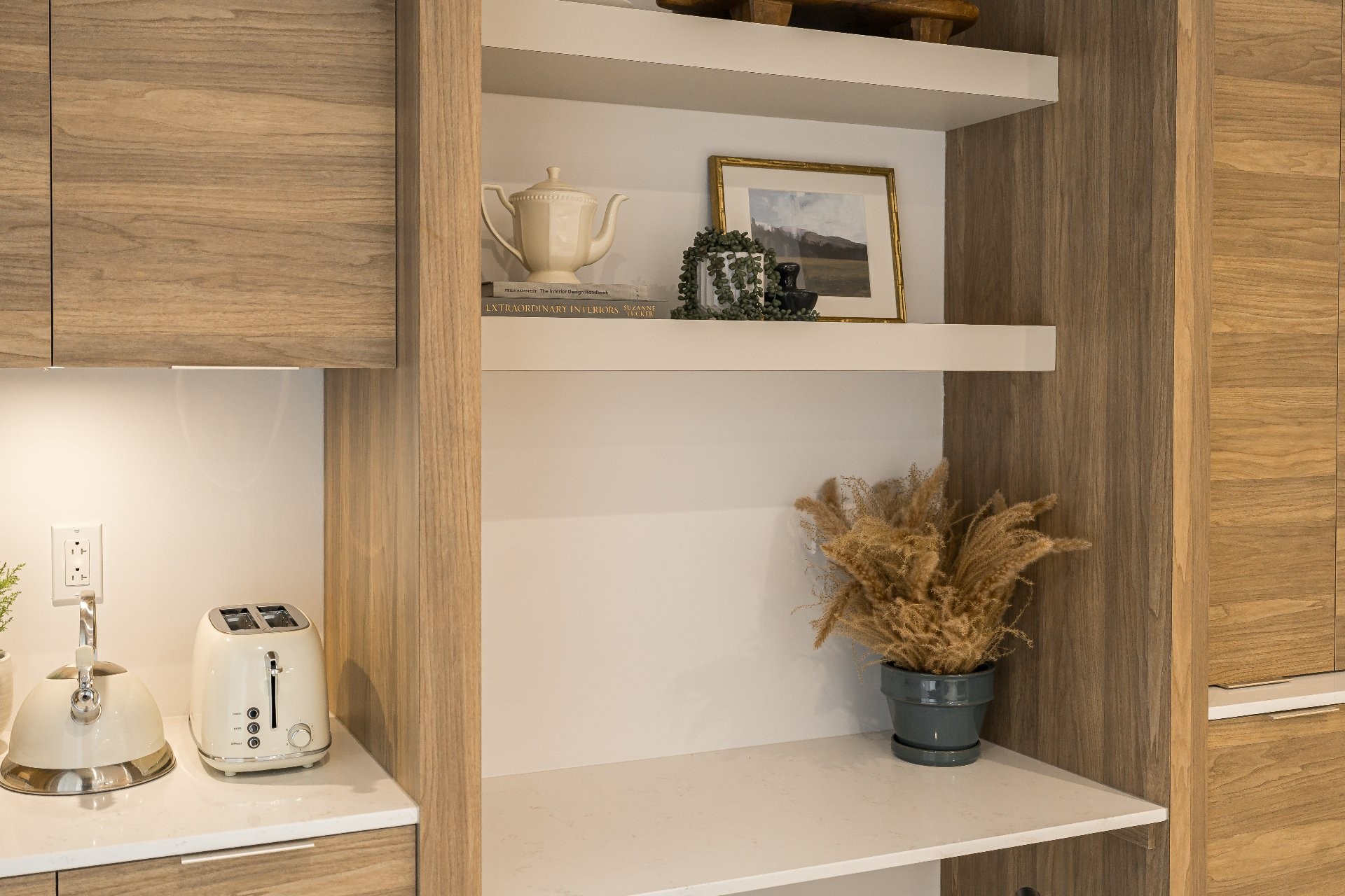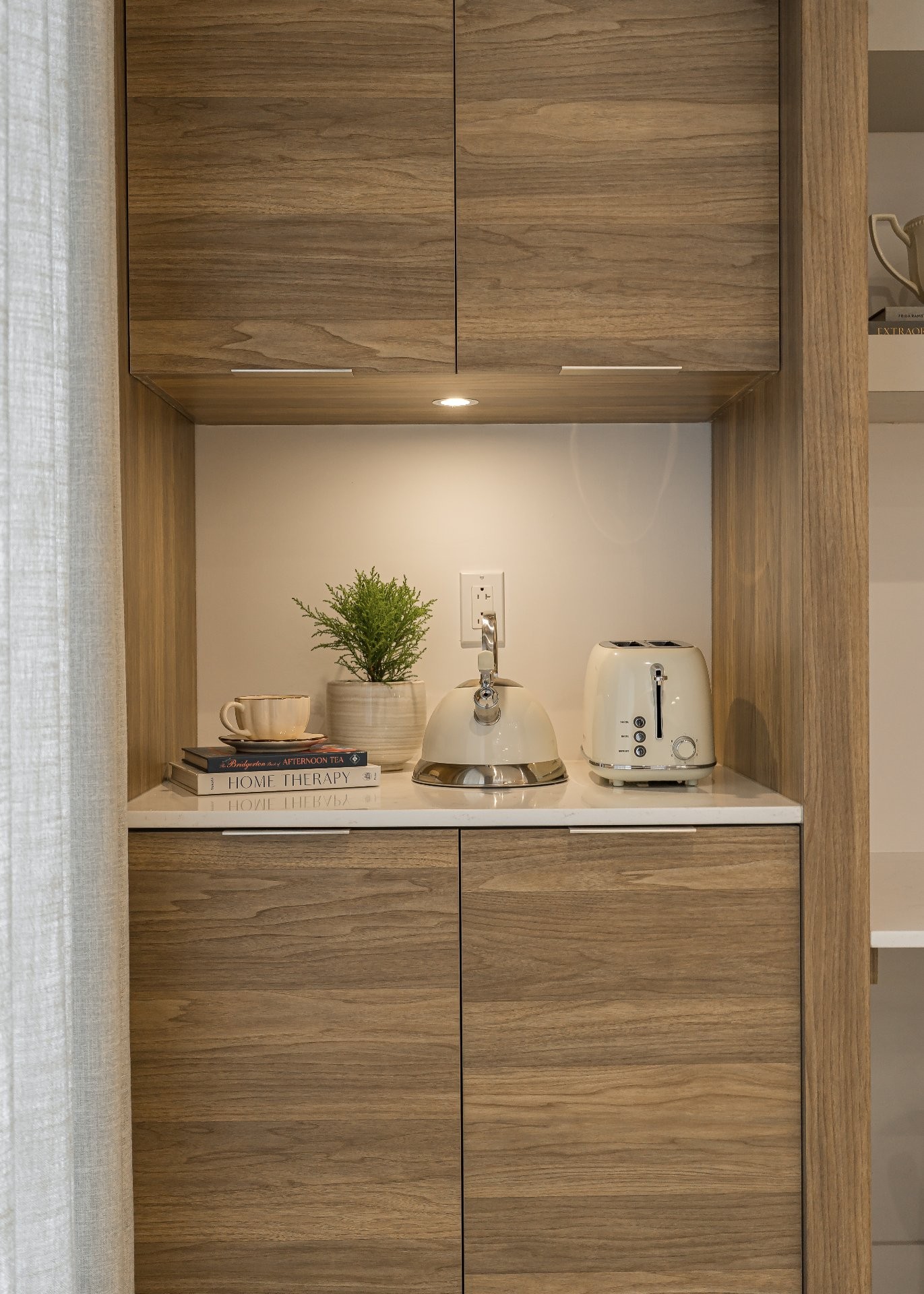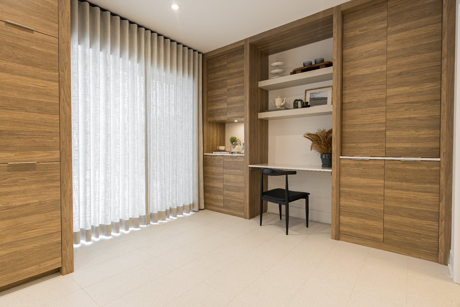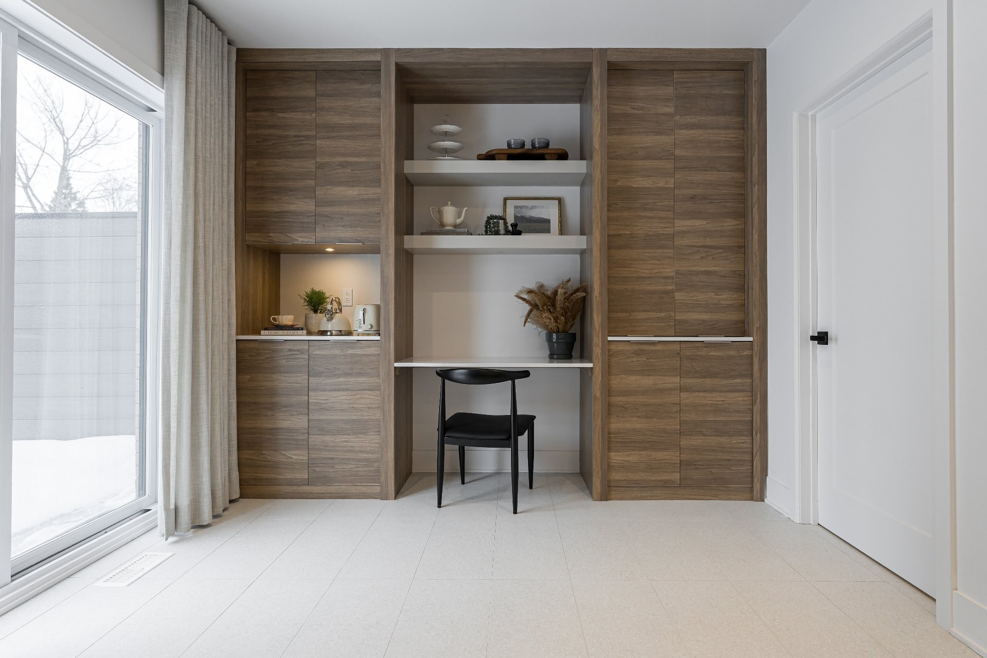 - Un élégant coin bureau intégré mur à mur est une extension de la cuisine, avec rangement fermé, étagères ouvertes et éclairage intégré. Accès patio à l'arrière-cour.