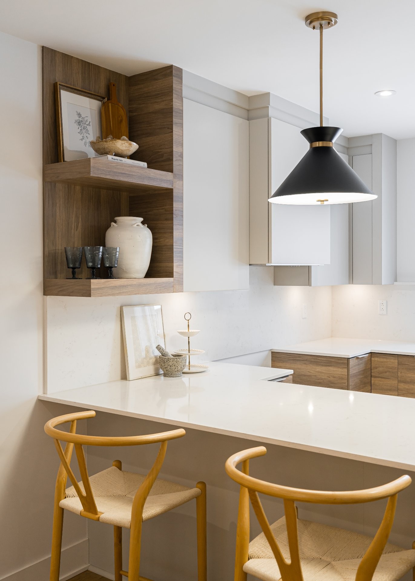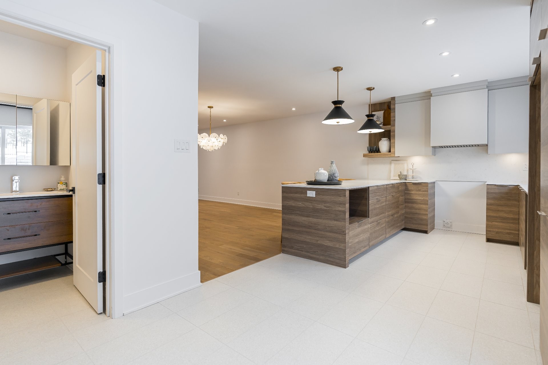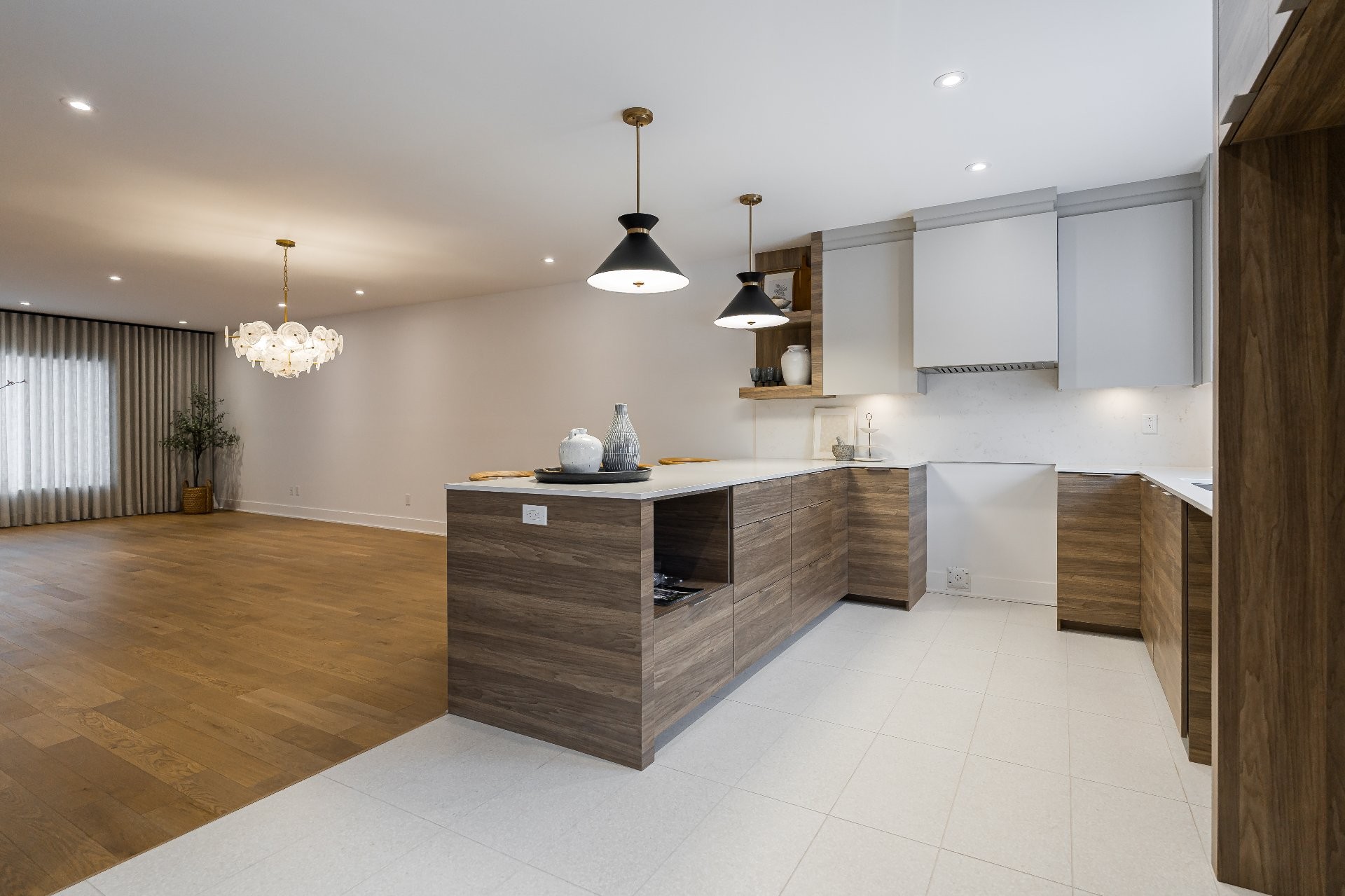 - La cuisine spacieuse impressionne par la combinaison de différentes textures avec des finitions neutres contemporaires. Comptoirs en quartz qui s'intègrent parfaitement avec le dosseret en dalle de quartz (facile à nettoyer et visuellement attrayant). Armoires deux tons qui s'étendent jusqu'au plafond, avec éclairage sous-armoire. Espace à manger au comptoir pour 4 personnes, et lignes de vue directes sur la salle à manger et le salon.