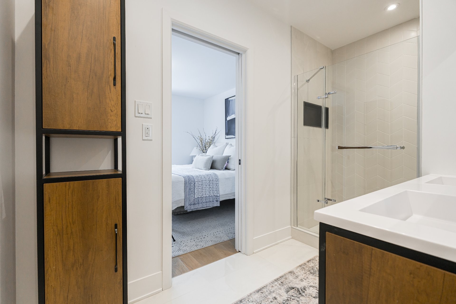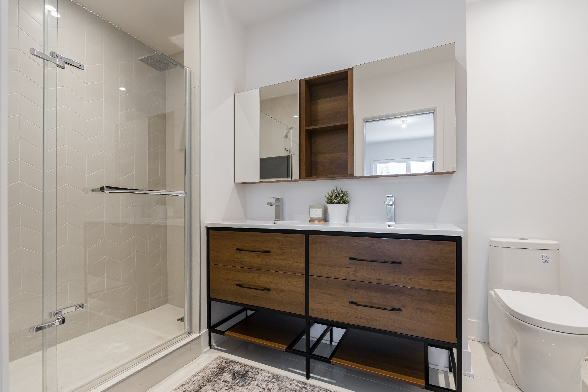 - A l'étage, la chambre principale est dotée d'une salle de bain privative avec douche en céramique indépendante et vanité à double lavabo, et garde-robe walk-in impressionante.