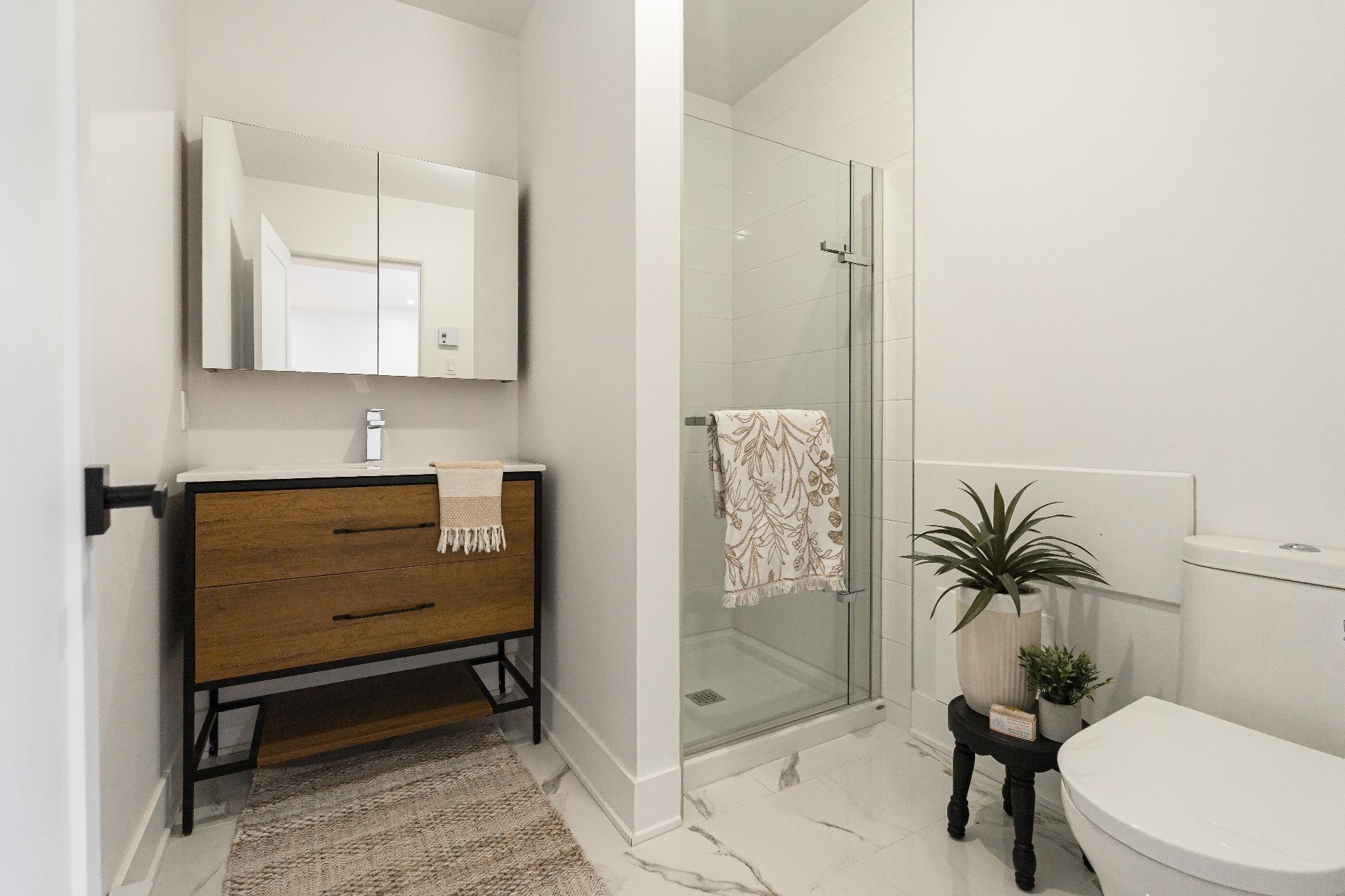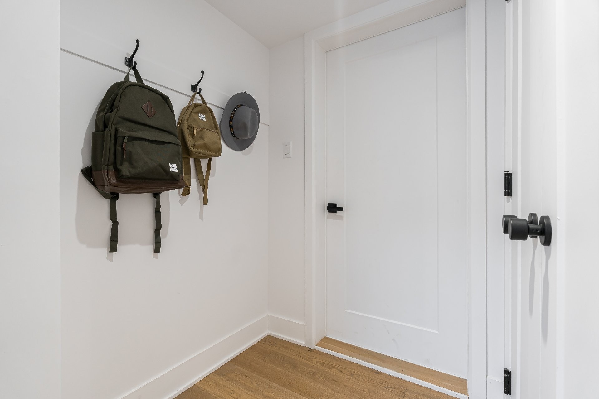 - Sous-sol avec salle de jeu, salle de bain complète, et "drop zone" comprenant une garde-robe d'entrée walk-in, donnant un accès direct au garage privé pour 2 voitures avec évier utilitaire et robinet d'arrosage.