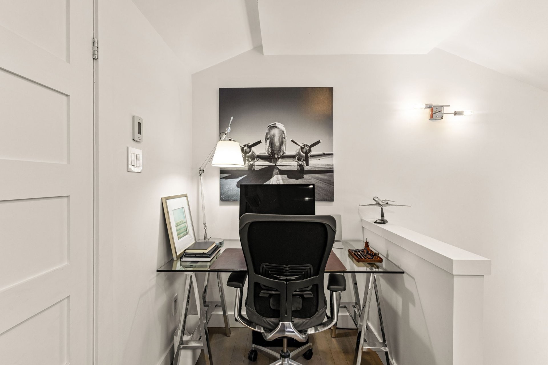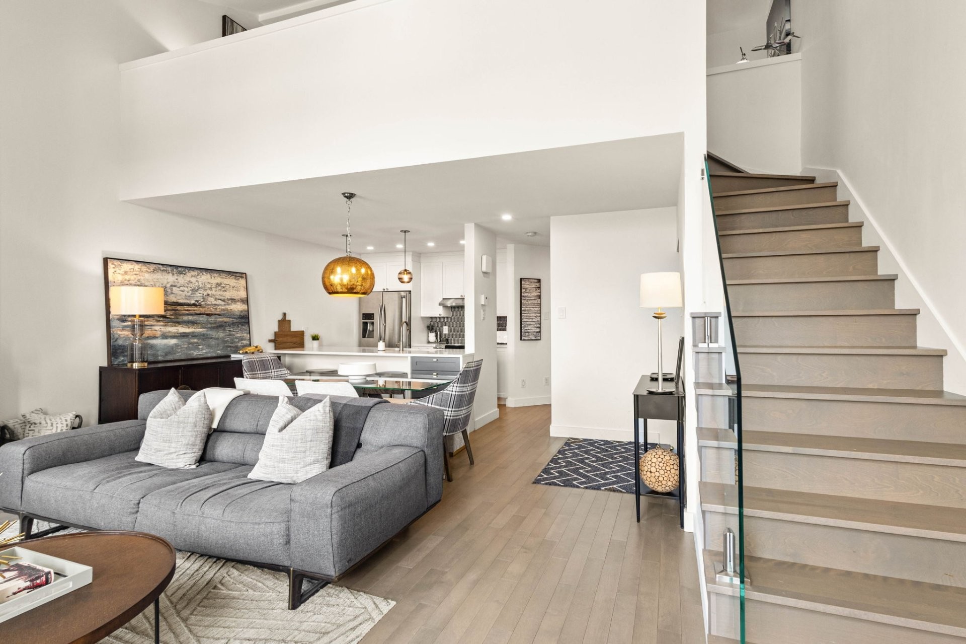- Rampe en verre le long de l'escalier menant à la mezzanine