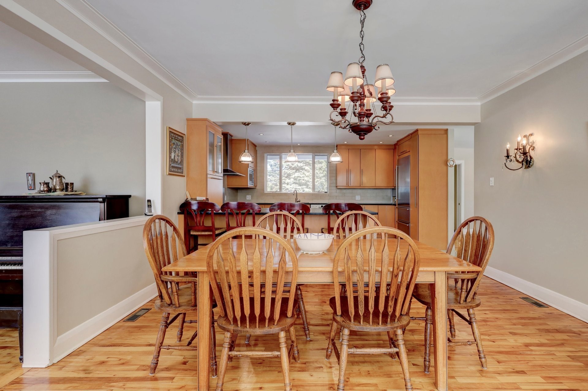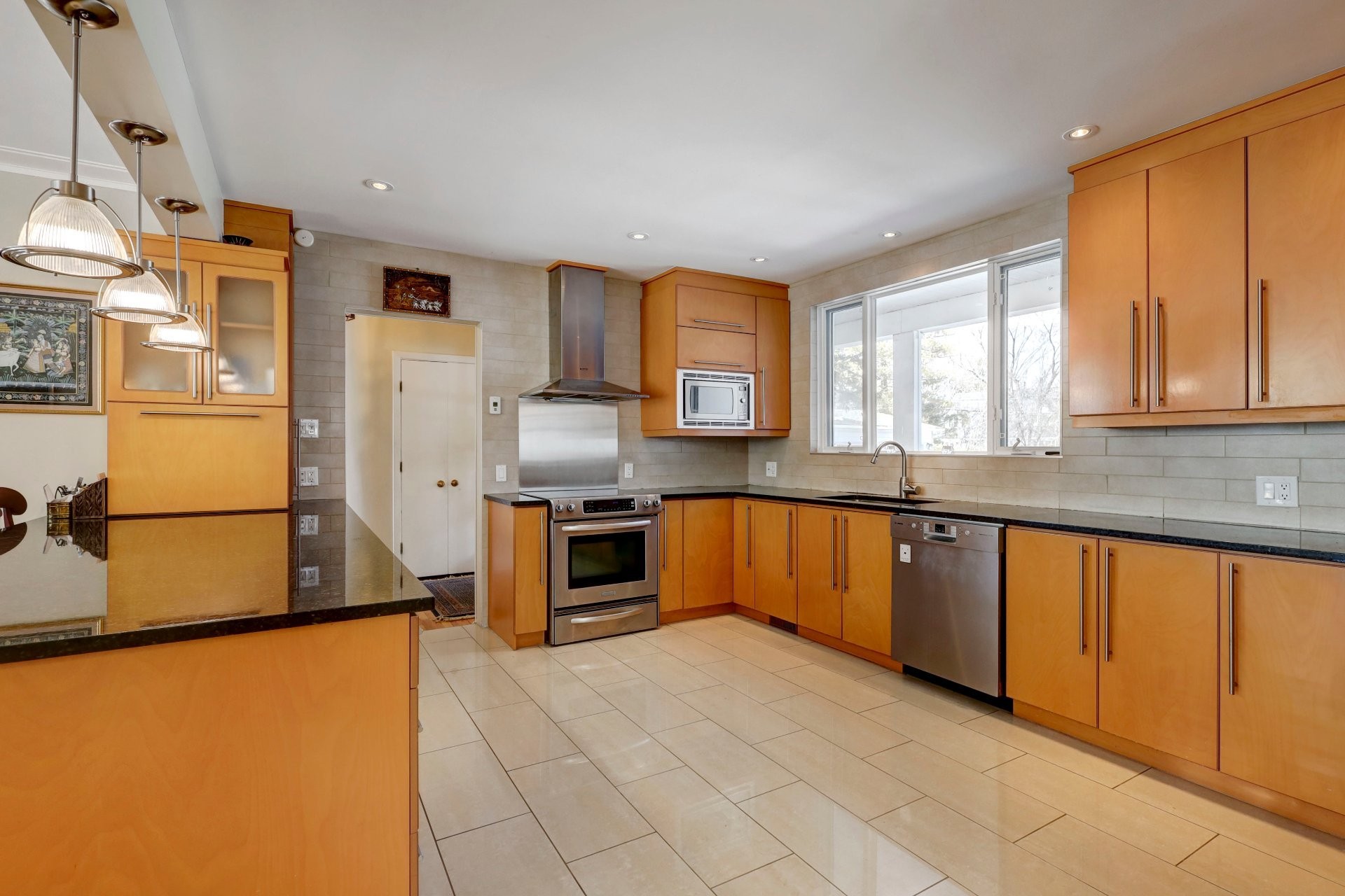 Distinctif par son design, la maison dispose d'une grande cuisine avant avec des armoires abondantes et des comptoirs en granit, surplombant la dinette et la véranda. La dinette spacieuse est baignée de lumière naturelle et s'ouvre sur la véranda orientée sud, avec une porte-patio menant aux magnifiques jardins paysagers.
