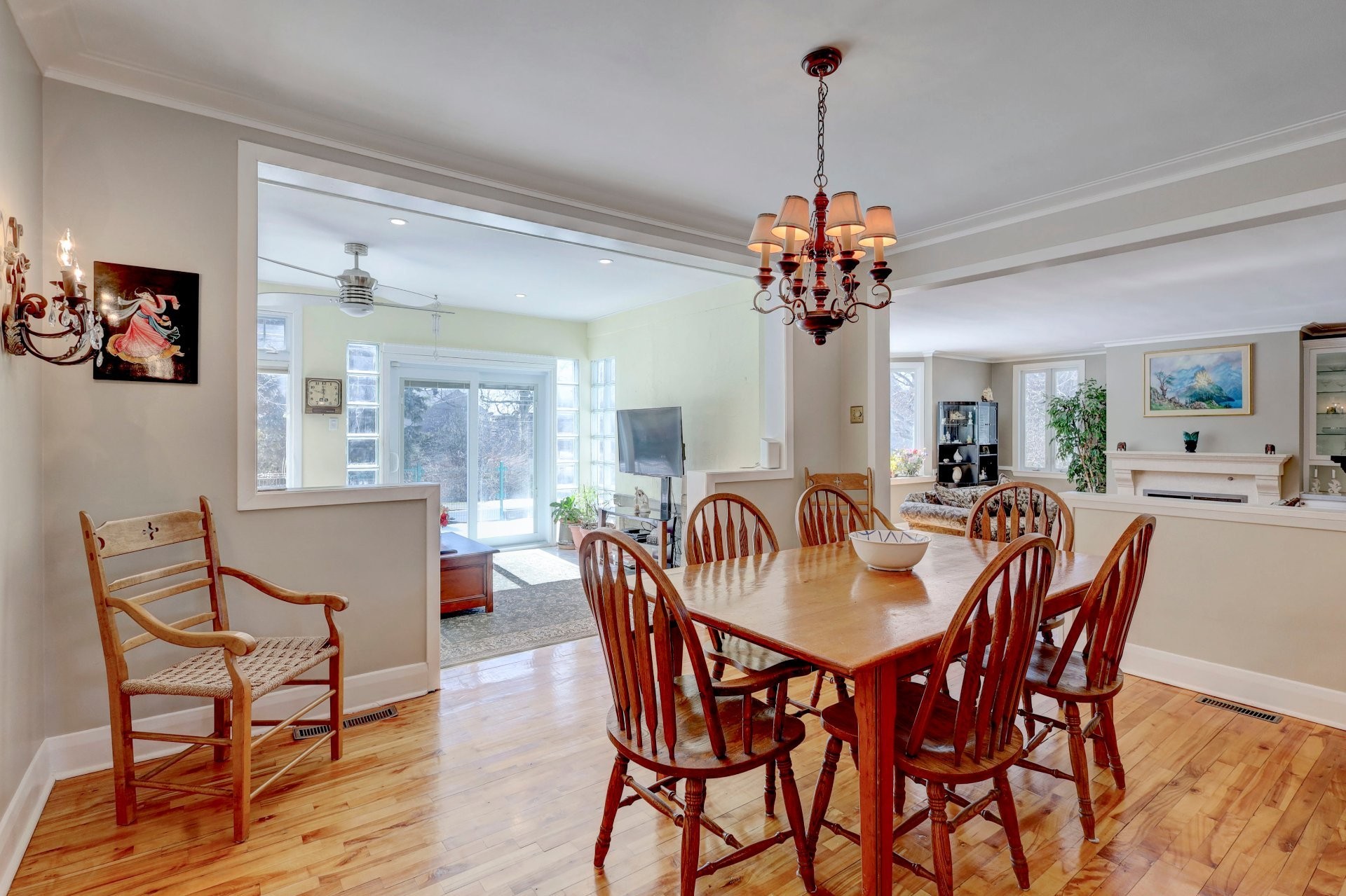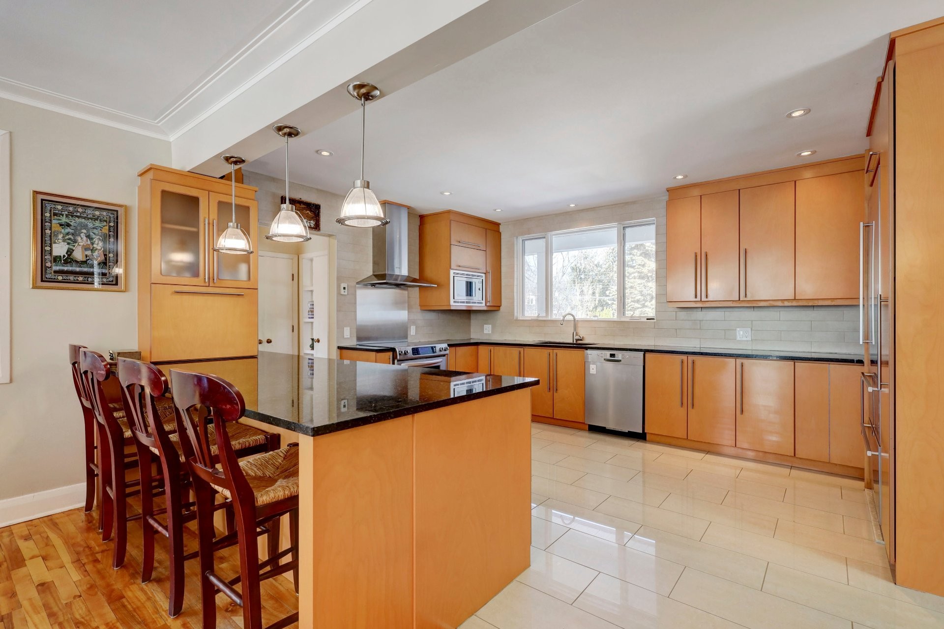 Distinctif par son design, la maison dispose d'une grande cuisine avant avec des armoires abondantes et des comptoirs en granit, surplombant la dinette et la véranda. La dinette spacieuse est baignée de lumière naturelle et s'ouvre sur la véranda orientée sud, avec une porte-patio menant aux magnifiques jardins paysagers.
