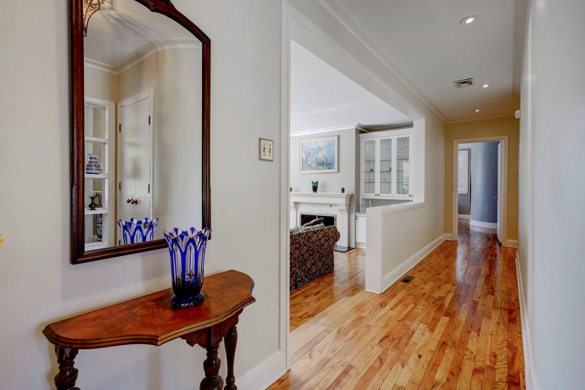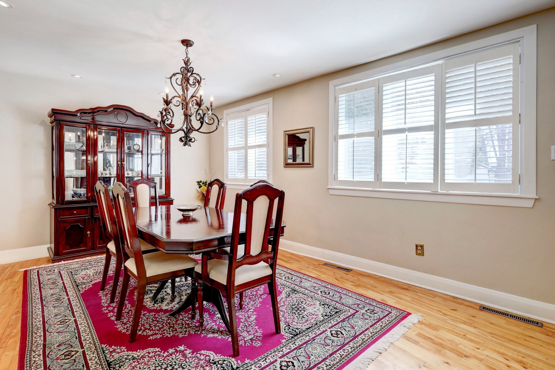 Le salon formel en contrebas (23,10 x 18,9) possède un plafond de neuf pieds, une cheminée à bois et des étagères encastrées sur mesure avec une tablette en marbre, créant un espace chaleureux et invitant pour se détendre et recevoir.