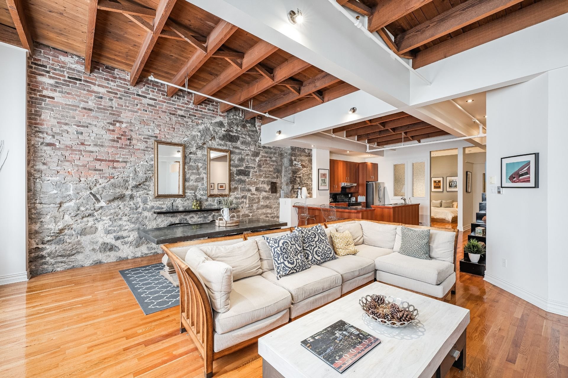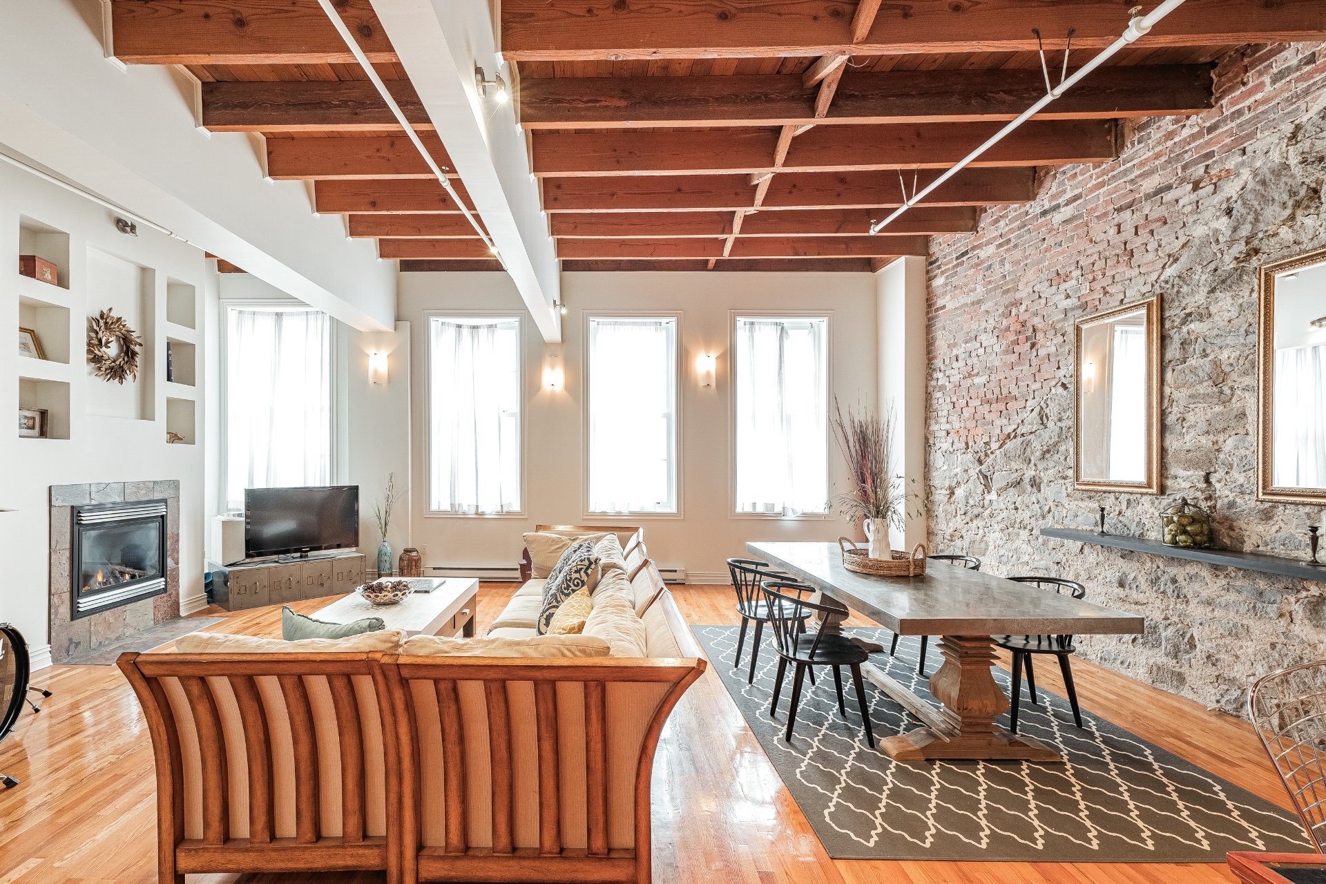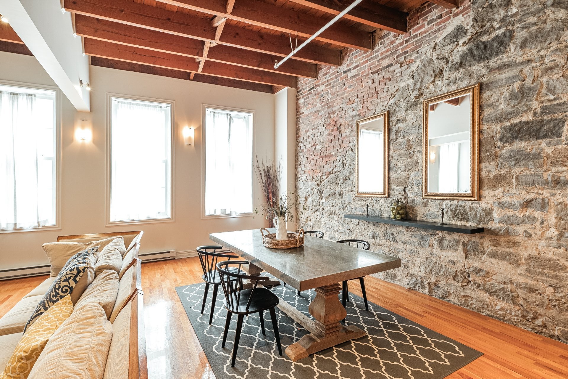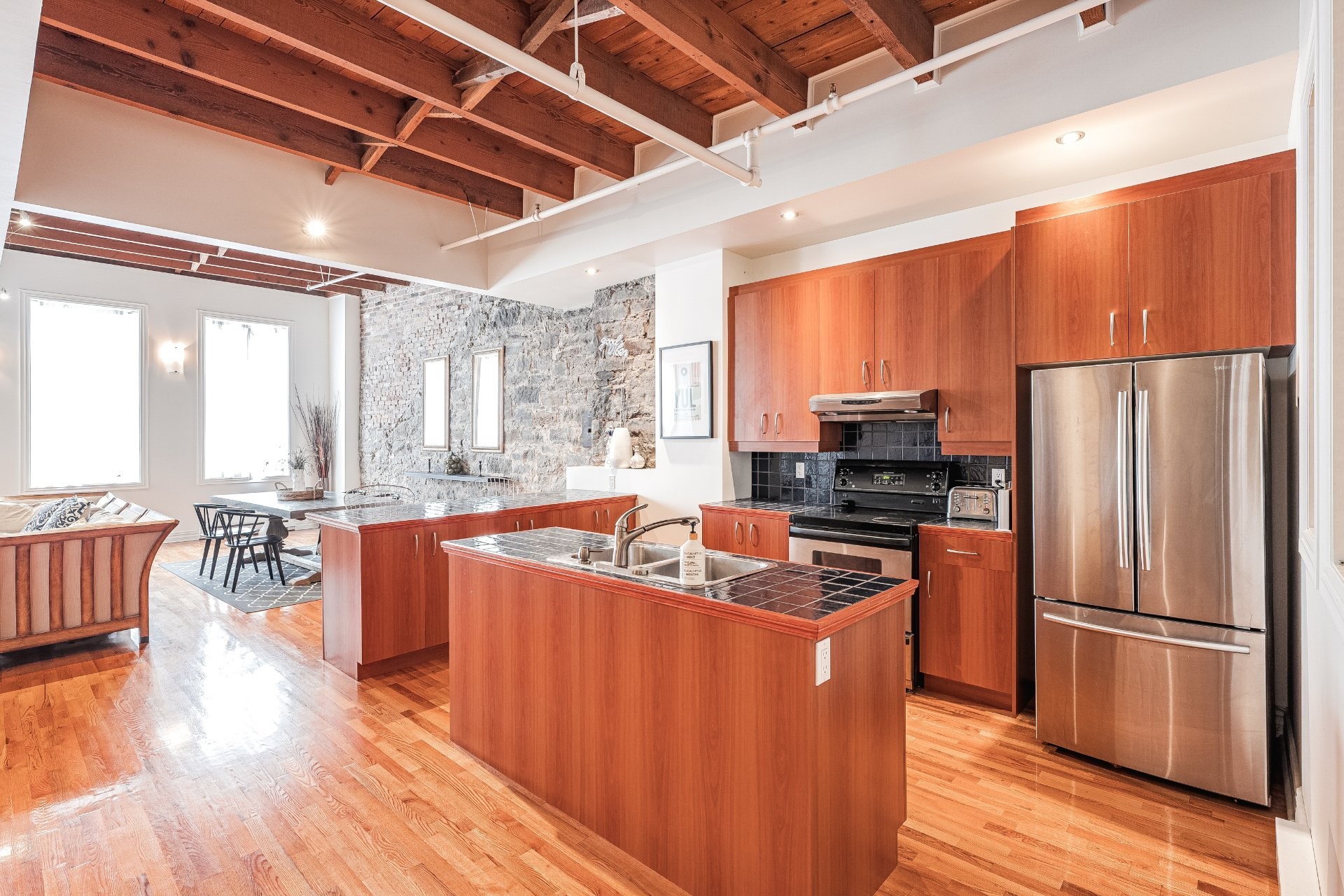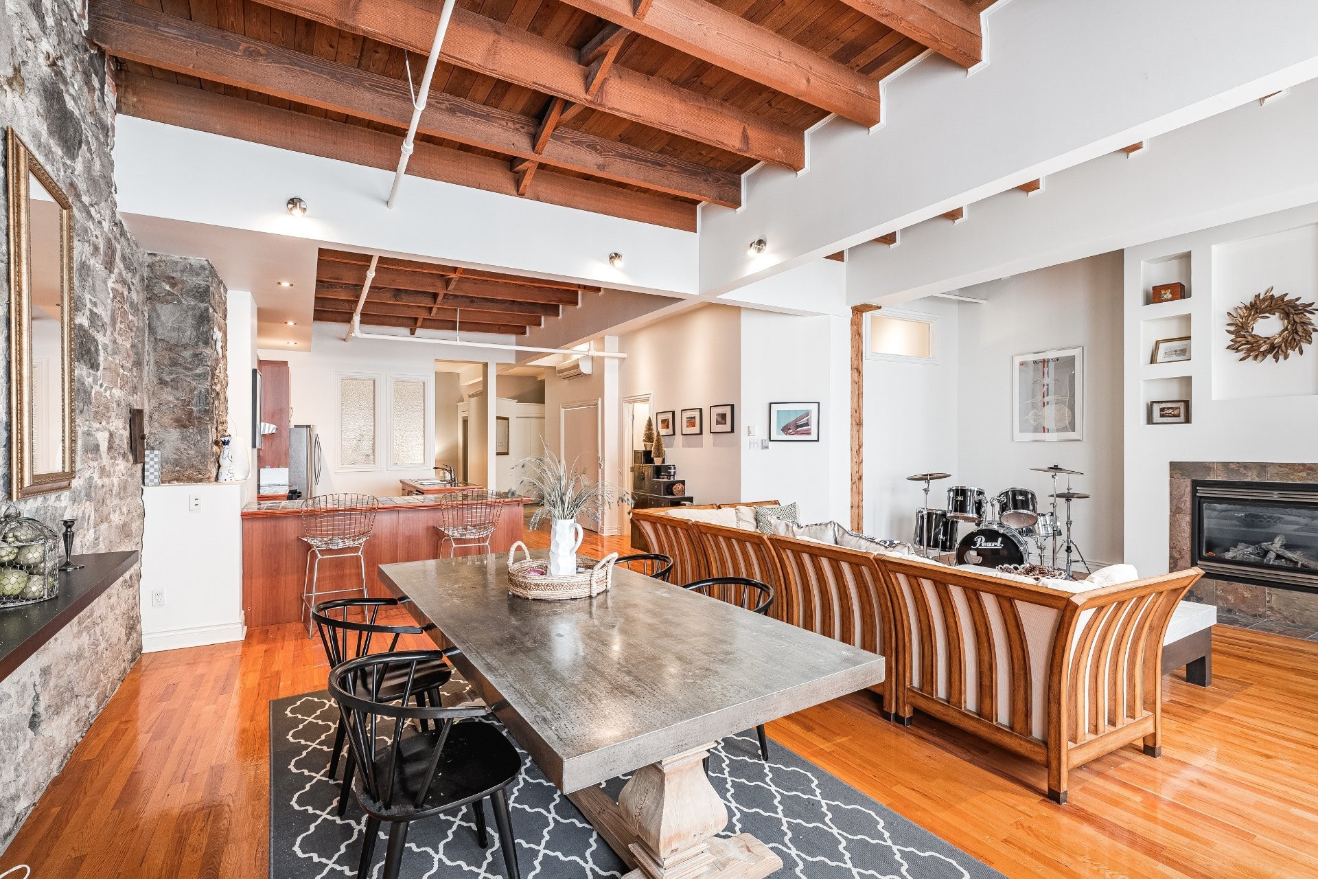 Situé sur l'une des rues les plus emblématiques et convoitées du Vieux-Montréal, ce superbe loft au dernier étage d'un immeuble historique en pierre de 1870 est un véritable bijou. Inondé de lumière naturelle grâce à une magnifique enfilade de fenêtres françaises donnant sur le célèbre Olive & Gourmando, cet espace à aire ouverte marie parfaitement le charme d'époque et le confort moderne. Plafonds de 14 pieds, poutres de bois apparentes, mur de pierre, planchers de bois franc et foyer au gaz créent une atmosphère chaleureuse et élégante. Le salon spacieux s'ouvre sur une salle à manger accueillante et une cuisine bien pensée avec deux îlots -- idéale pour recevoir ou profiter du quotidien.