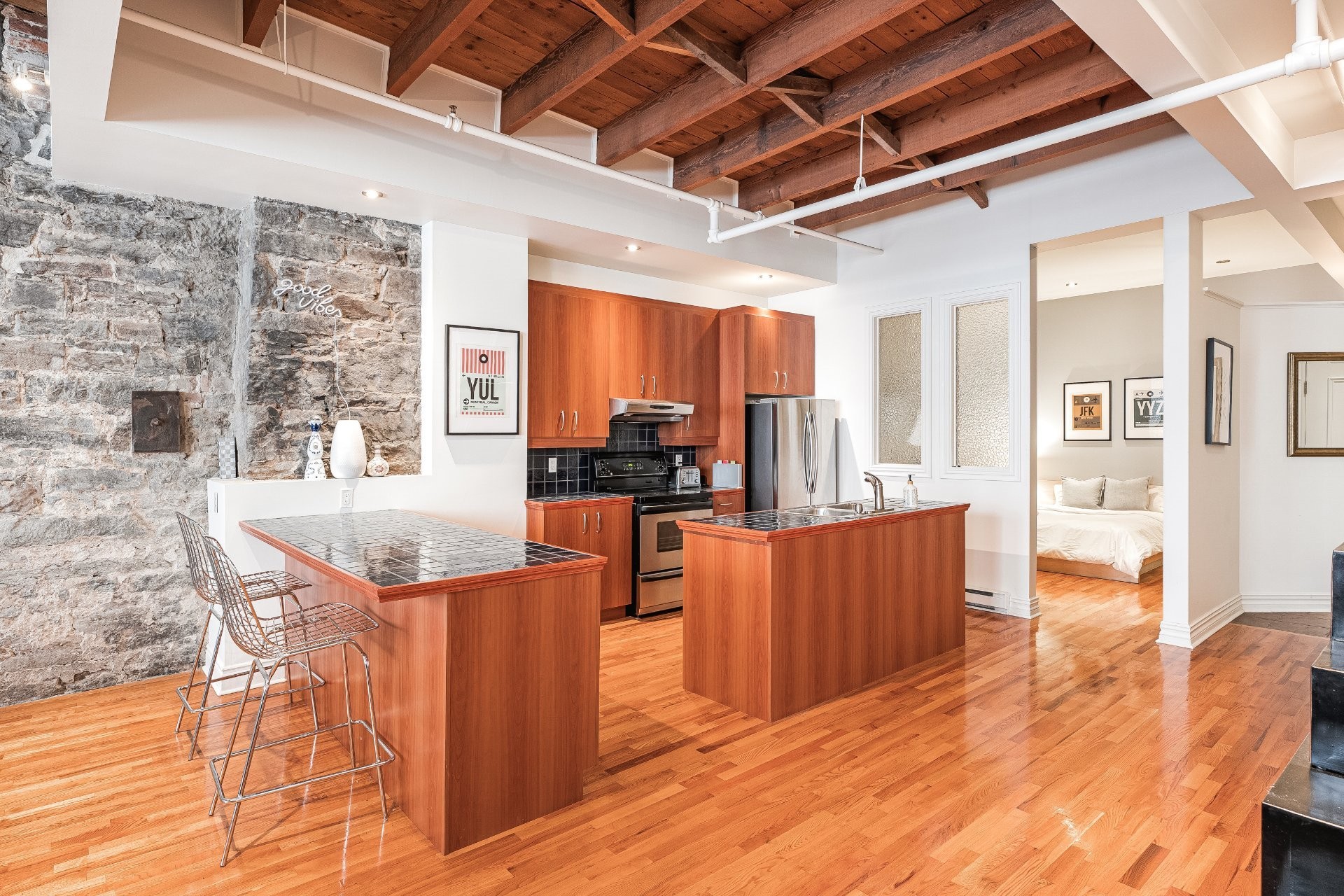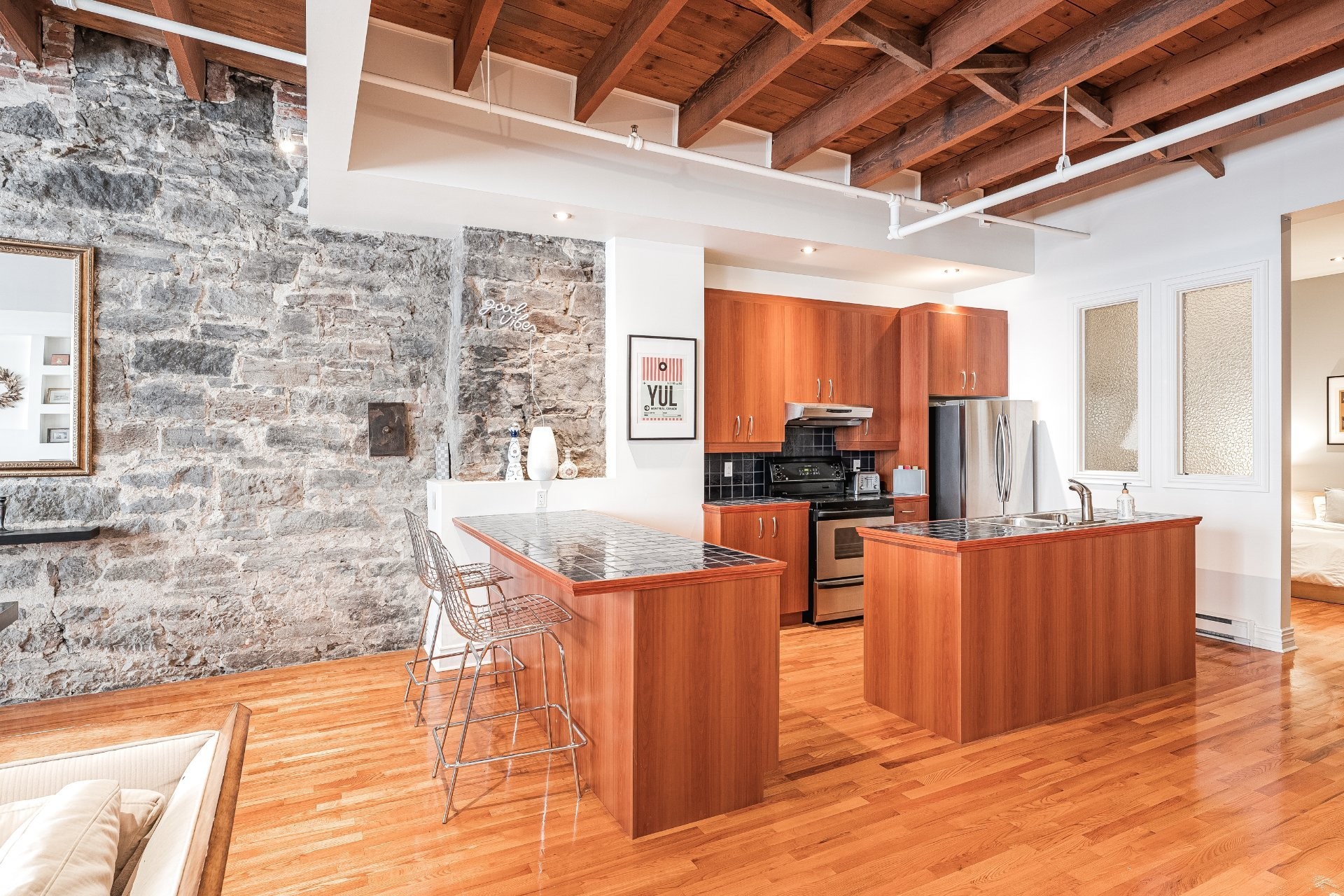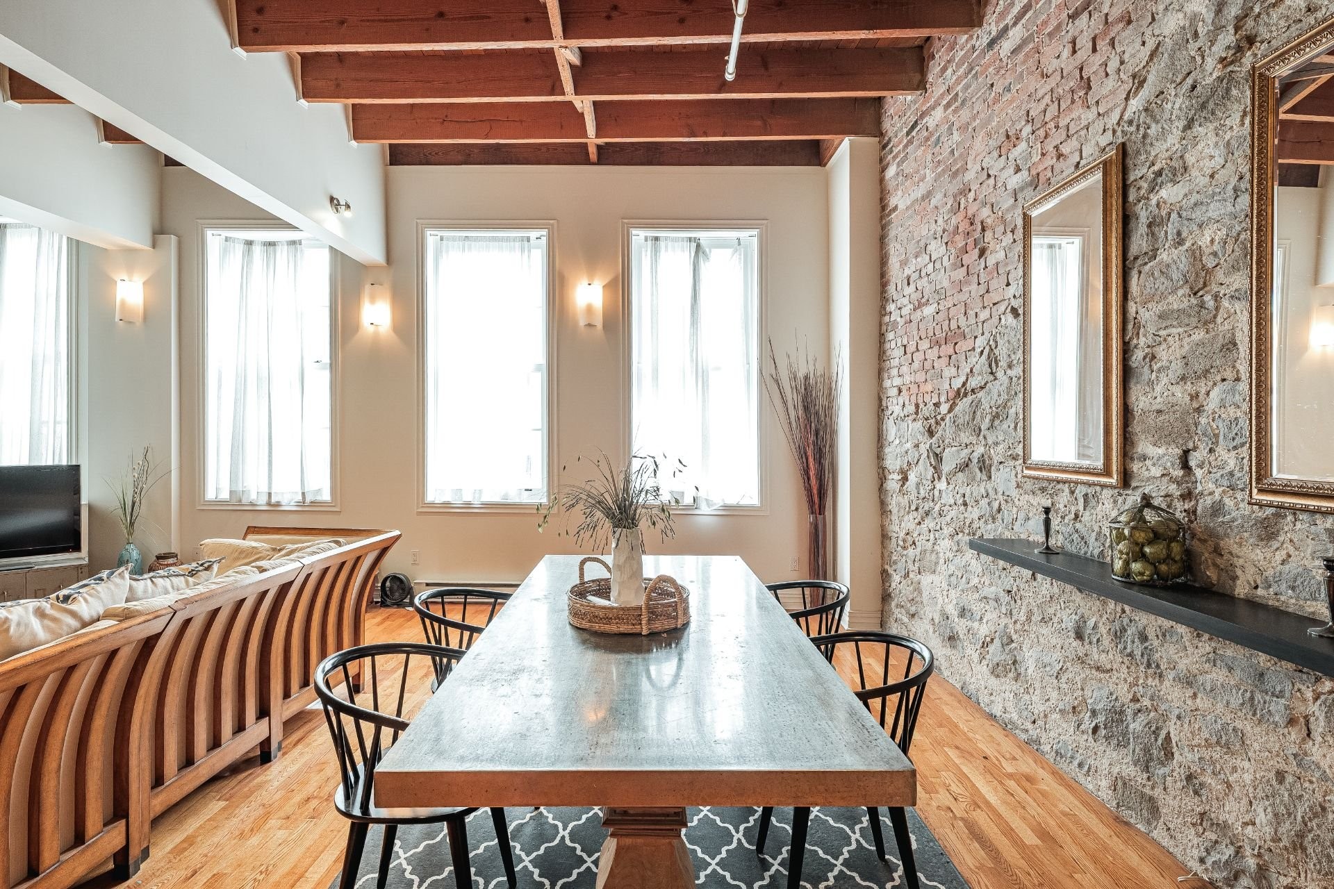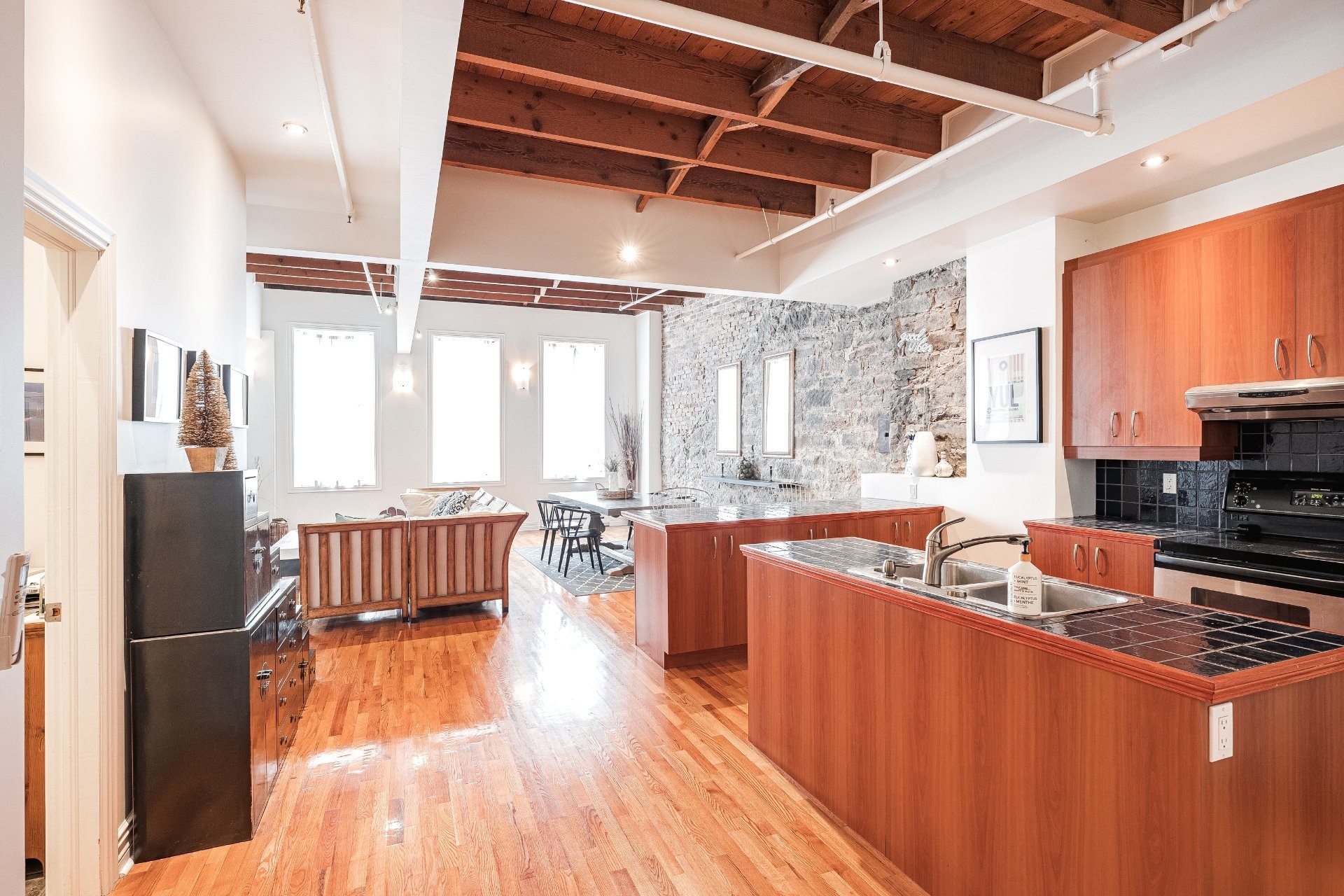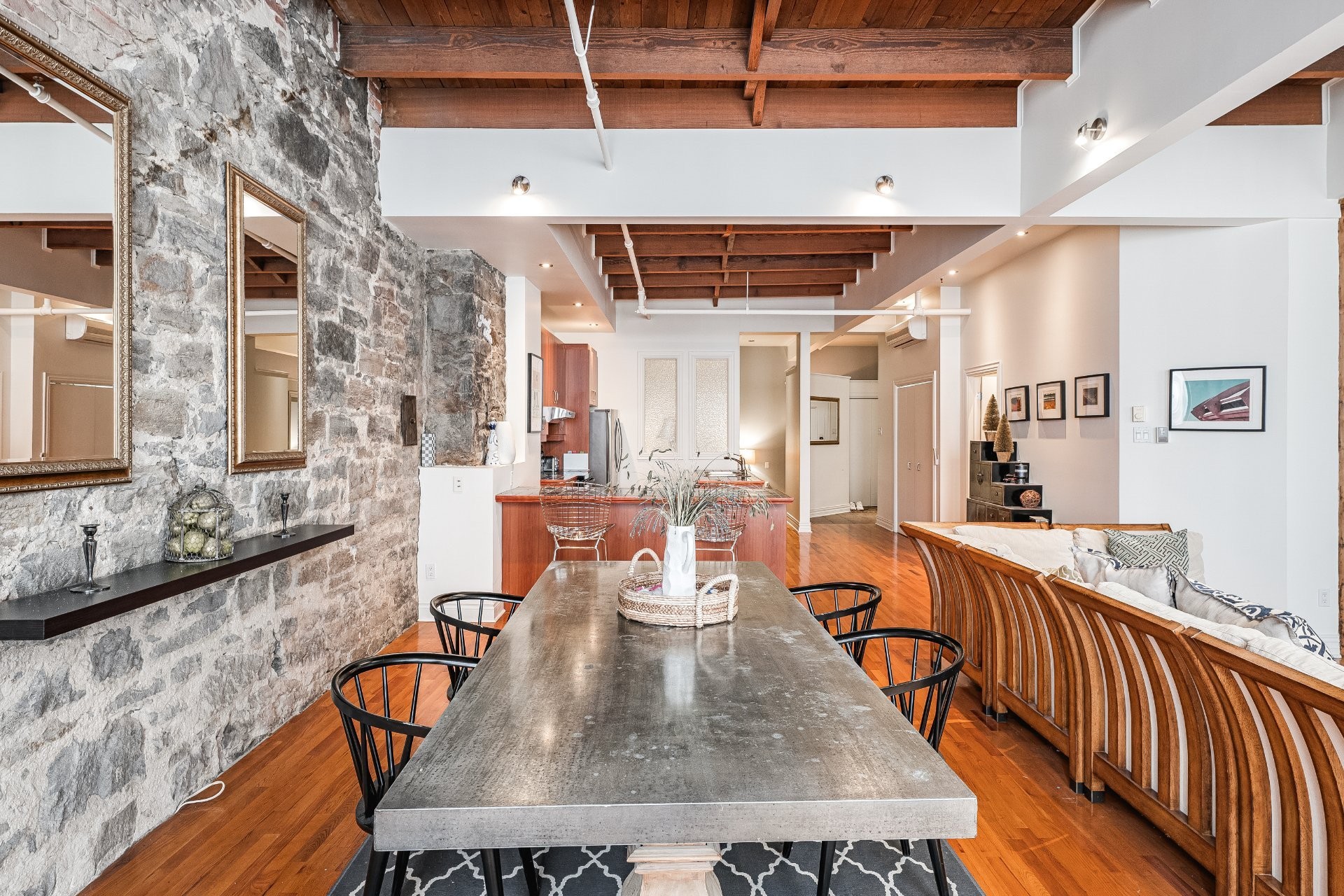 Situé sur l'une des rues les plus emblématiques et convoitées du Vieux-Montréal, ce superbe loft au dernier étage d'un immeuble historique en pierre de 1870 est un véritable bijou. Inondé de lumière naturelle grâce à une magnifique enfilade de fenêtres françaises donnant sur le célèbre Olive & Gourmando, cet espace à aire ouverte marie parfaitement le charme d'époque et le confort moderne. Plafonds de 14 pieds, poutres de bois apparentes, mur de pierre, planchers de bois franc et foyer au gaz créent une atmosphère chaleureuse et élégante. Le salon spacieux s'ouvre sur une salle à manger accueillante et une cuisine bien pensée avec deux îlots -- idéale pour recevoir ou profiter du quotidien.
