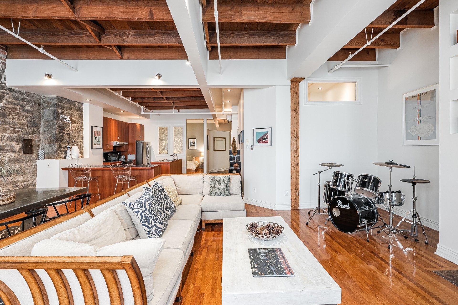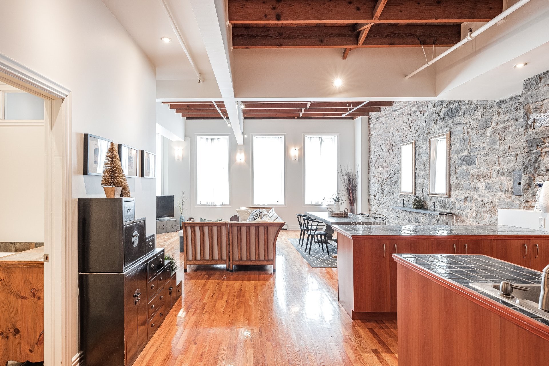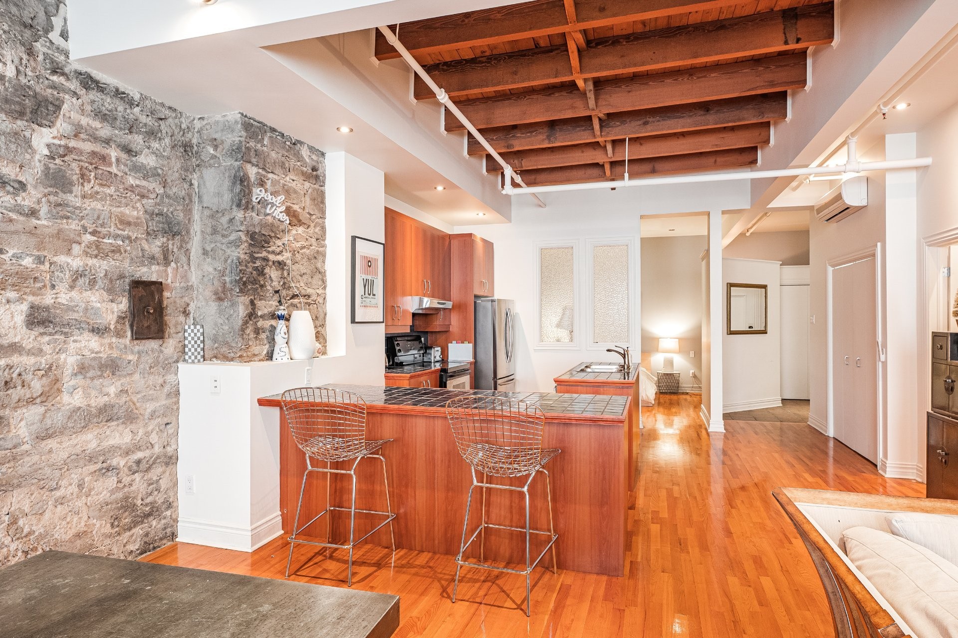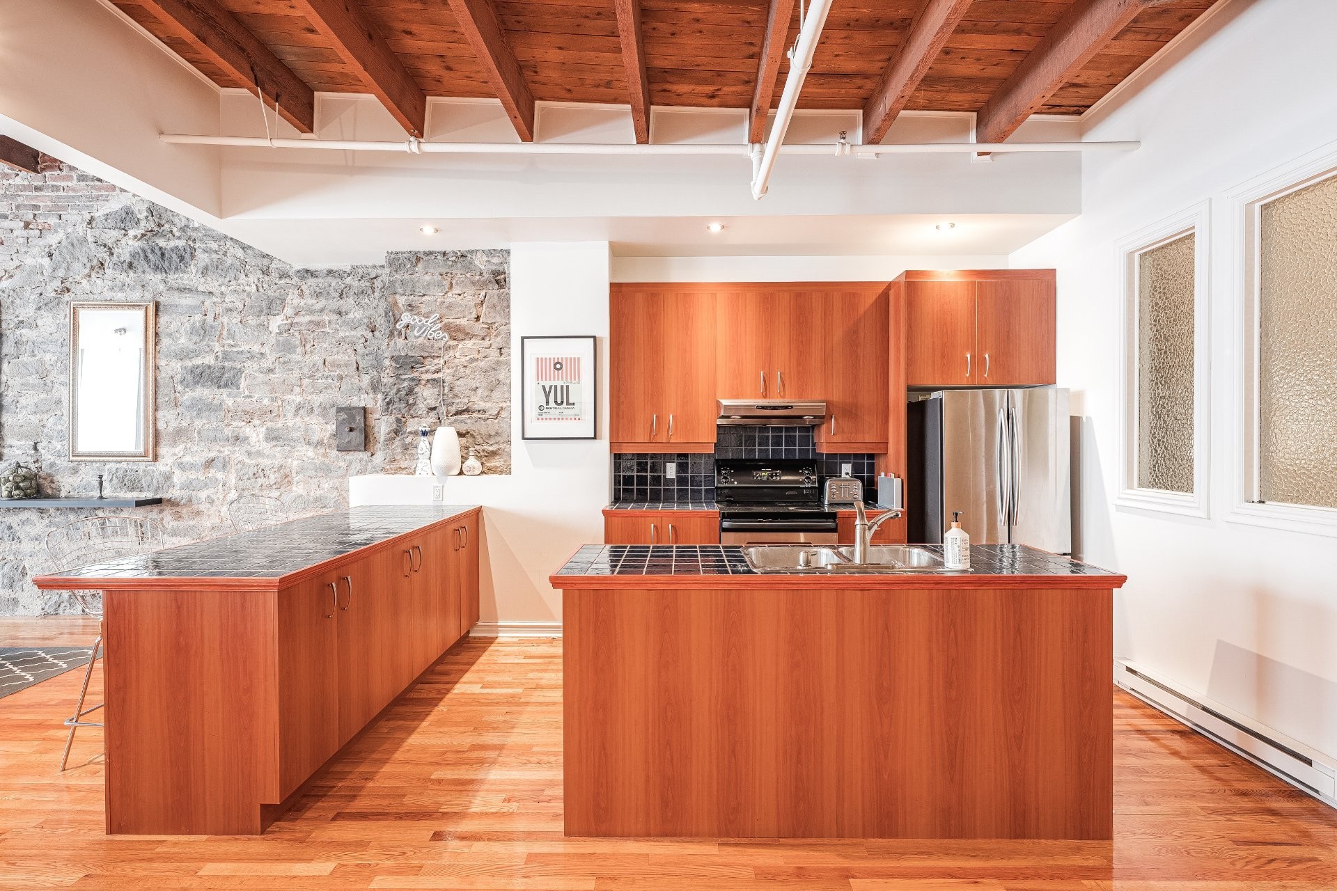 Situé sur l'une des rues les plus emblématiques et convoitées du Vieux-Montréal, ce superbe loft au dernier étage d'un immeuble historique en pierre de 1870 est un véritable bijou. Inondé de lumière naturelle grâce à une magnifique enfilade de fenêtres françaises donnant sur le célèbre Olive & Gourmando, cet espace à aire ouverte marie parfaitement le charme d'époque et le confort moderne. Plafonds de 14 pieds, poutres de bois apparentes, mur de pierre, planchers de bois franc et foyer au gaz créent une atmosphère chaleureuse et élégante. Le salon spacieux s'ouvre sur une salle à manger accueillante et une cuisine bien pensée avec deux îlots -- idéale pour recevoir ou profiter du quotidien.