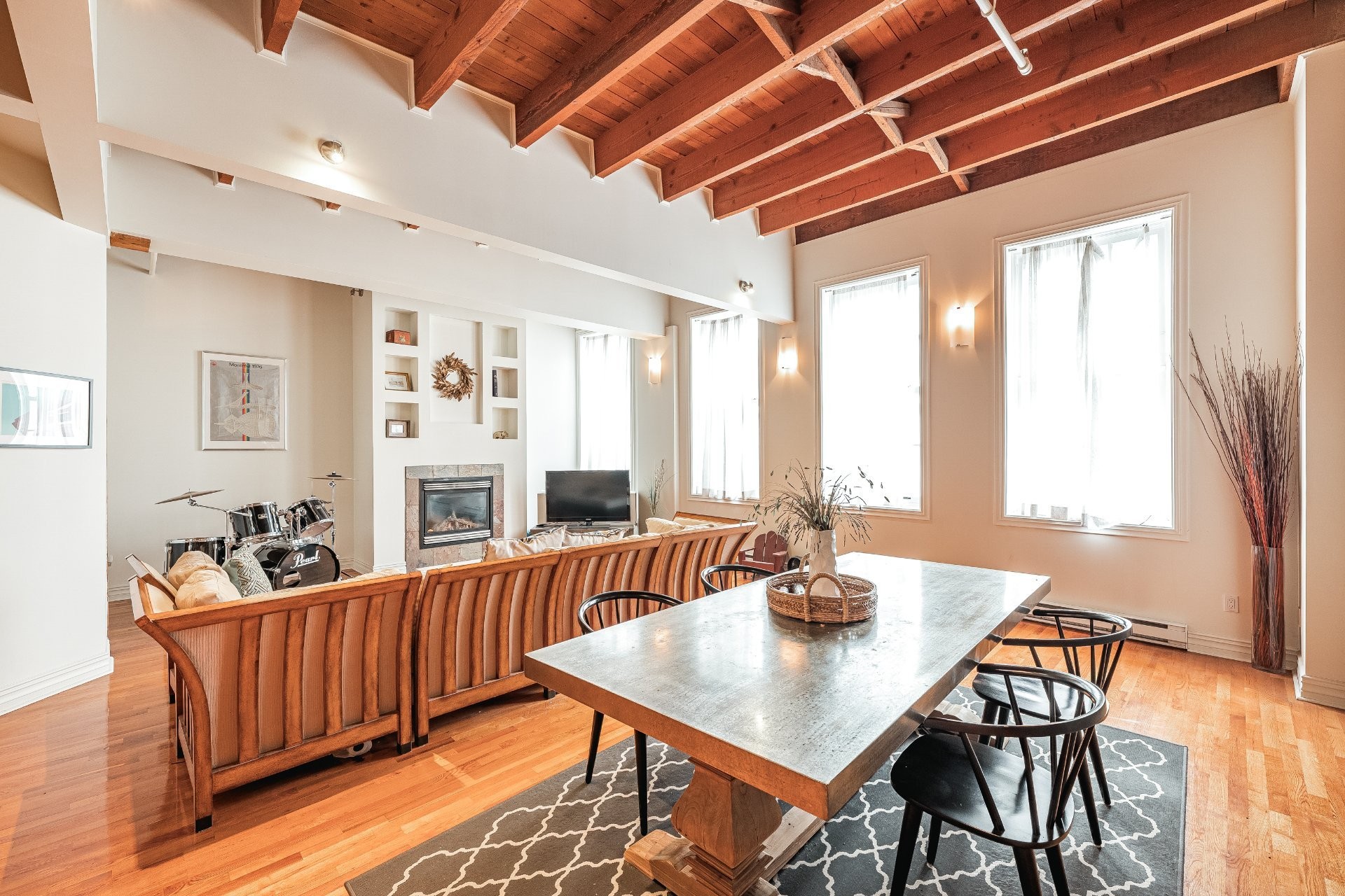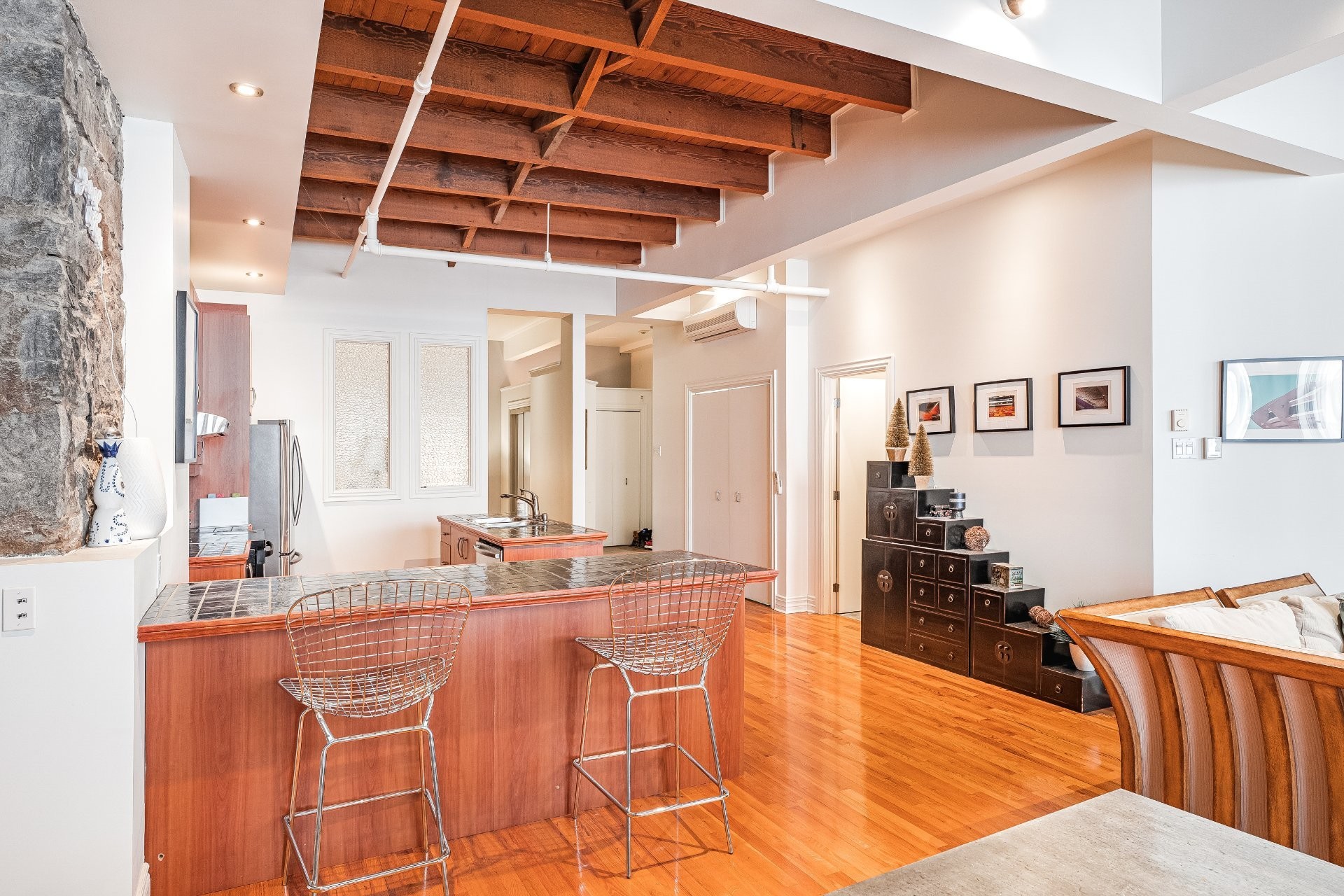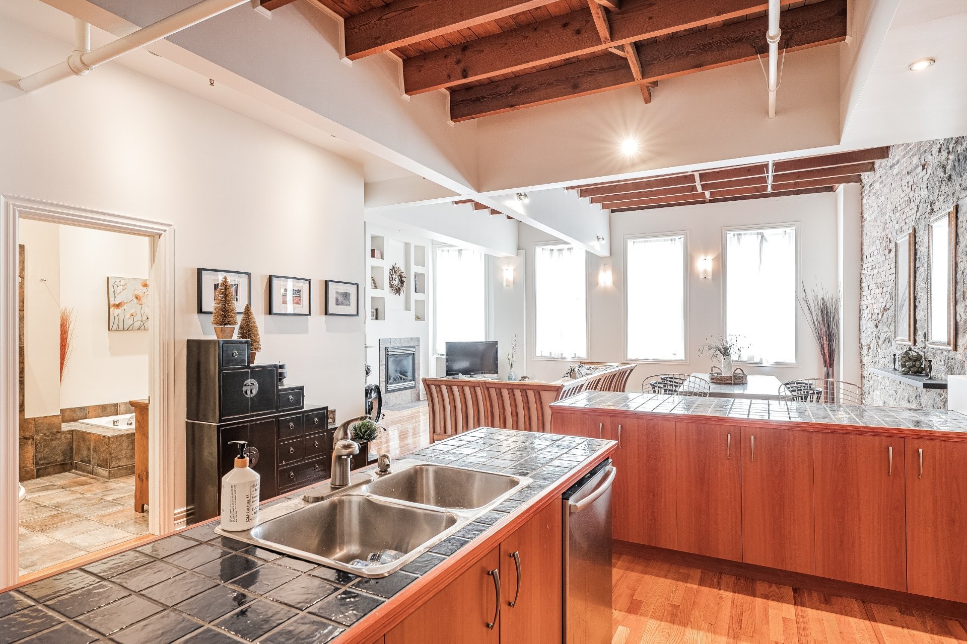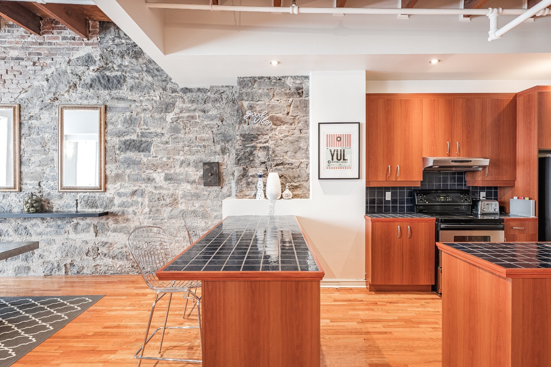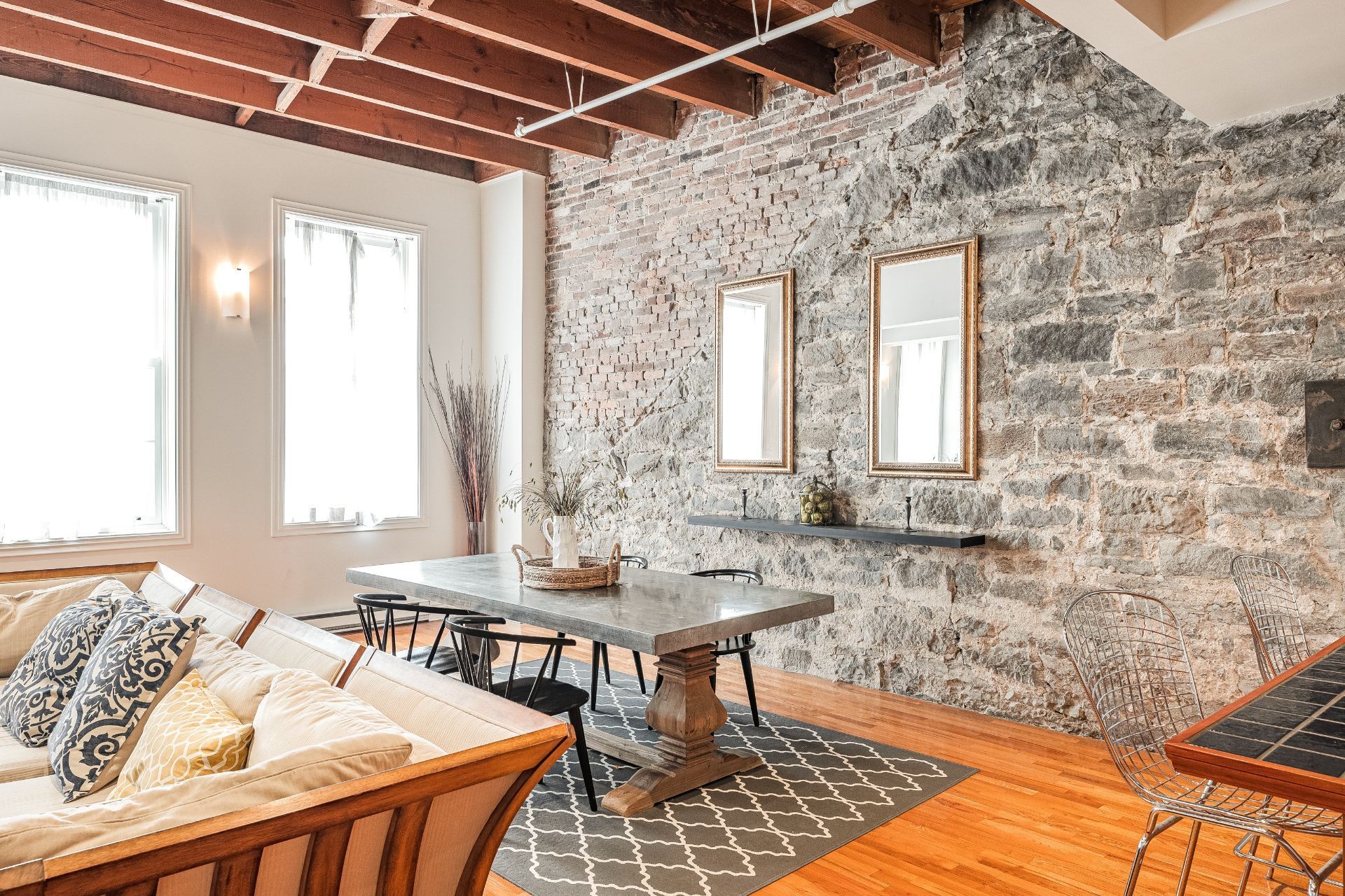Situé sur l'une des rues les plus emblématiques et convoitées du Vieux-Montréal, ce superbe loft au dernier étage d'un immeuble historique en pierre de 1870 est un véritable bijou. Inondé de lumière naturelle grâce à une magnifique enfilade de fenêtres françaises donnant sur le célèbre Olive & Gourmando, cet espace à aire ouverte marie parfaitement le charme d'époque et le confort moderne. Plafonds de 14 pieds, poutres de bois apparentes, mur de pierre, planchers de bois franc et foyer au gaz créent une atmosphère chaleureuse et élégante. Le salon spacieux s'ouvre sur une salle à manger accueillante et une cuisine bien pensée avec deux îlots -- idéale pour recevoir ou profiter du quotidien.