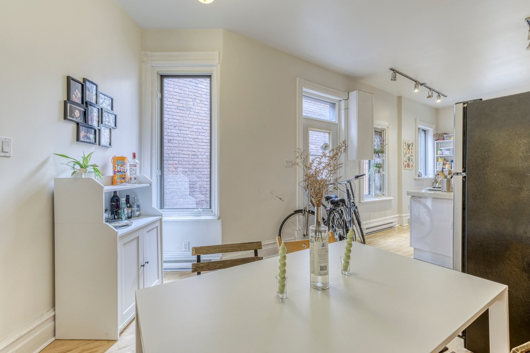 Dès l'entrée, les plafonds hauts créent une impression immédiate de grandeur et de luminosité. Le caractère unique de l'appartement est sublimé par de superbes planchers de bois franc, apportant chaleur et élégance à chaque espace.