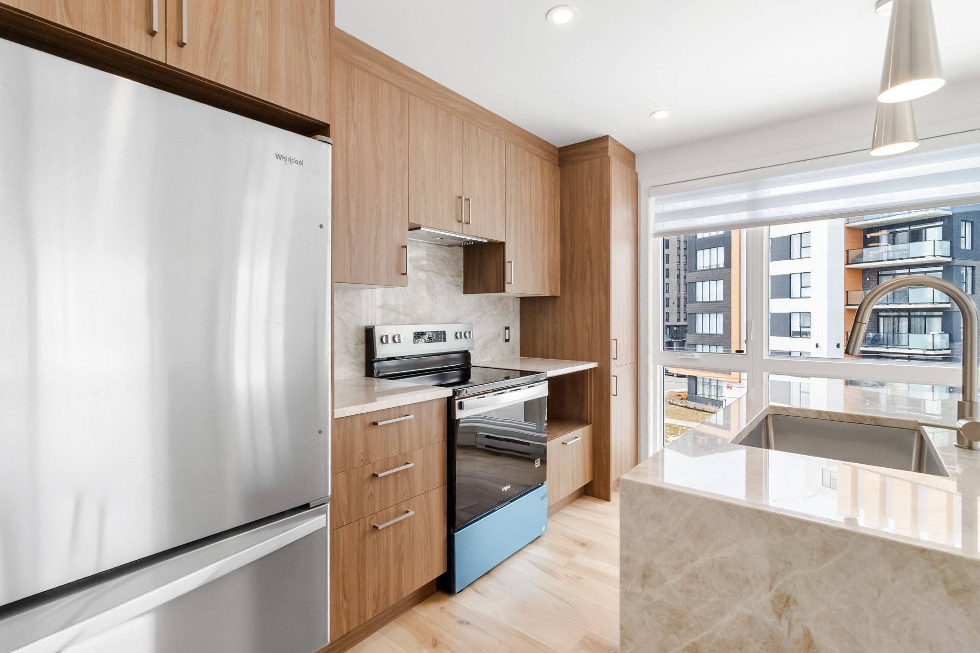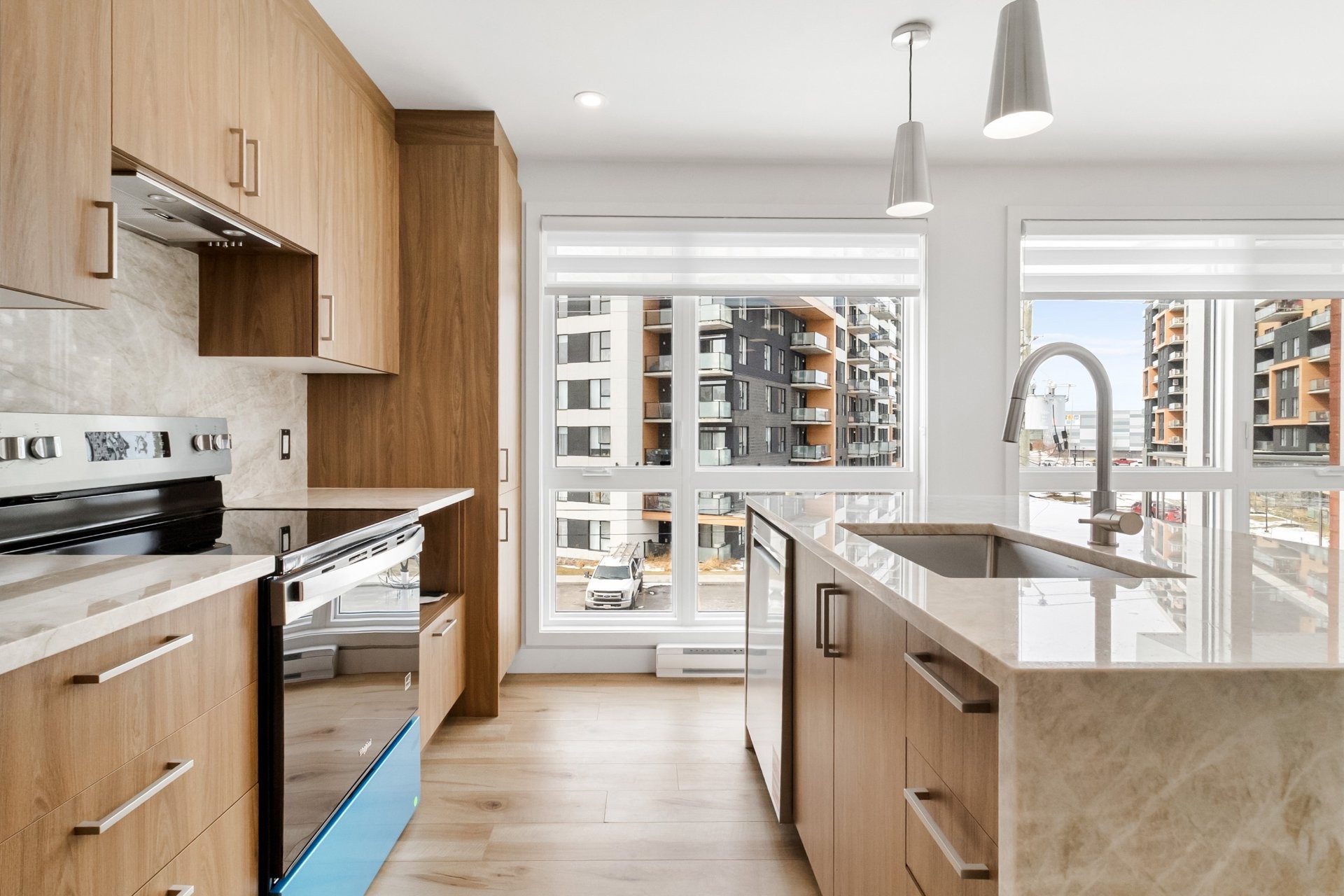 La cuisine élégante dispose de comptoirs en granit saisissants avec un îlot en cascade, complétés par des finitions raffinées et des électroménagers tout neufs. Le plancher en bois d'ingénierie s'étend dans toute l'unité, apportant chaleur et sophistication.