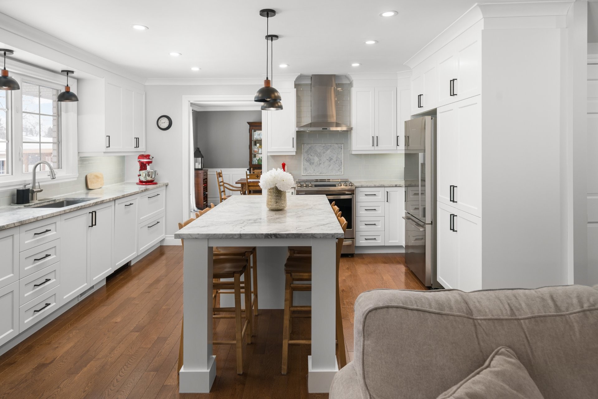 Le rez-de-chaussée met en valeur de superbes planchers de bois à lattes sur toute la surface, créant une atmosphère chaleureuse et harmonieuse. Un vaste hall d'entrée mène à un lumineux salon et une salle à manger à aire ouverte, parfaits pour recevoir. La cuisine rénovée est dotée de comptoirs en granite blanc, d'un grand îlot central idéal pour les rassemblements familiaux, et s'ouvre sur une accueillante salle familiale comprenant un foyer au bois, un plafond cathédrale et des rangements intégrés sur mesure.À l'étage, la suite principale constitue un véritable havre de paix, offrant une chambre spacieuse ainsi qu'une salle de bains attenante de style spa avec baignoire autoportante, douche vitrée, planchers chauffants, double lavabo et un grand walk-in. Trois autres chambres de belles dimensions avec un généreux espace de rangement, ainsi qu'une salle de bains familiale complète, complètent ce niveau. Le sous-sol aménagé offre une grande polyvalence avec une salle de jeux incluant un coin bar, une grande chambre avec boudoir adjacent (pouvant être converti en chambre additionnelle), une salle de bains complète et de nombreux espaces de rangement. Le garage double a été soigneusement aménagé avec un plancher en époxy, des systèmes de rangement muraux et des supports de rangement au plafond, alliant fonctionnalité et esthétique.À l'extérieur, la cour arrière magnifiquement aménagée se transforme en véritable oasis privée, idéale pour recevoir, avec une piscine creusée au sel chauffée, un spa, un pavillon BBQ extérieur construit sur mesure, un gazebo et une terrasse en pavé uni. Soigneusement entretenue et prête à emménager, cette propriété spacieuse témoigne d'une véritable fierté de propriété et offre un style de vie exceptionnel dans l'un des secteurs les plus prisés de Beaconsfield Sud. Une occasion rare à ne pas manquer.