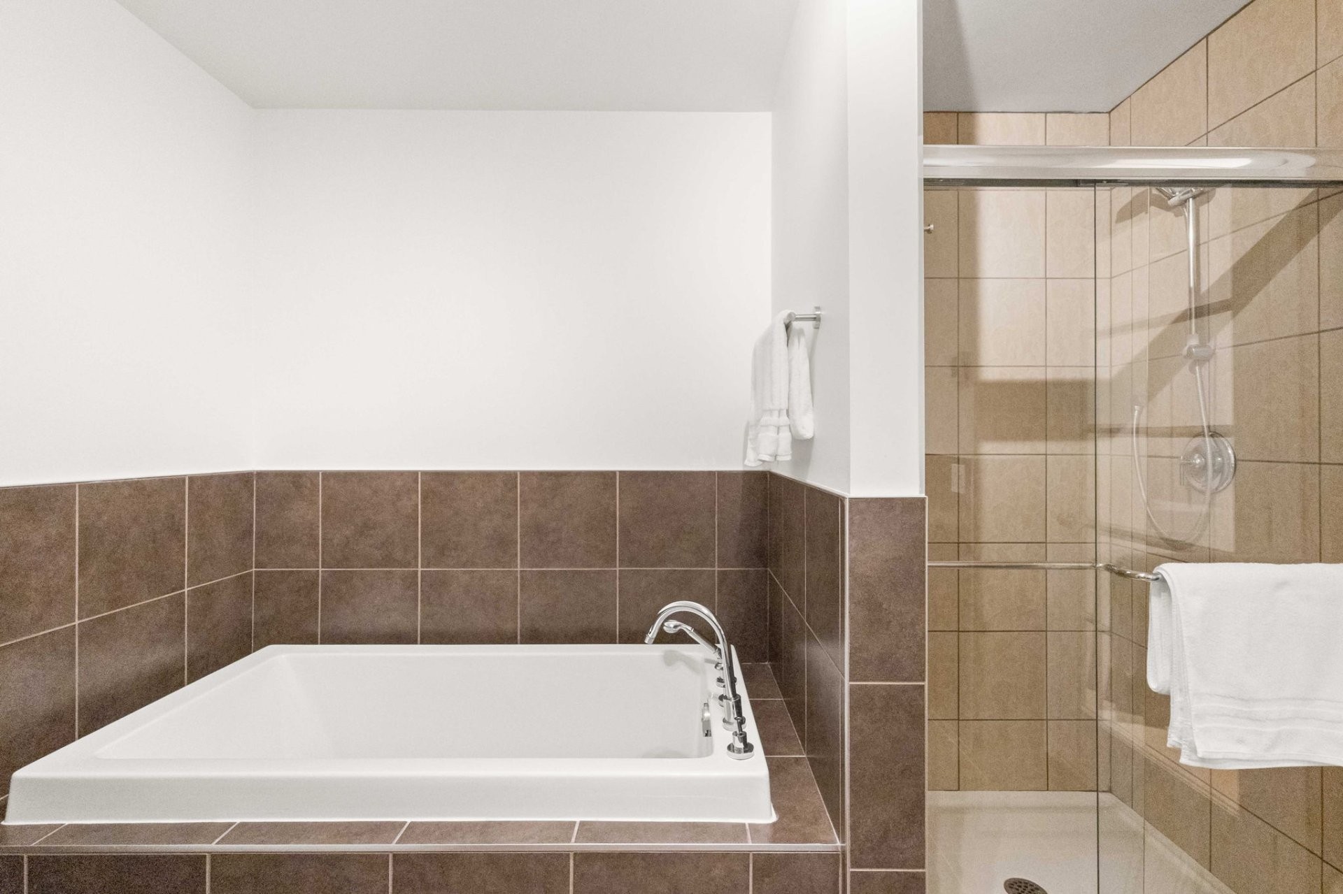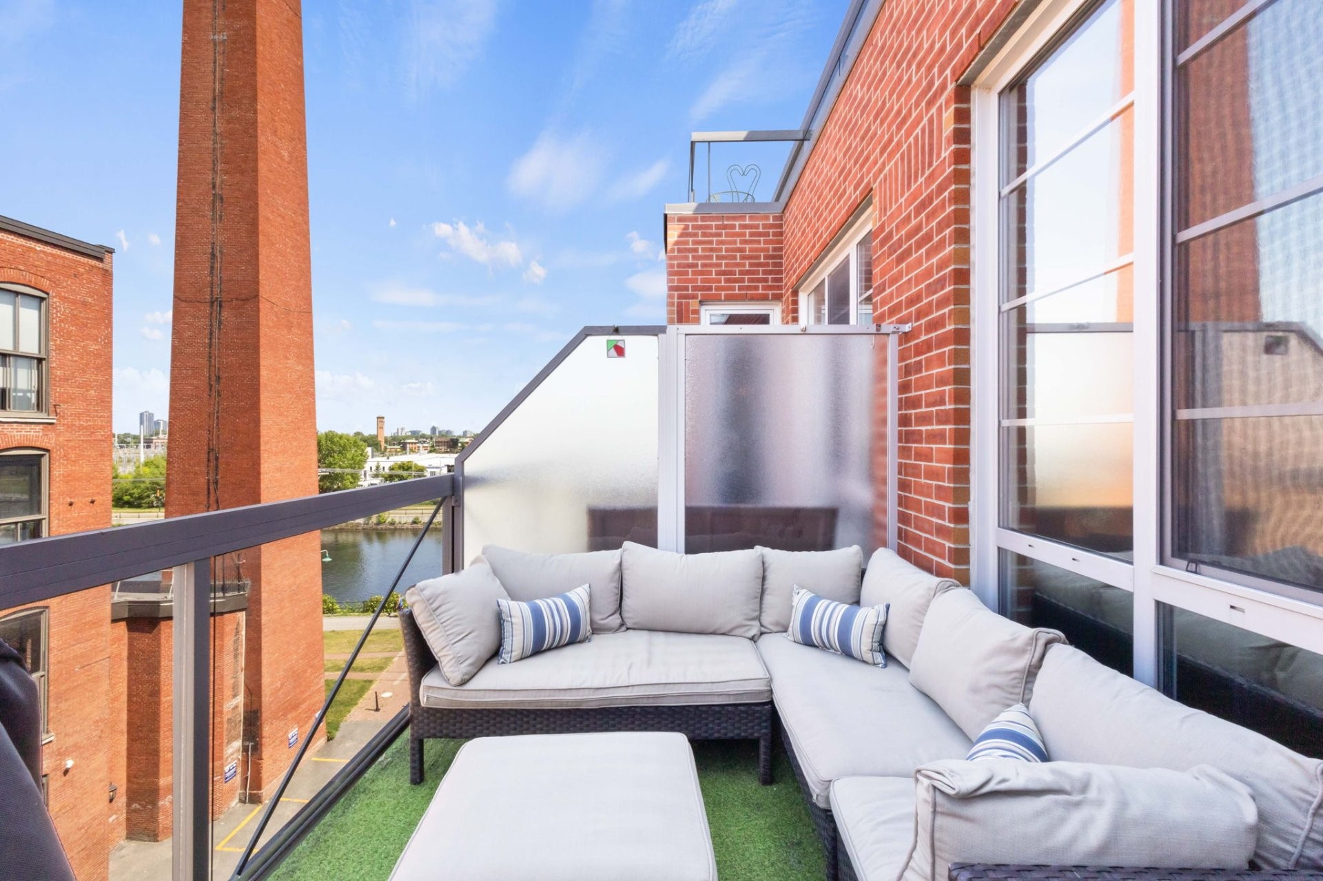 La salle de bain moderne dispose de comptoirs en quartz et d'une douche vitrée séparée. Profitez de votre balcon privé avec une vue imprenable sur le canal -- parfait pour le café du matin ou un moment de détente en soirée.