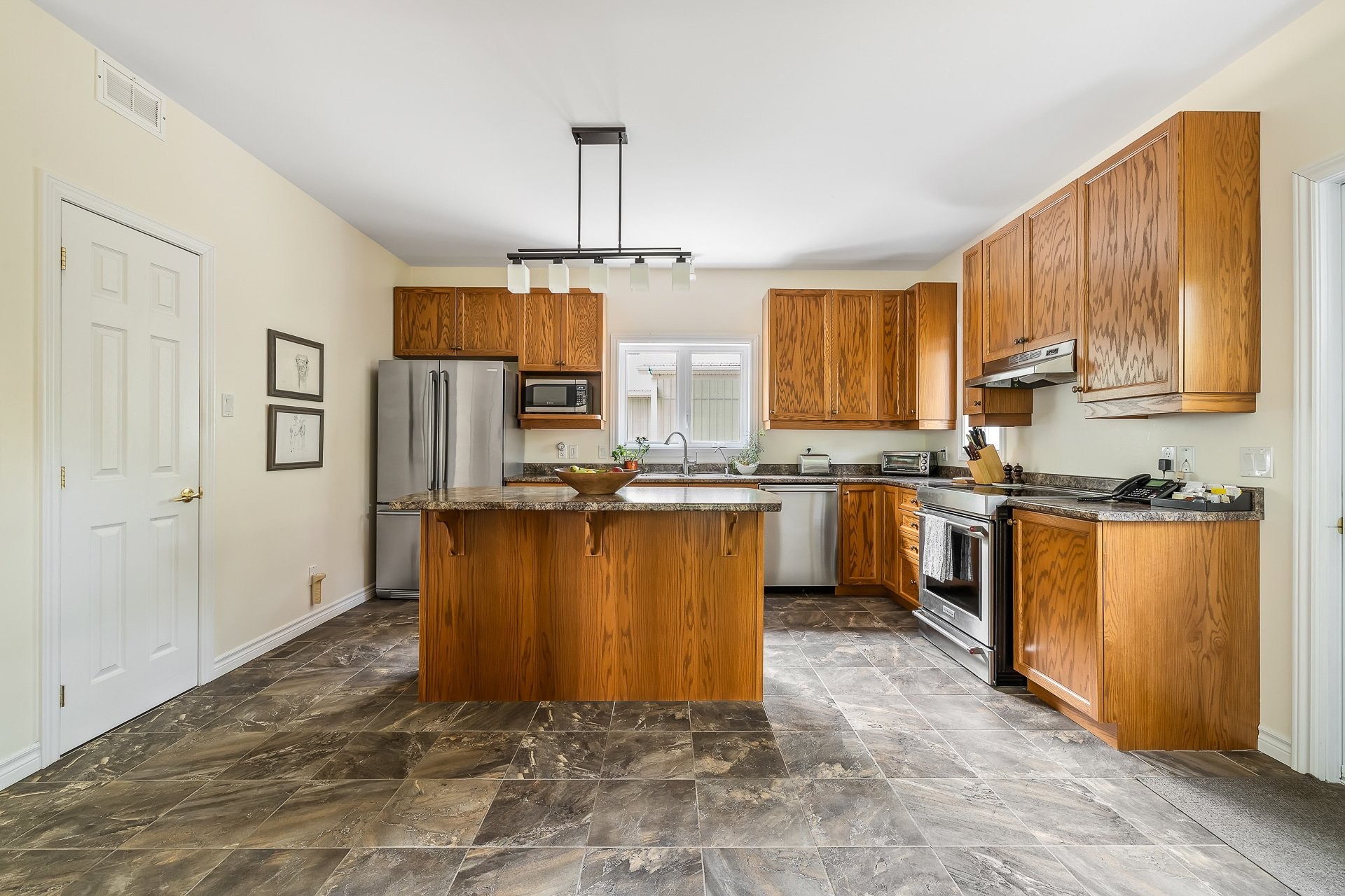 Cuisinière, réfrigérateur, lave-vaisselle, congélateur au sous-sol, armoires encastrées dans la salle familiale, salle de rangement et salle mécanique. chauffe-eau, foyer au gaz propane luminaires, stores.