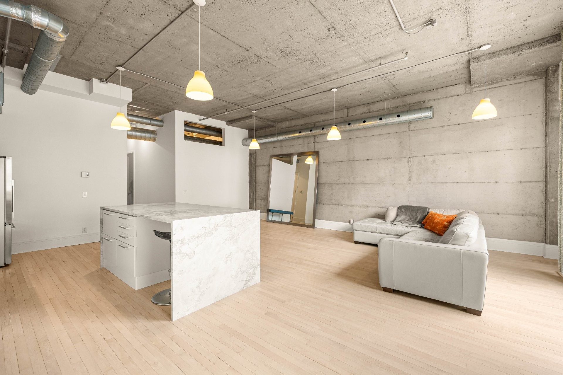 Le plan à aire ouverte de l'air de vie, met en valeur les détails en béton exposé, et un éclairage sur mesure, alliant parfaitement esthétique industrielle et confort haut de gamme.