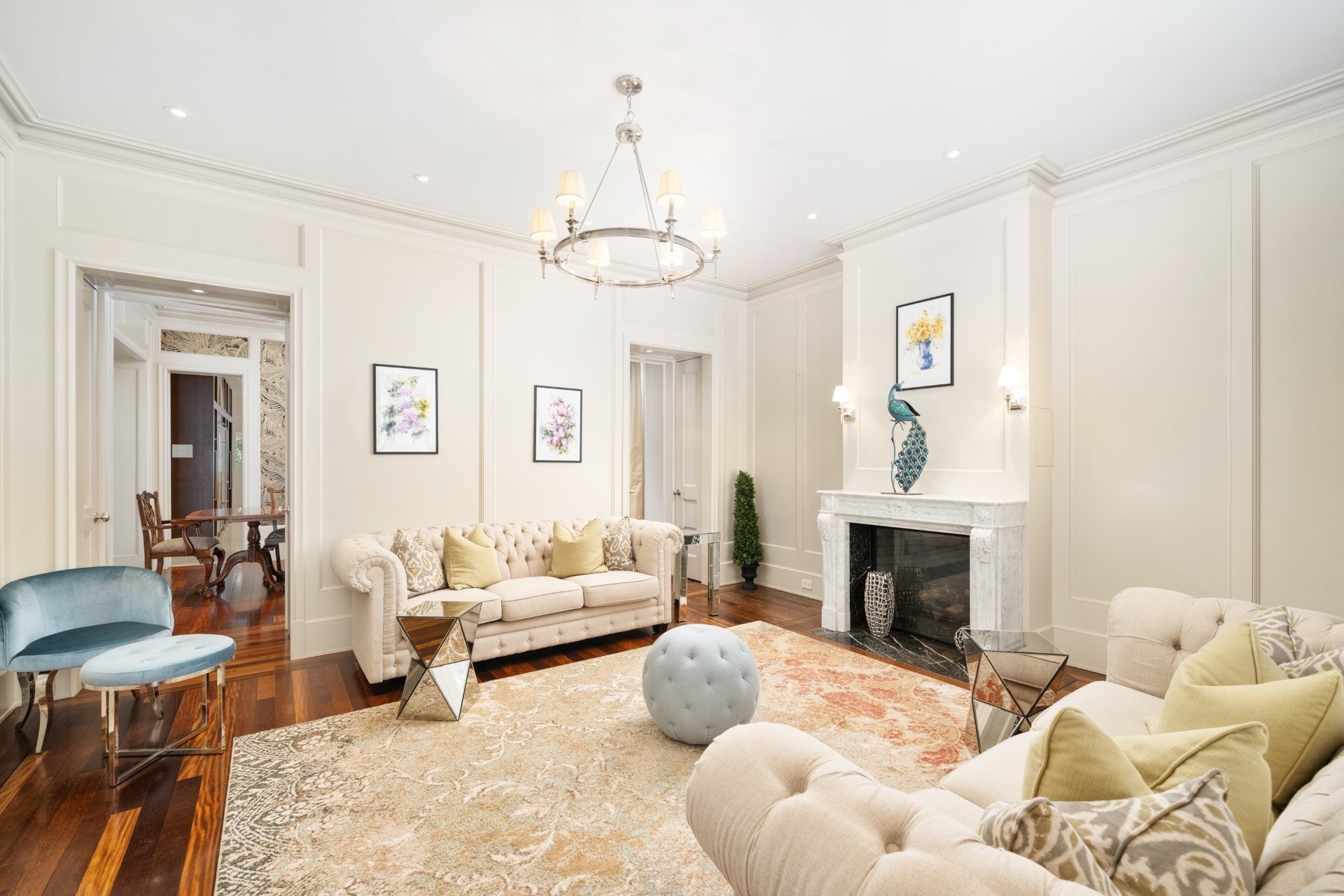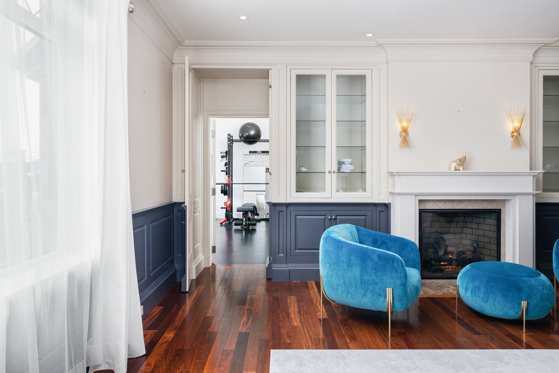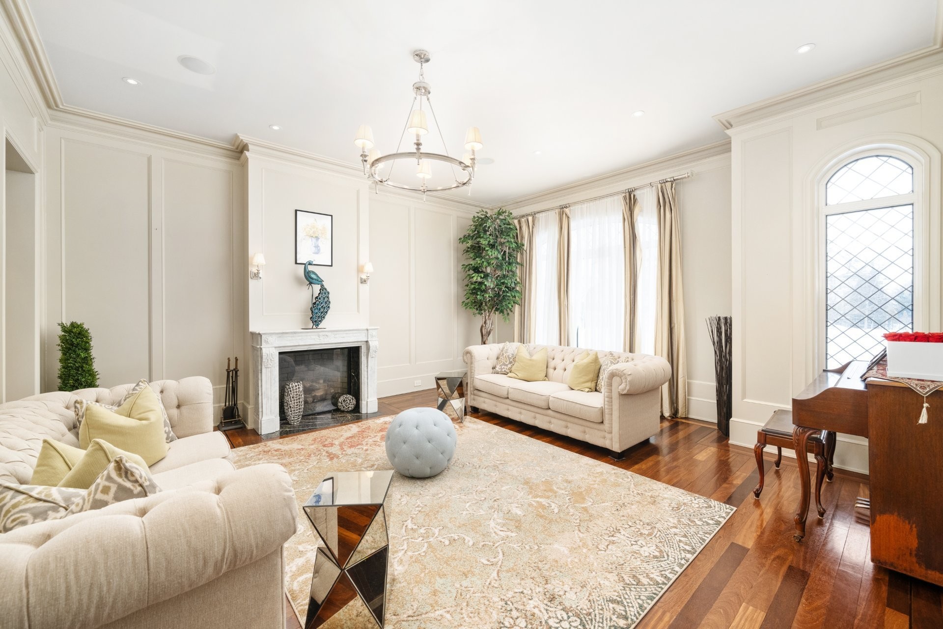 -Salon élégant aux plafonds hauts, moulures raffinées, foyer au gaz et grandes fenêtres.