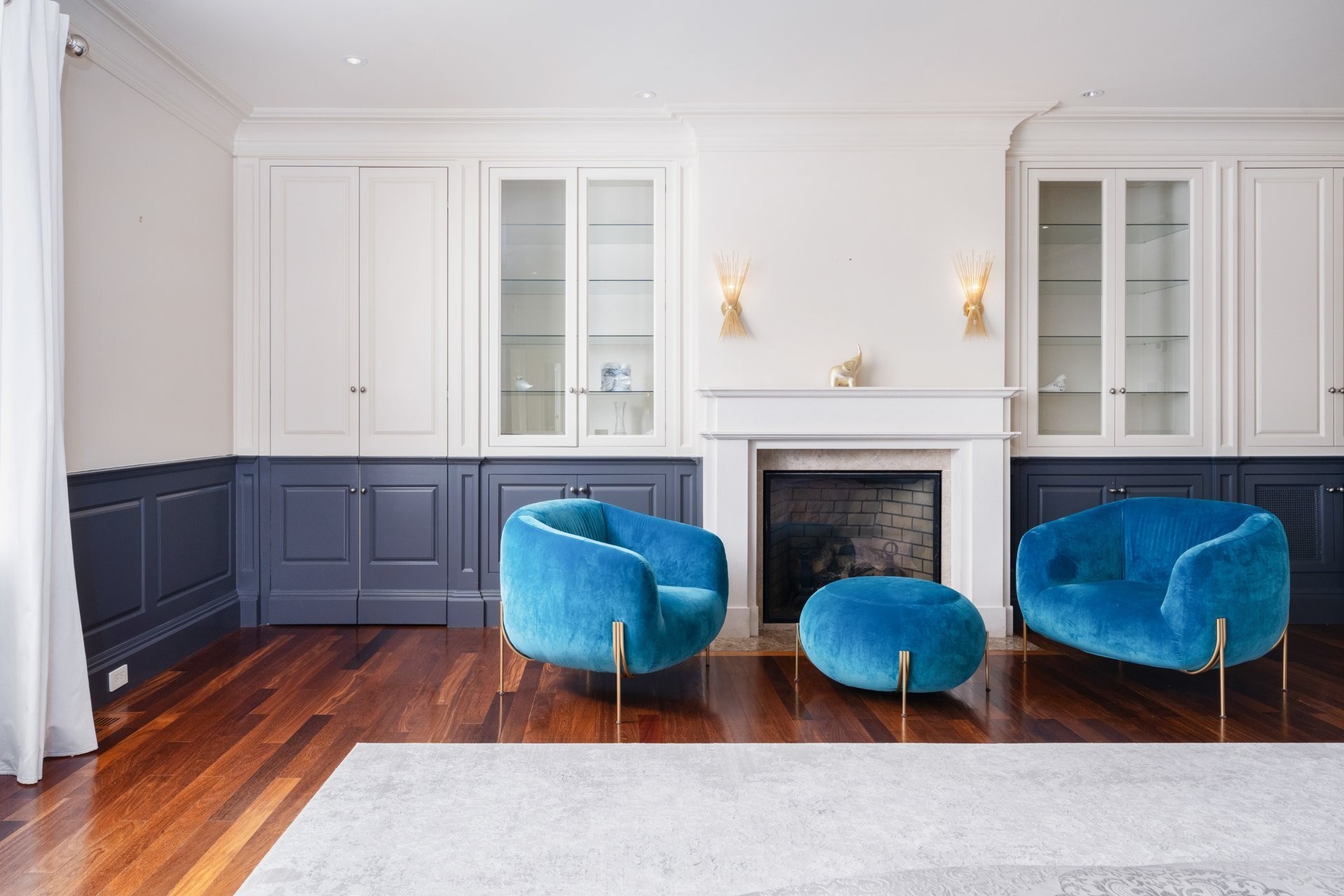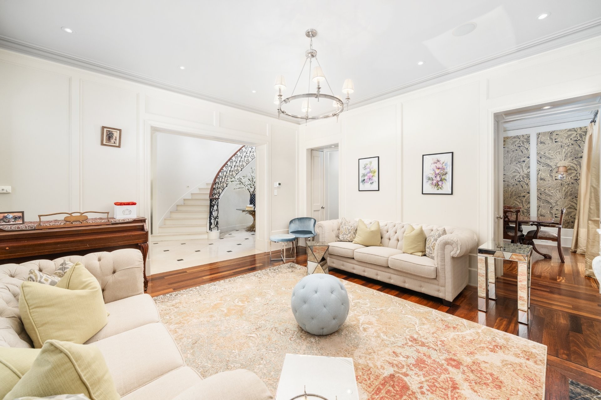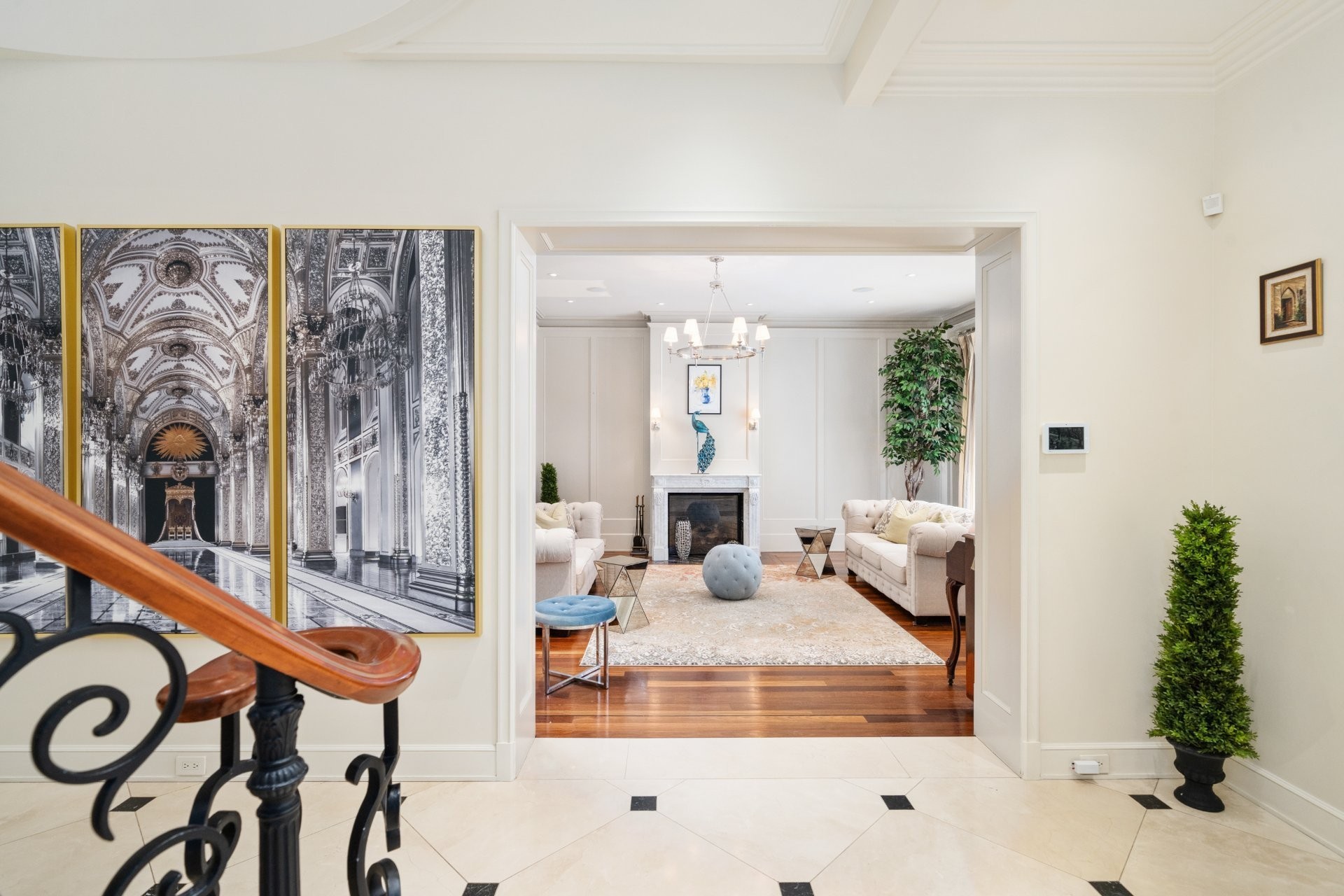 -Salon élégant aux plafonds hauts, moulures raffinées, foyer au gaz et grandes fenêtres.