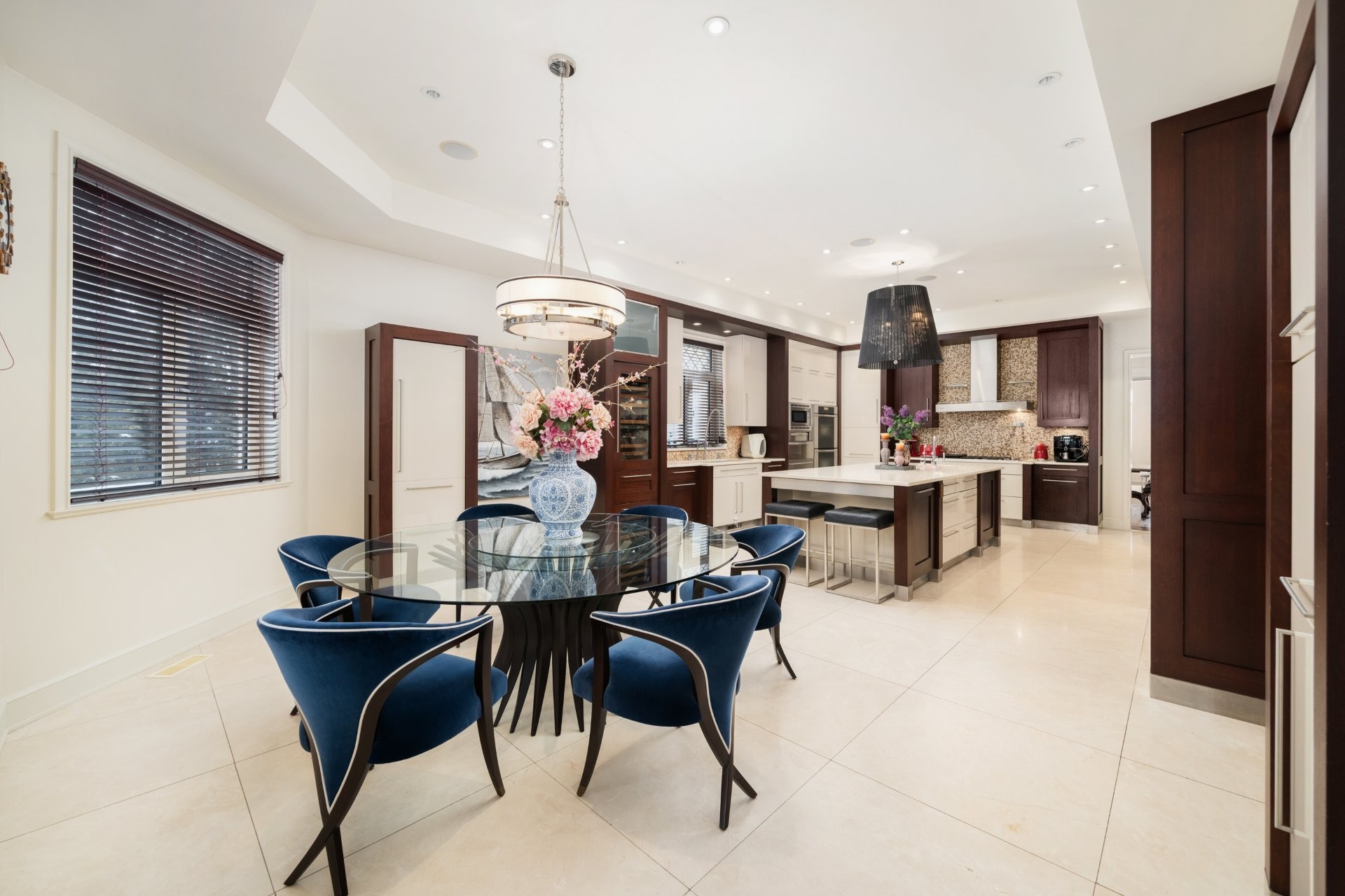 -Salle à manger spacieuse avec plancher en bois massif. Cuisine gastronomique avec îlot central, coin déjeuner et électroménagers haut de gamme :