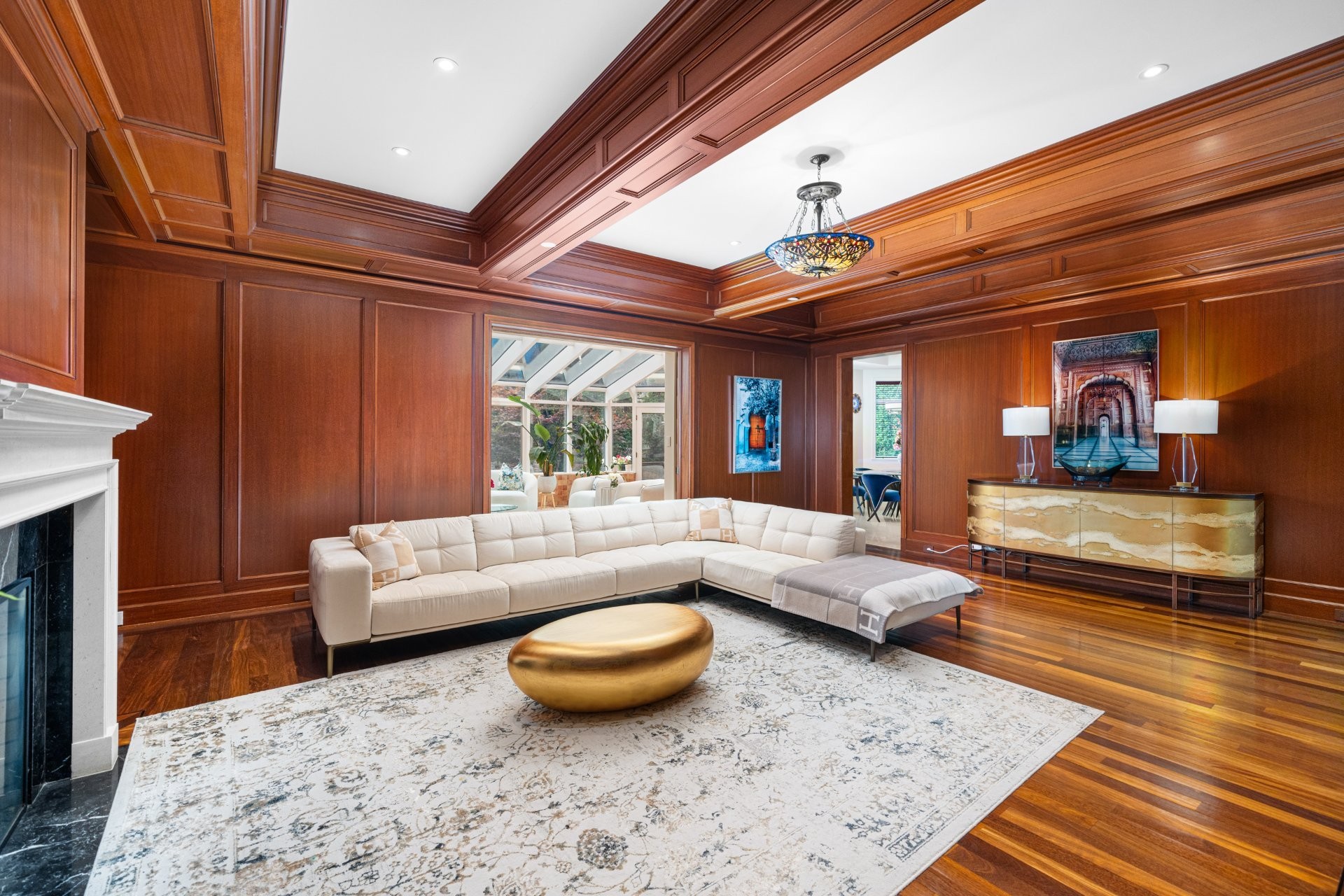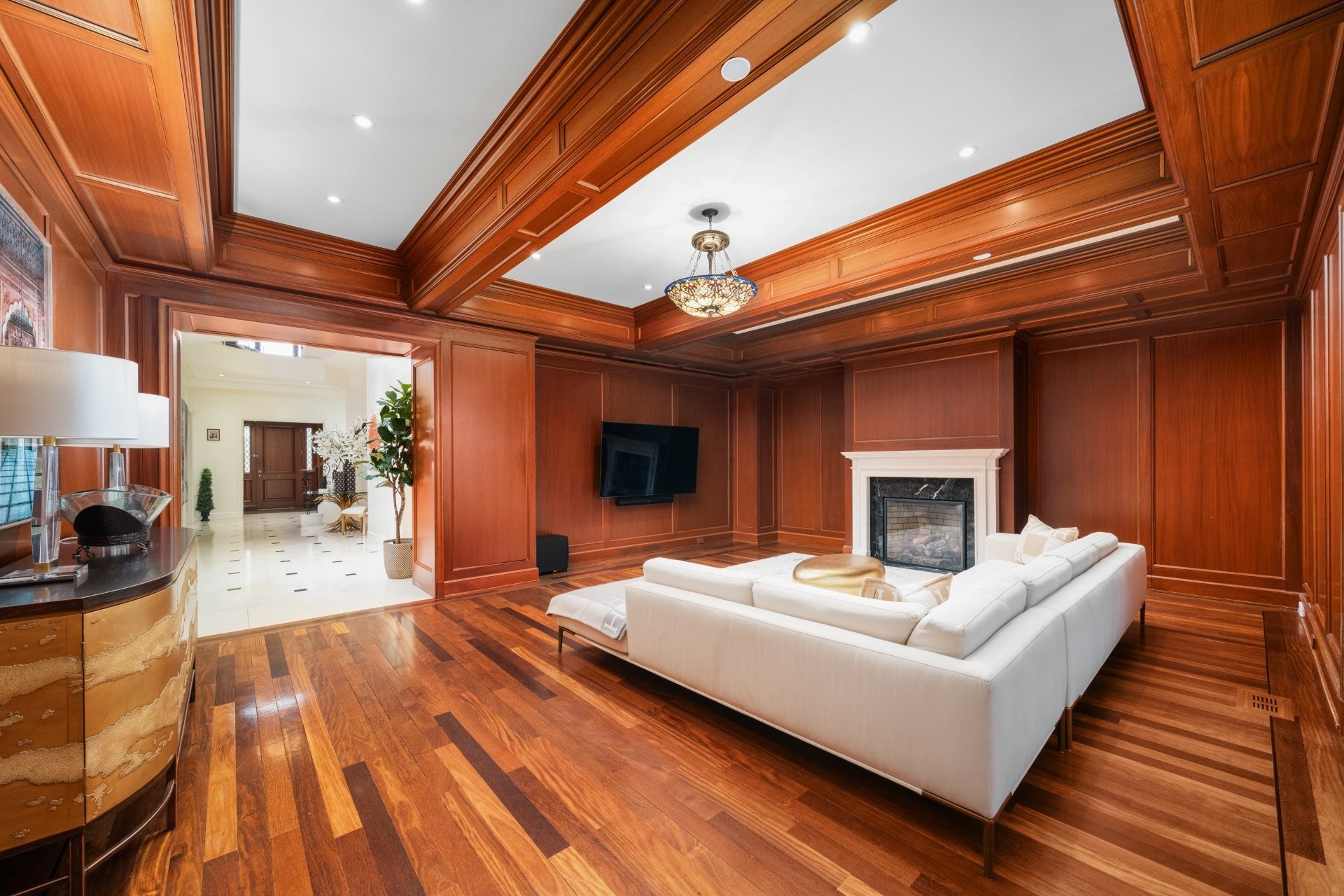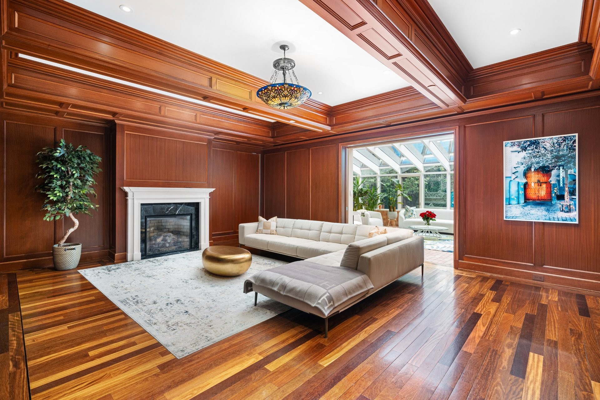 -Salle familiale chaleureuse avec foyer au gaz, boiseries du sol au plafond et portes coulissantes en bois et verre.
