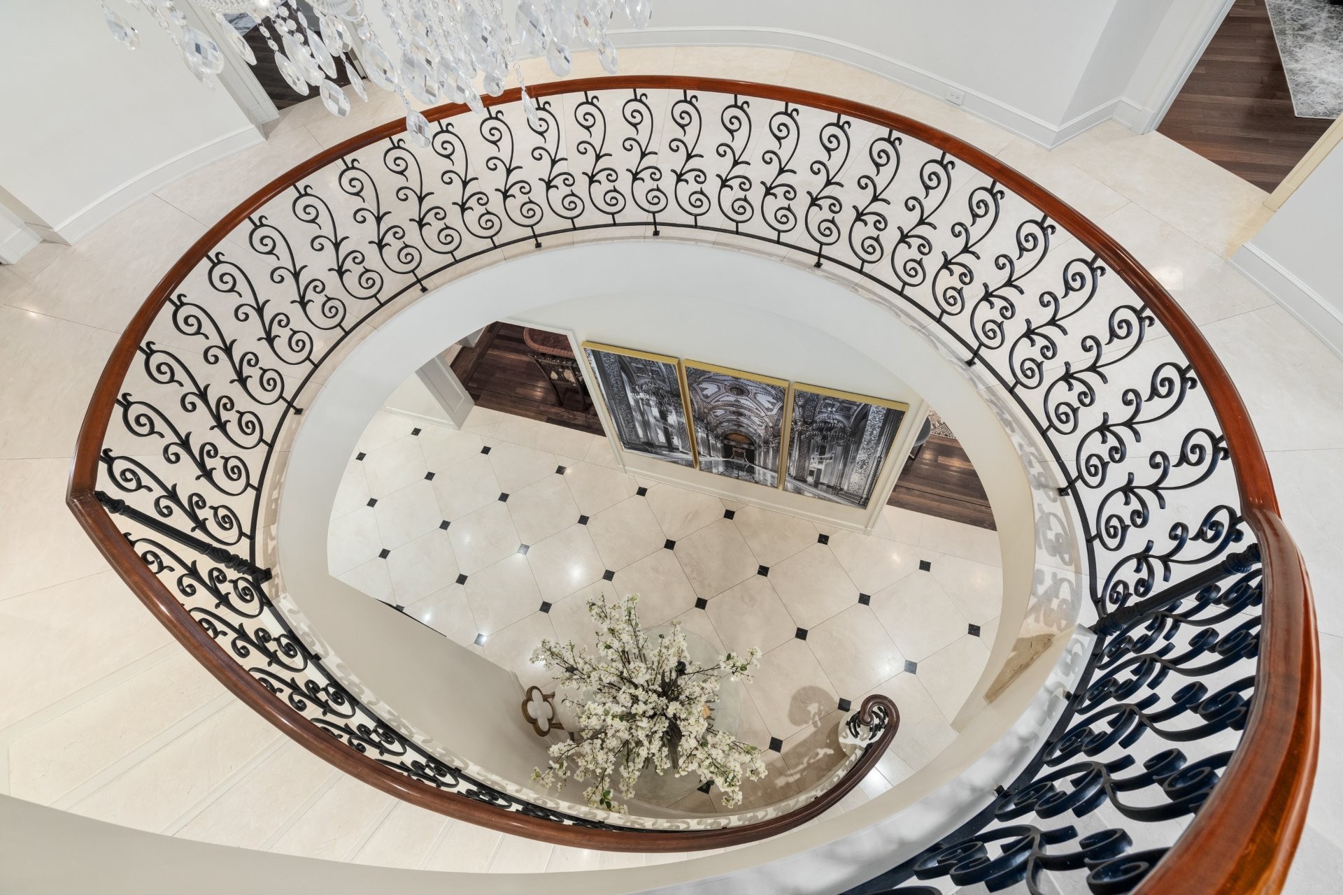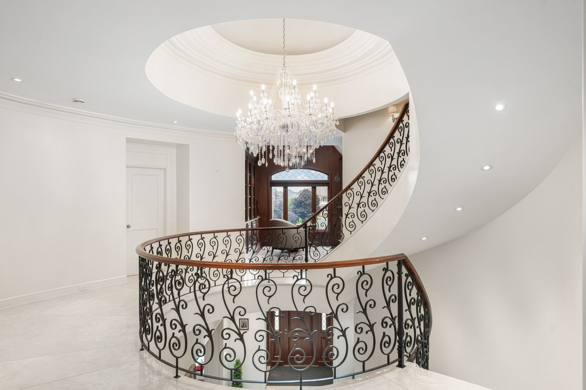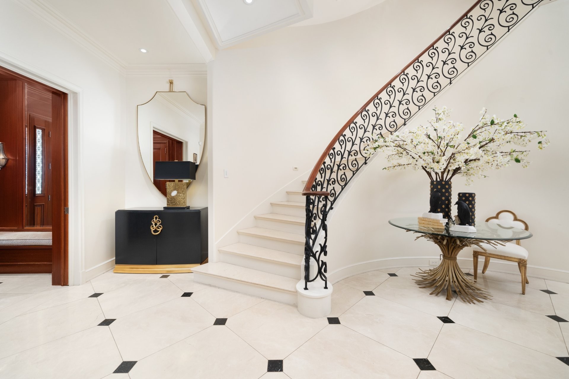 -Hall majestueux avec sol en marbre, menant à un grand escalier, une rampe en fer forgé et un impressionnant plafond cathédrale.