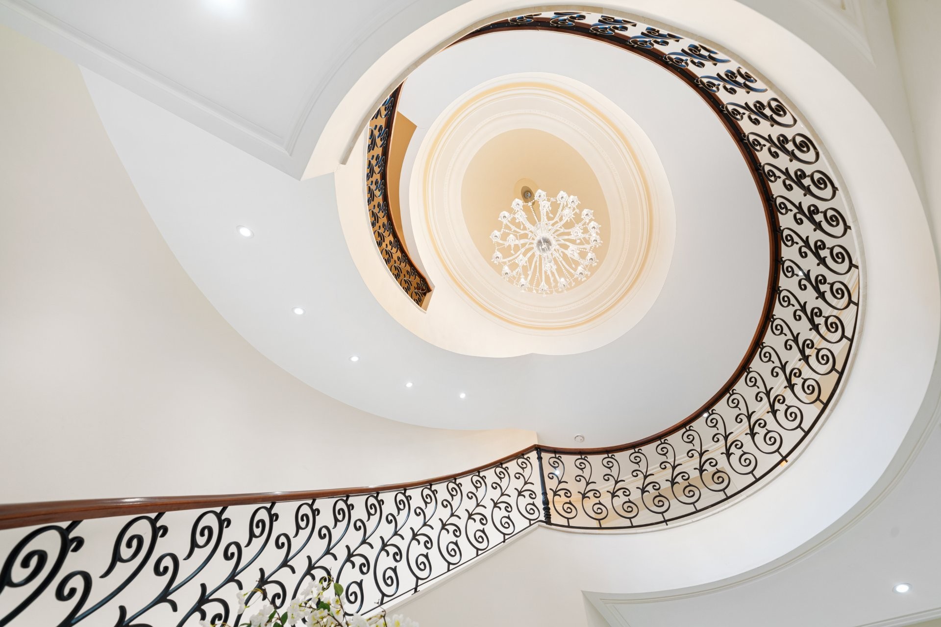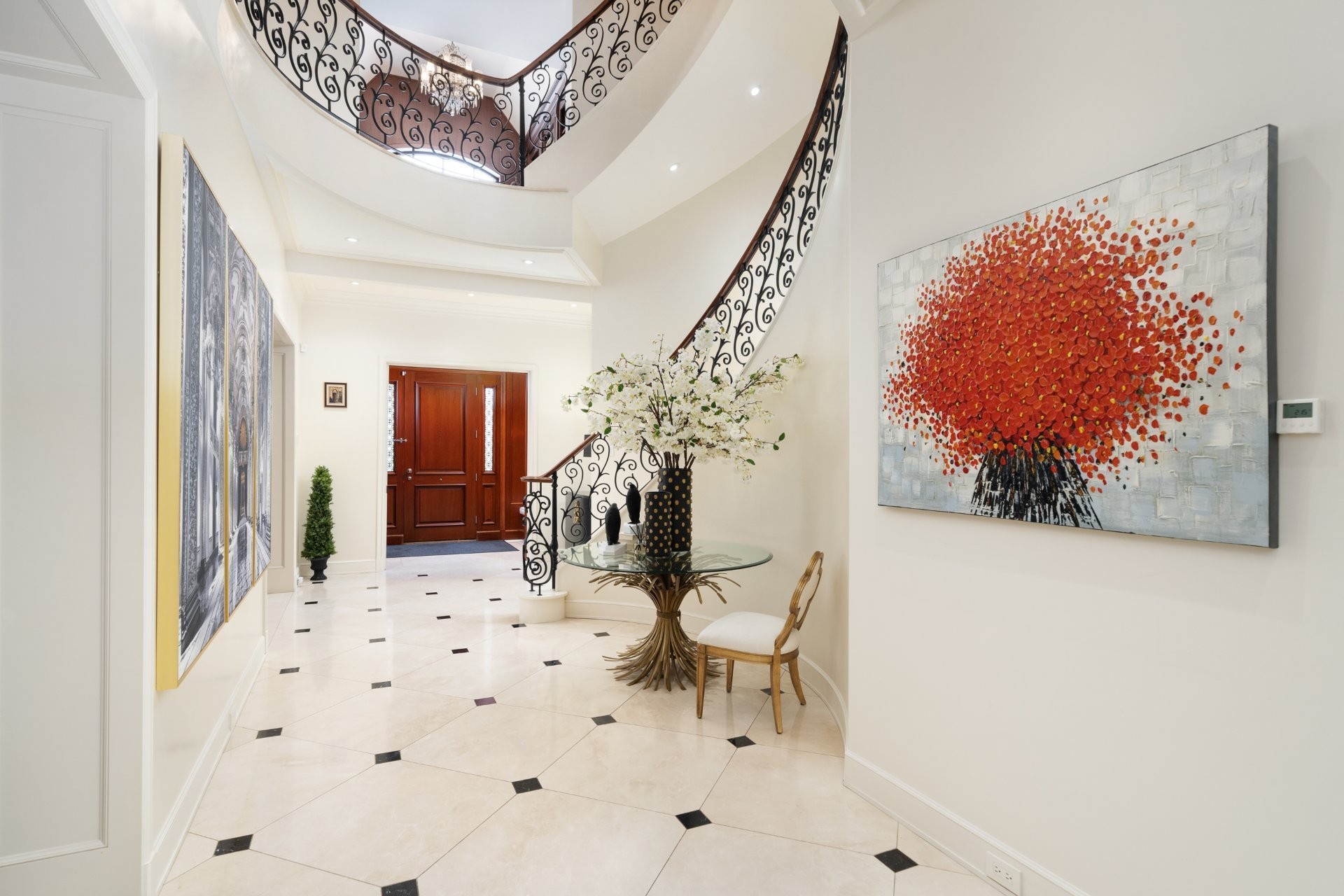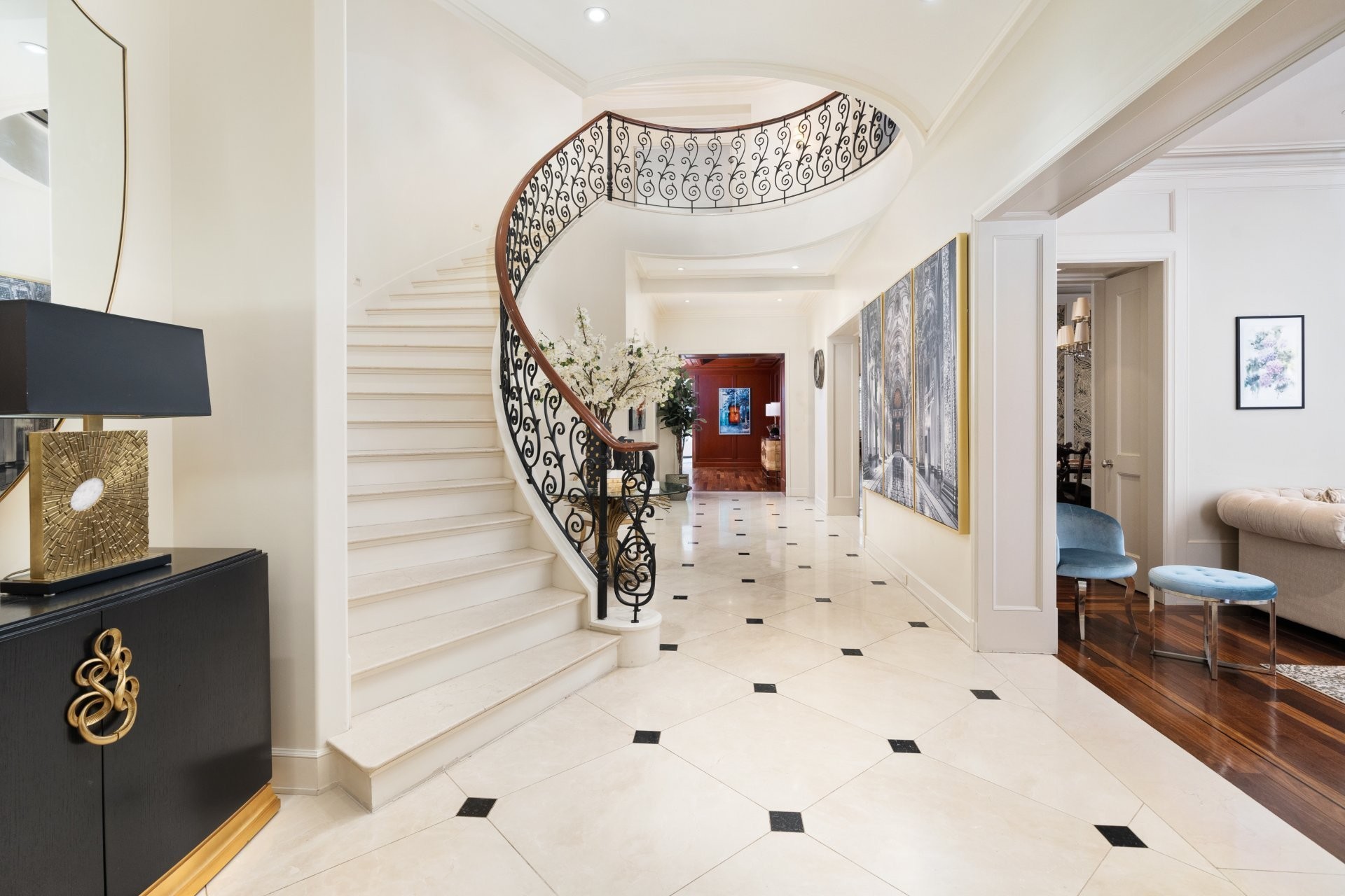 -Hall majestueux avec sol en marbre, menant à un grand escalier, une rampe en fer forgé et un impressionnant plafond cathédrale.