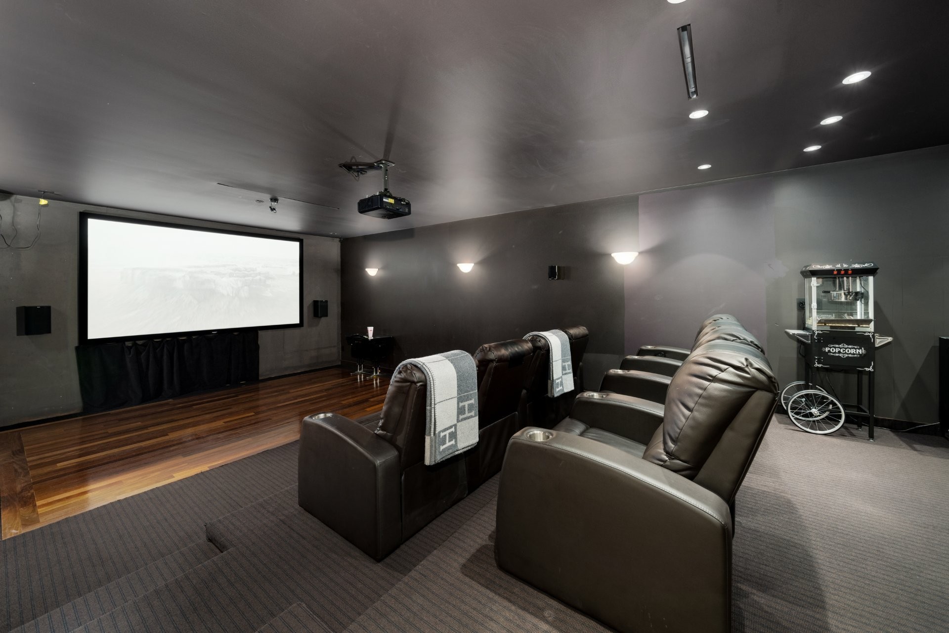 -Cinéma maison haut de gamme avec système multimédia mis à jour, projecteur et salle d'eau privée.