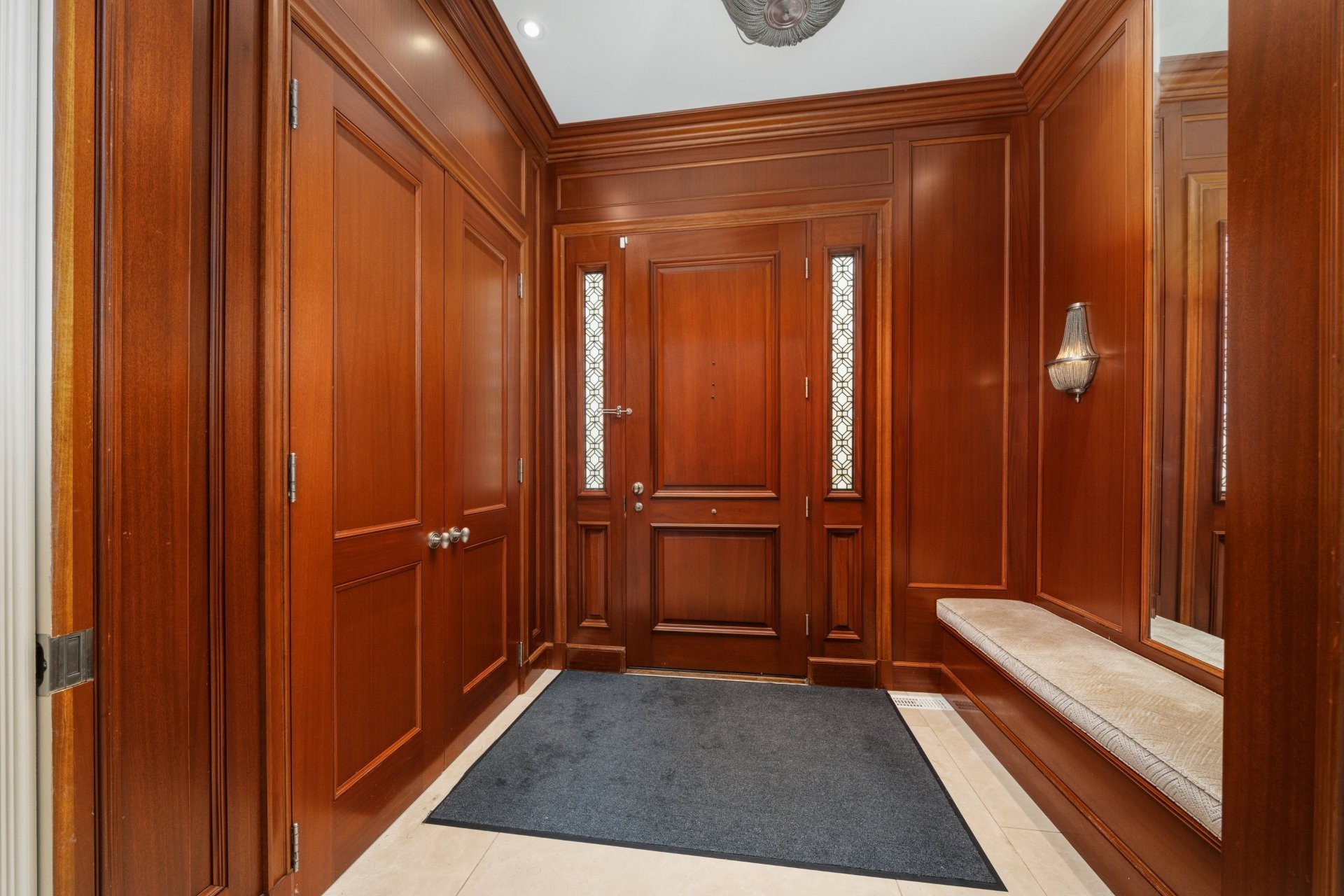 -Vestibule raffiné en bois avec banc intégré et spacieux vestiaire.