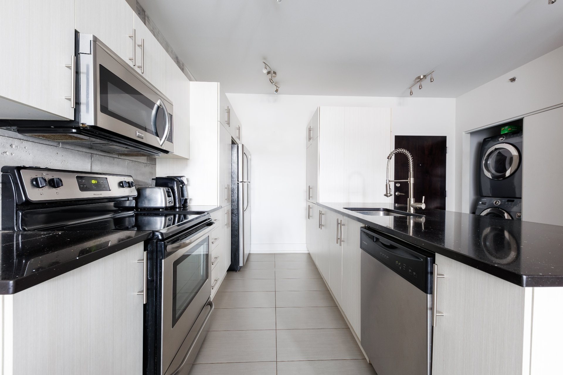 Cet appartement lumineux orienté à l'ouest bénéficie d'un agencement intelligent à aire ouverte avec îlot de cuisine en quartz, appareils électroménagers en acier inoxydable, climatisation, buanderie, espace bureau/flexible, grand balcon privé (barbecue autorisé) et parking intérieur chauffé. Le système central d'eau chaude permet de réduire les factures d'électricité.