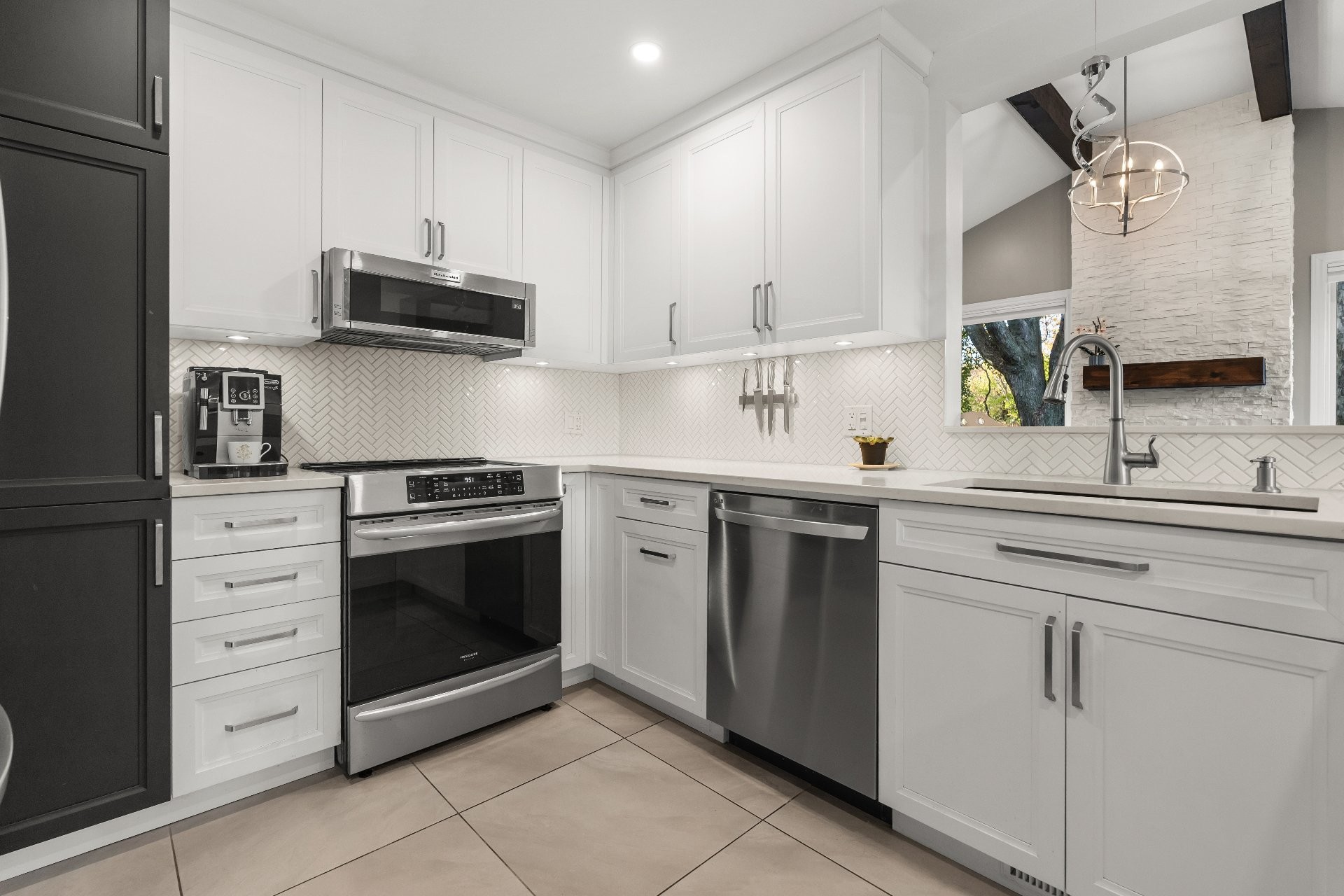 Appareils électroménagers de cuisine : four, réfrigérateur, lave-vaisselle, micro-ondes. Appareils électroménagers pour la buanderie : lave-linge et sèche-linge. Stores