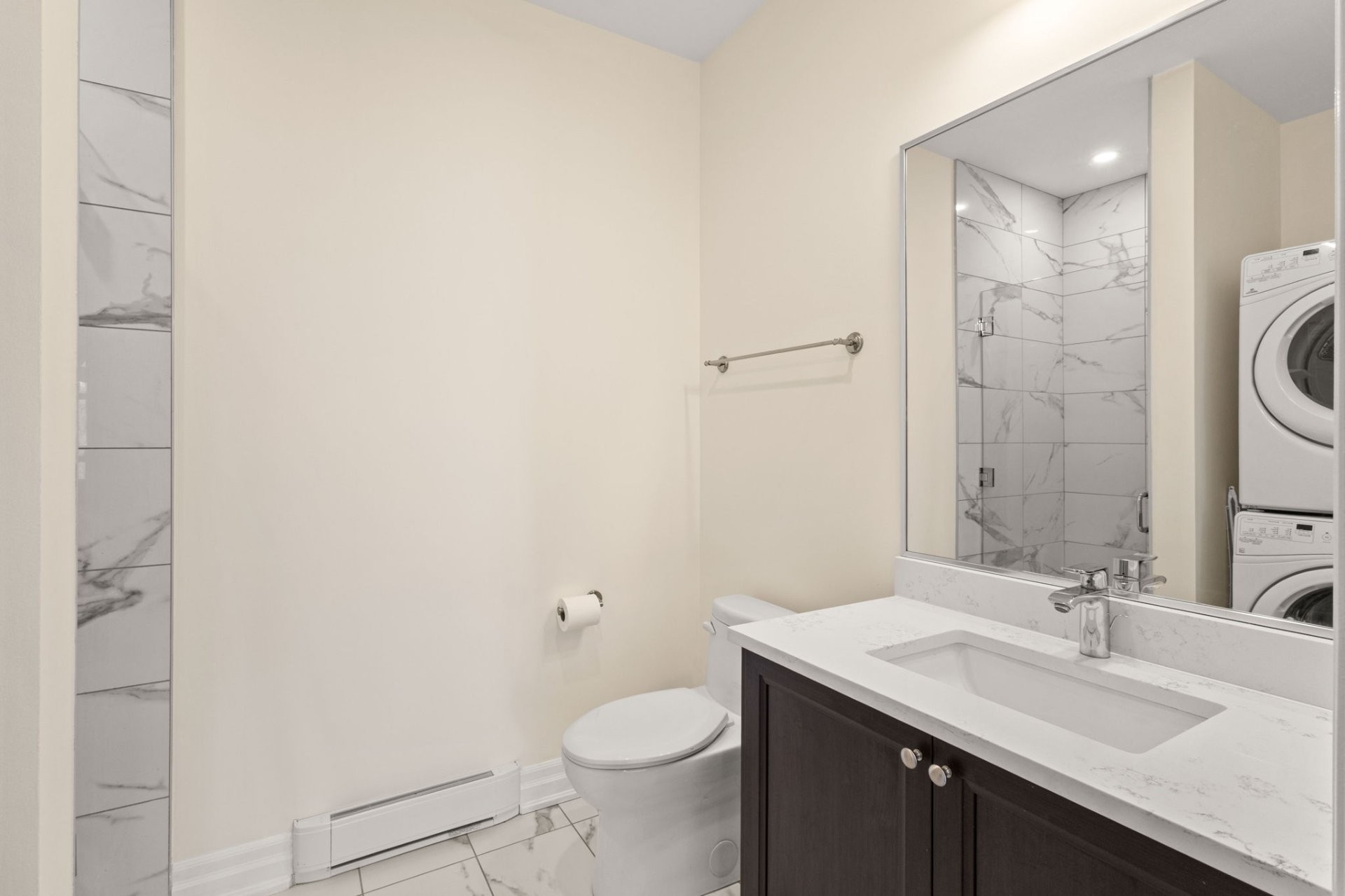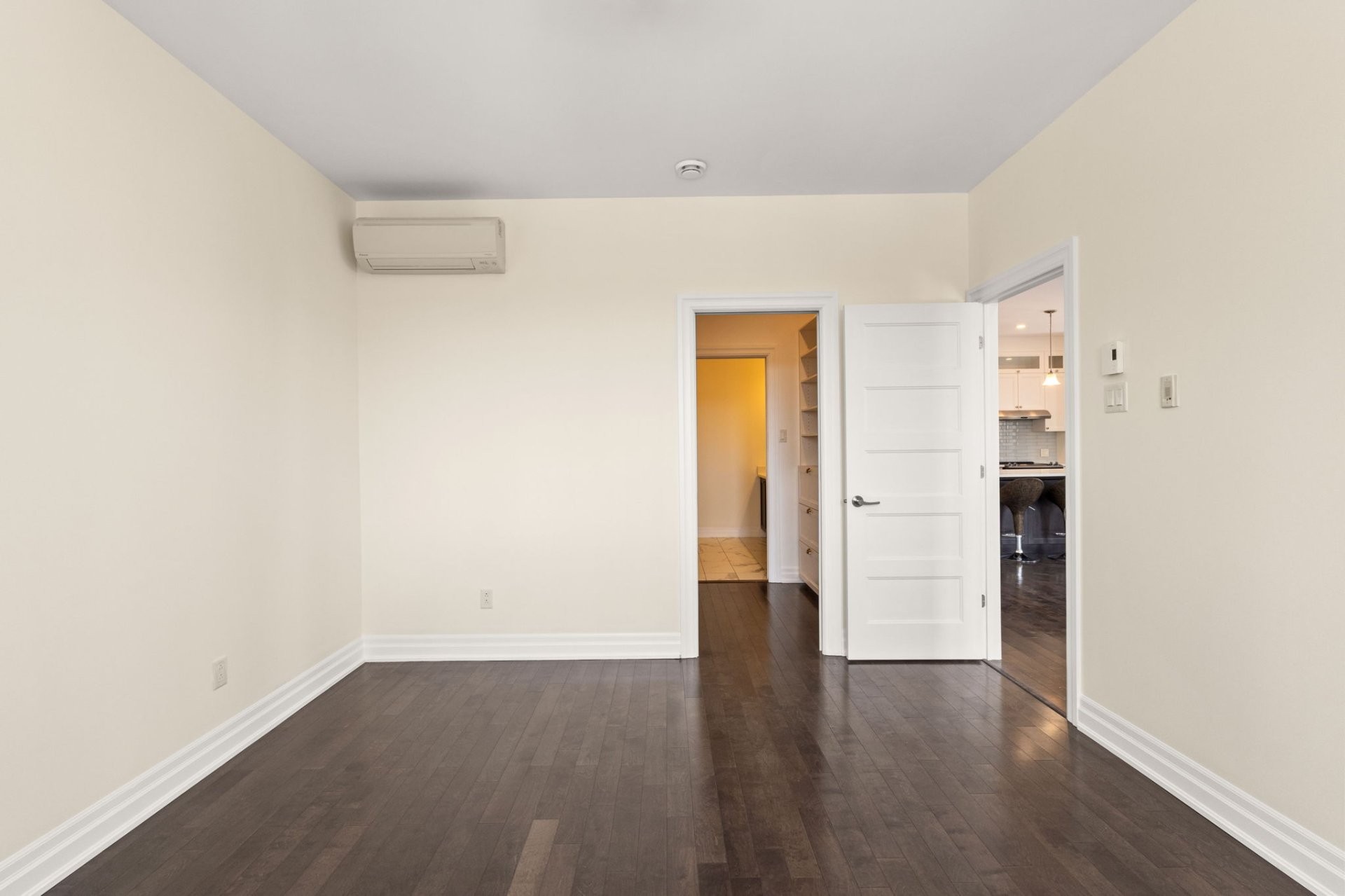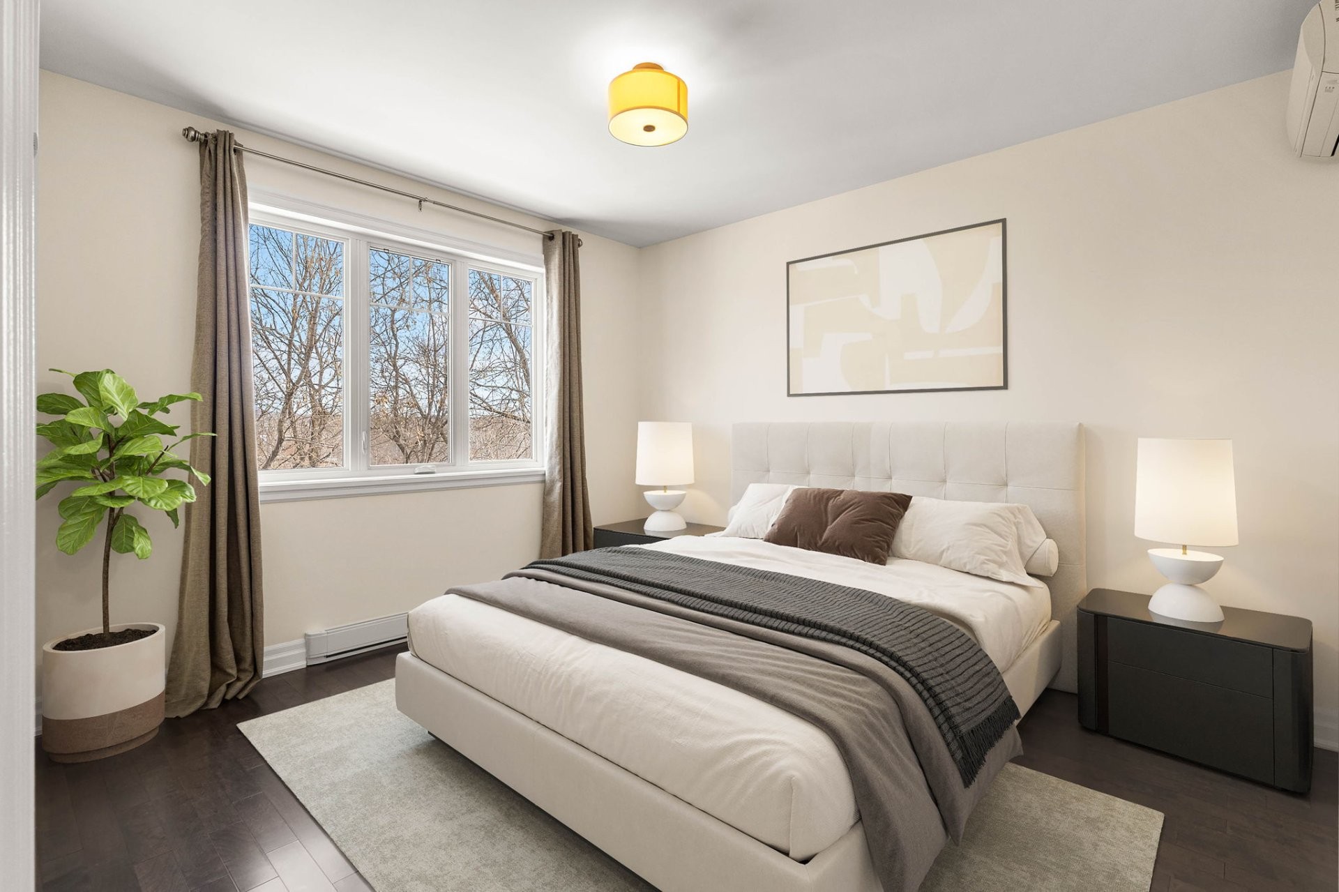La suite principale propose un espace de vie luxueux avec walk-in sur mesure et salle de bain attenante dotée de planchers chauffants, d'une douche en verre et d'un bain séparé. Une deuxième chambre spacieuse ainsi qu'une salle de bain complète supplémentaire avec douche en verre offrent confort et flexibilité.