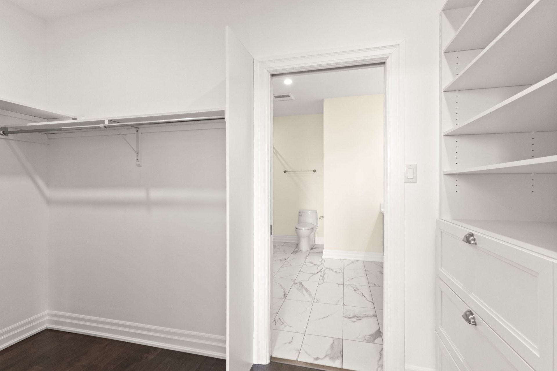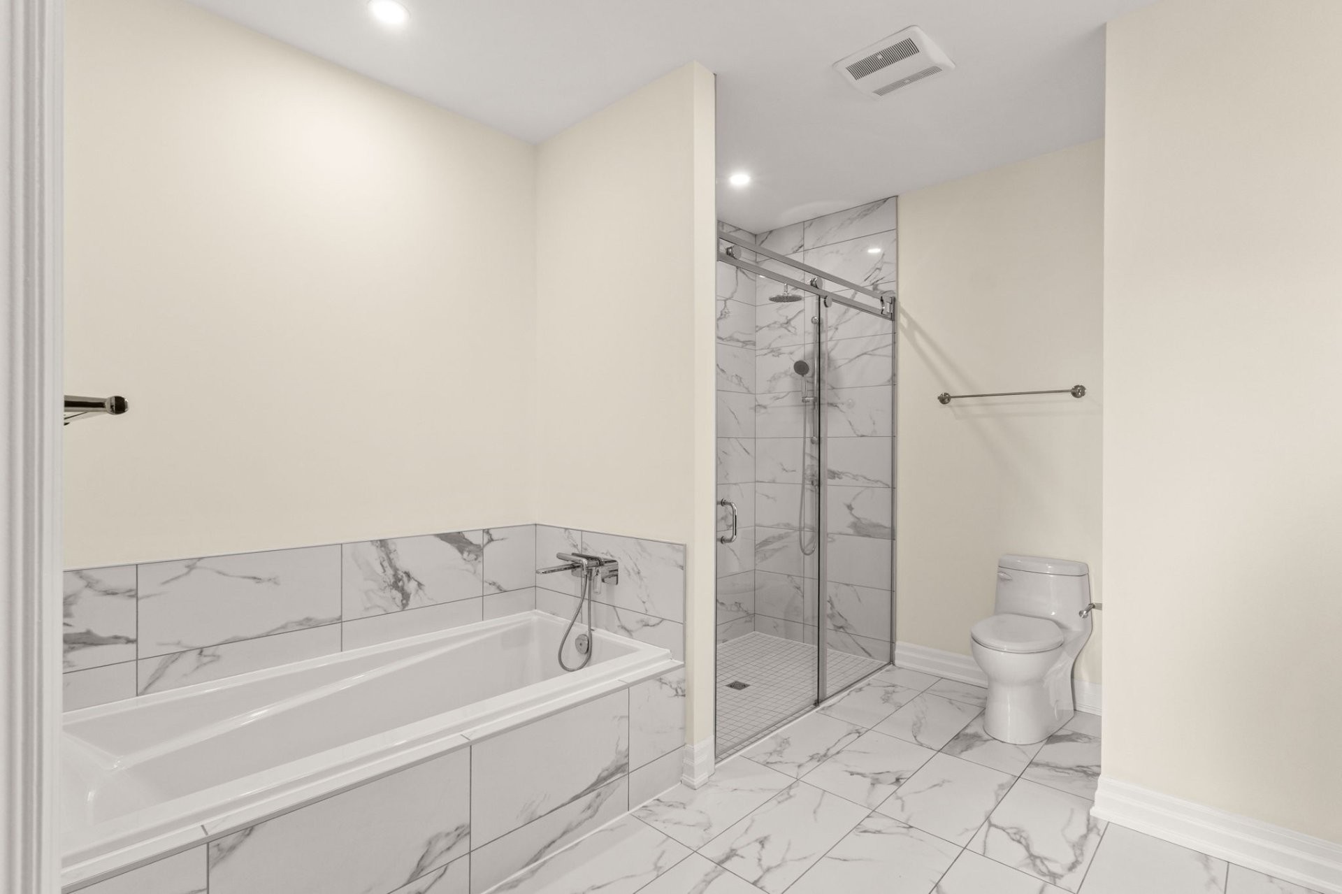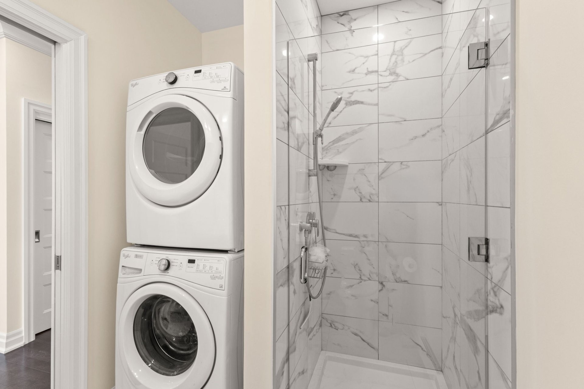 La suite principale propose un espace de vie luxueux avec walk-in sur mesure et salle de bain attenante dotée de planchers chauffants, d'une douche en verre et d'un bain séparé. Une deuxième chambre spacieuse ainsi qu'une salle de bain complète supplémentaire avec douche en verre offrent confort et flexibilité.