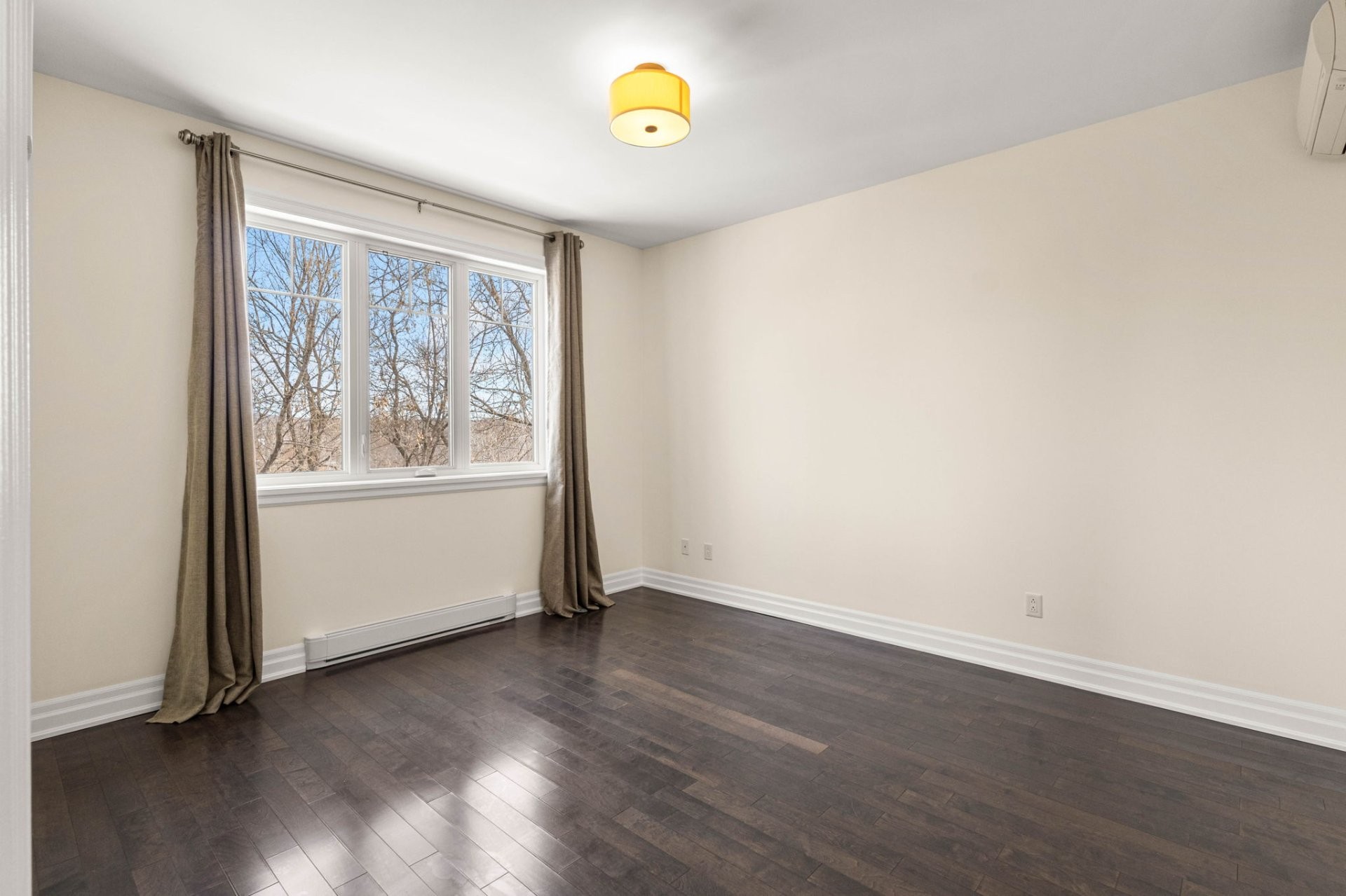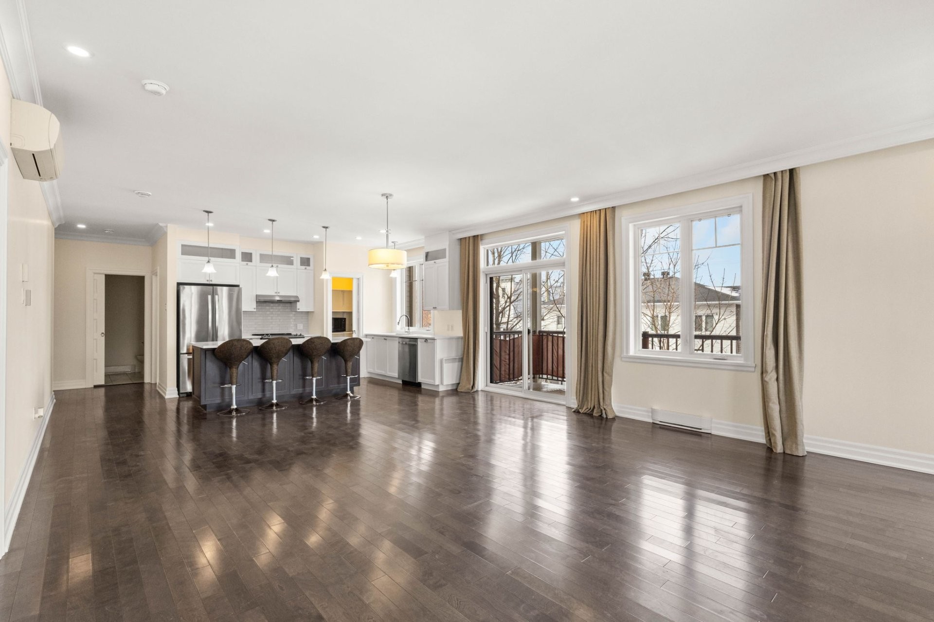 Réfrigérateur, cuisinière, laveuse, sécheuse, lave-vaisselle, micro-ondes, tabourets de bar pour l'îlot, rideaux, 2 thermopompes murales.