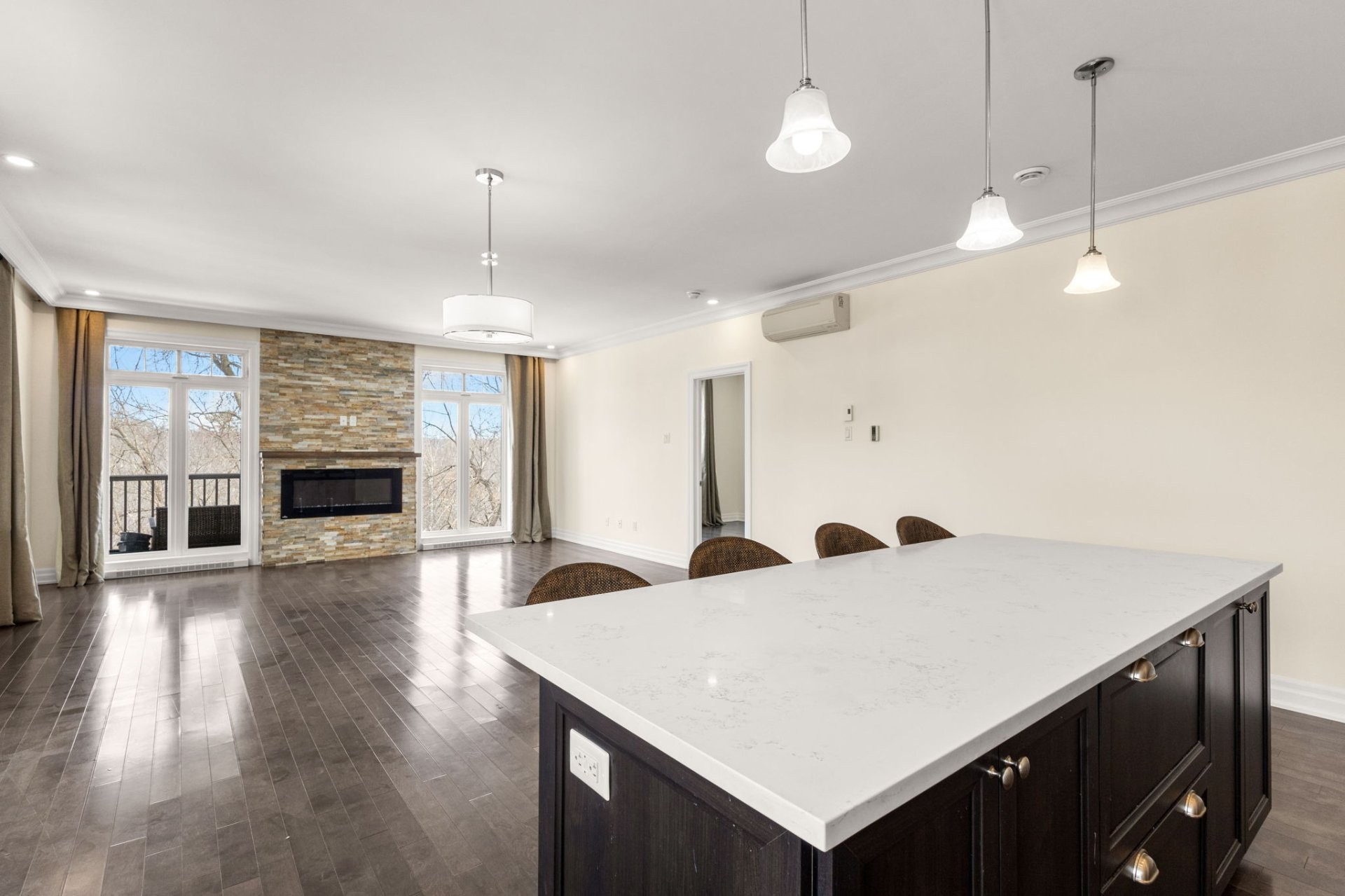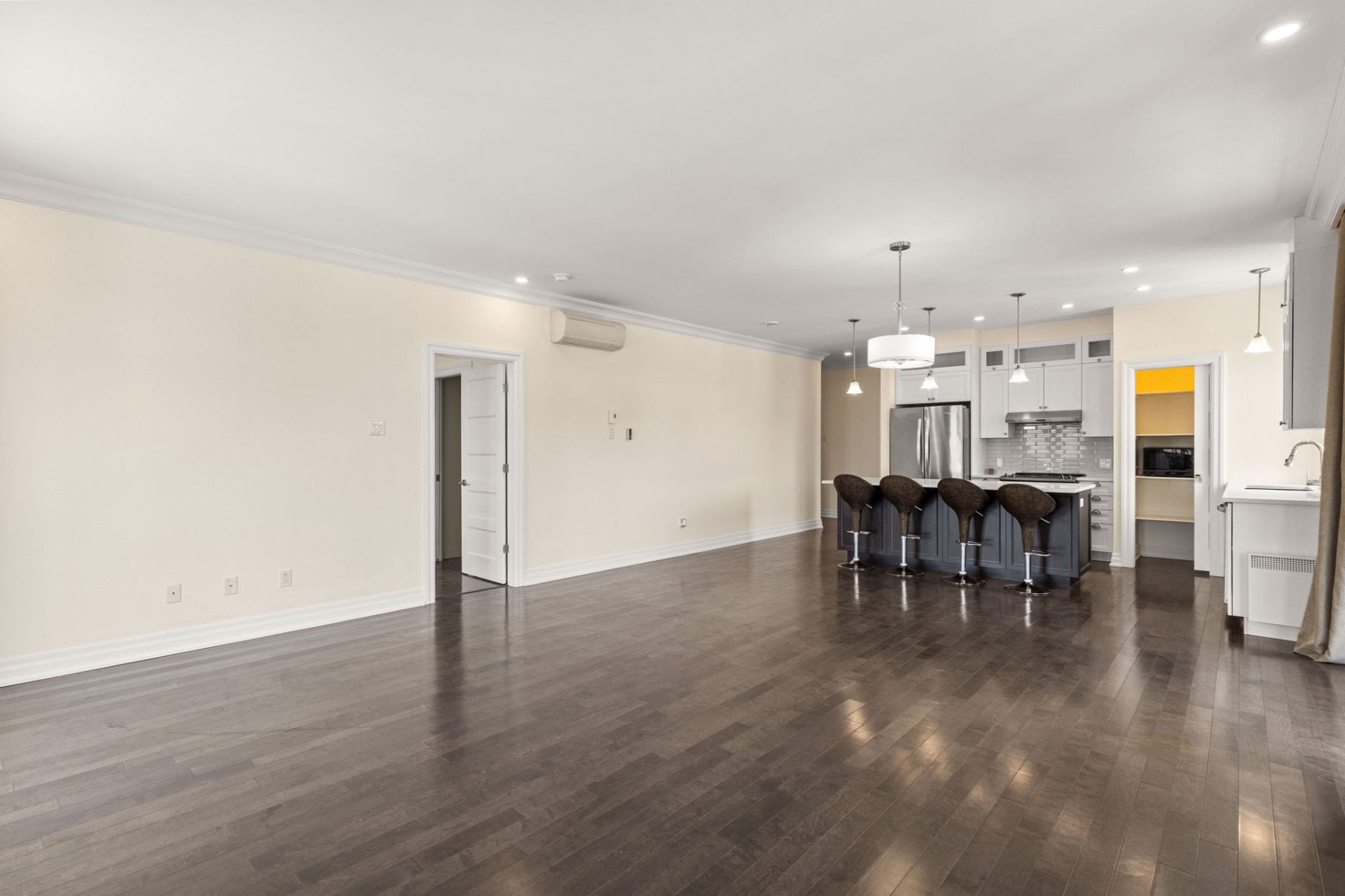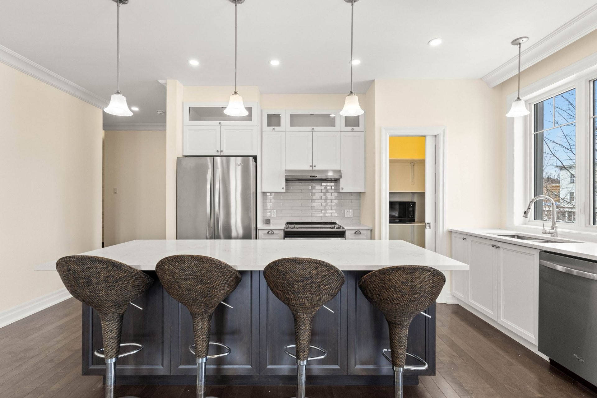 Lumineuse et spacieuse, cette unité offre une cuisine haut de gamme alliant style et fonctionnalité, avec armoires pleine hauteur, comptoirs en quartz, grand îlot central avec coin repas, double évier, garde-manger walk-in et électroménagers en acier inoxydable.