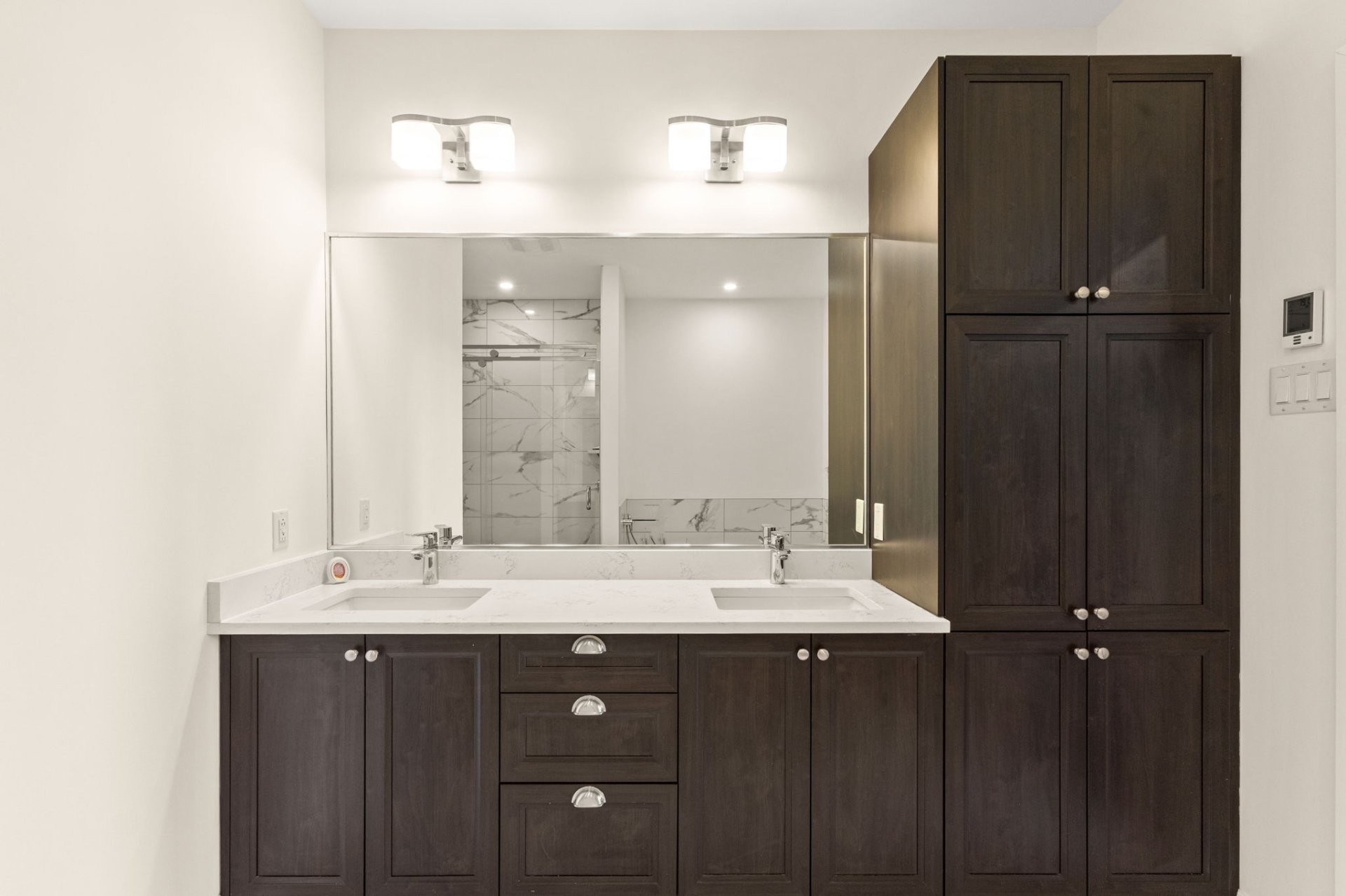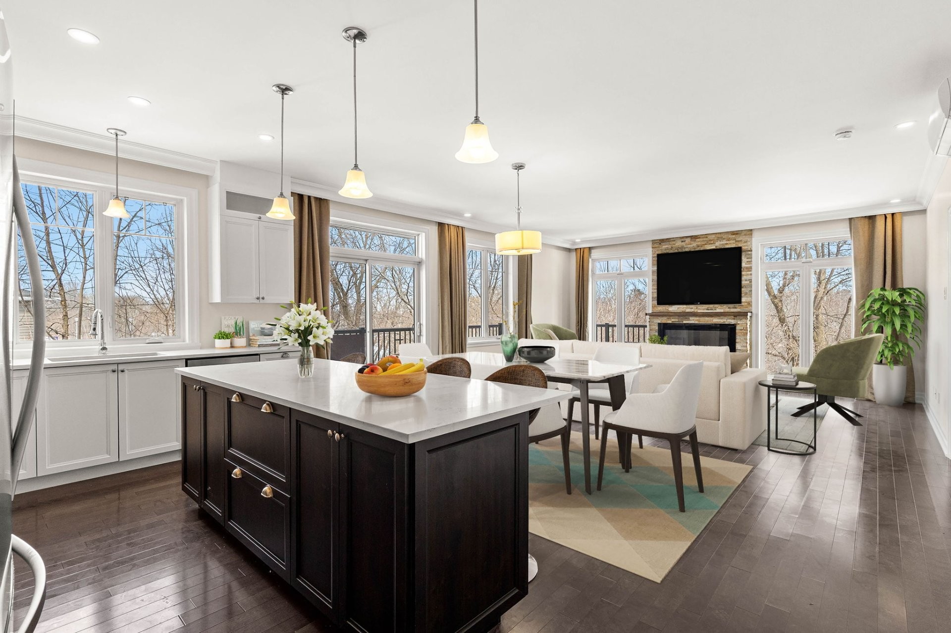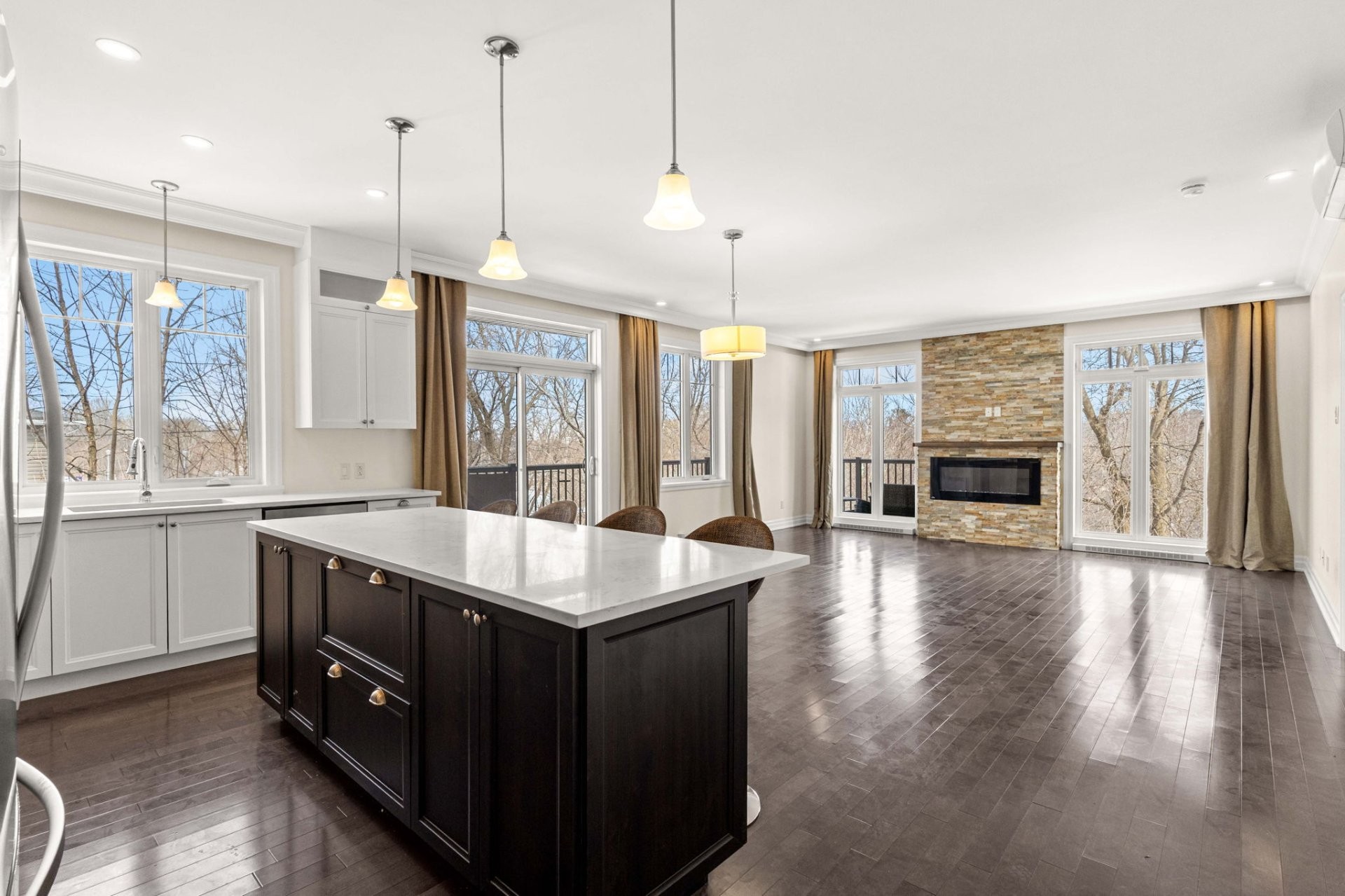 Lumineuse et spacieuse, cette unité offre une cuisine haut de gamme alliant style et fonctionnalité, avec armoires pleine hauteur, comptoirs en quartz, grand îlot central avec coin repas, double évier, garde-manger walk-in et électroménagers en acier inoxydable.