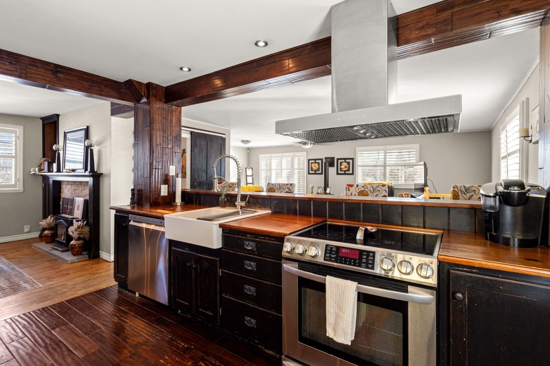 Réfrigérateur, lave-vaisselle, cuisinière, & foyer au gaz.
