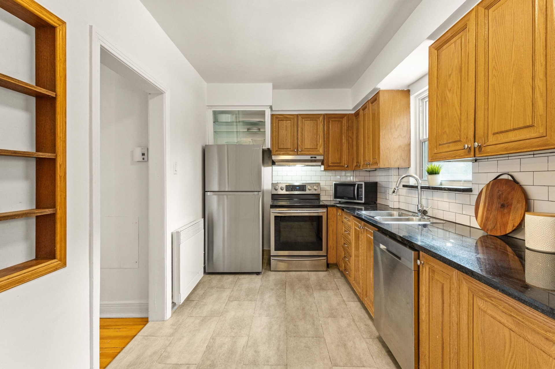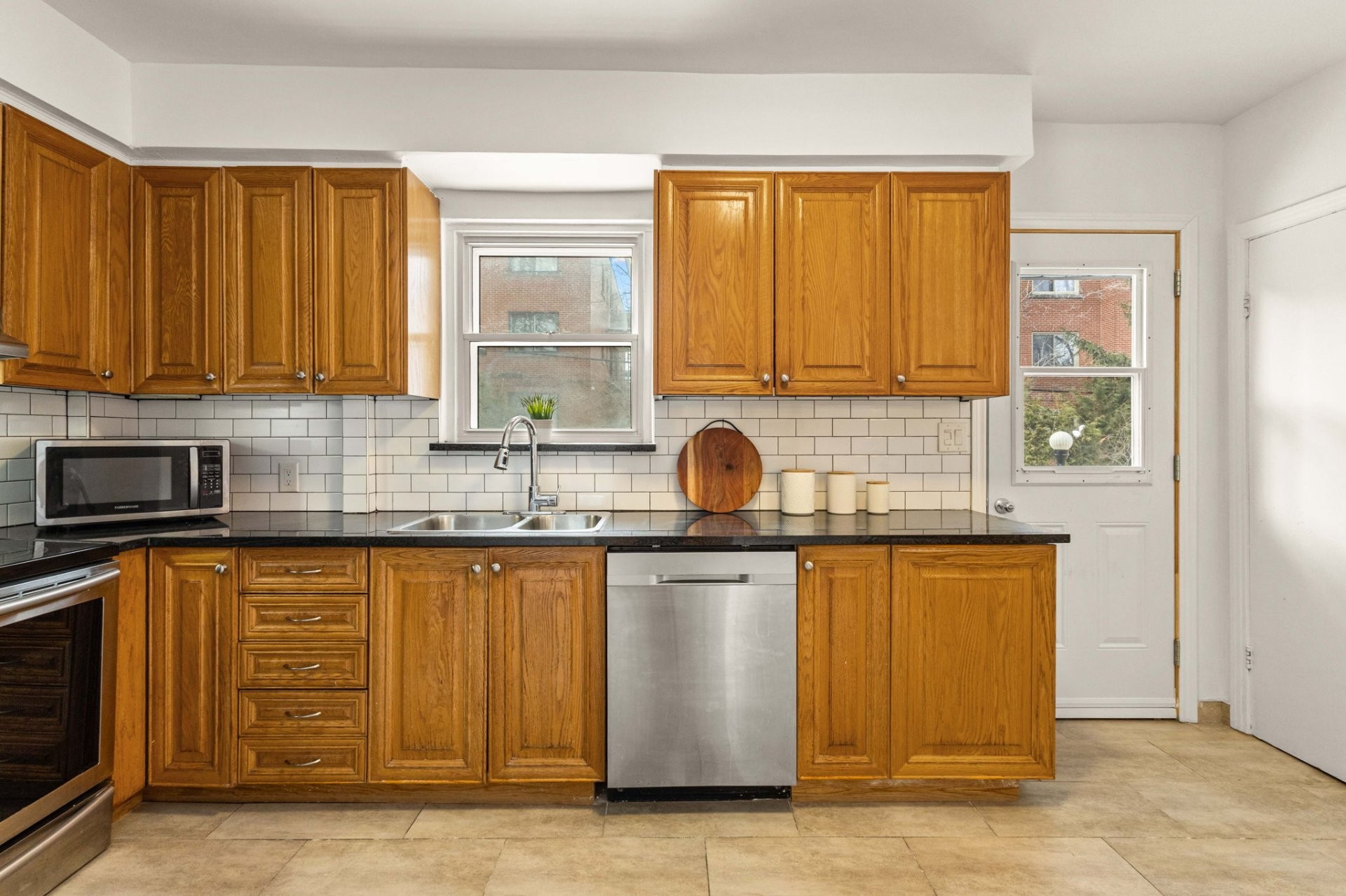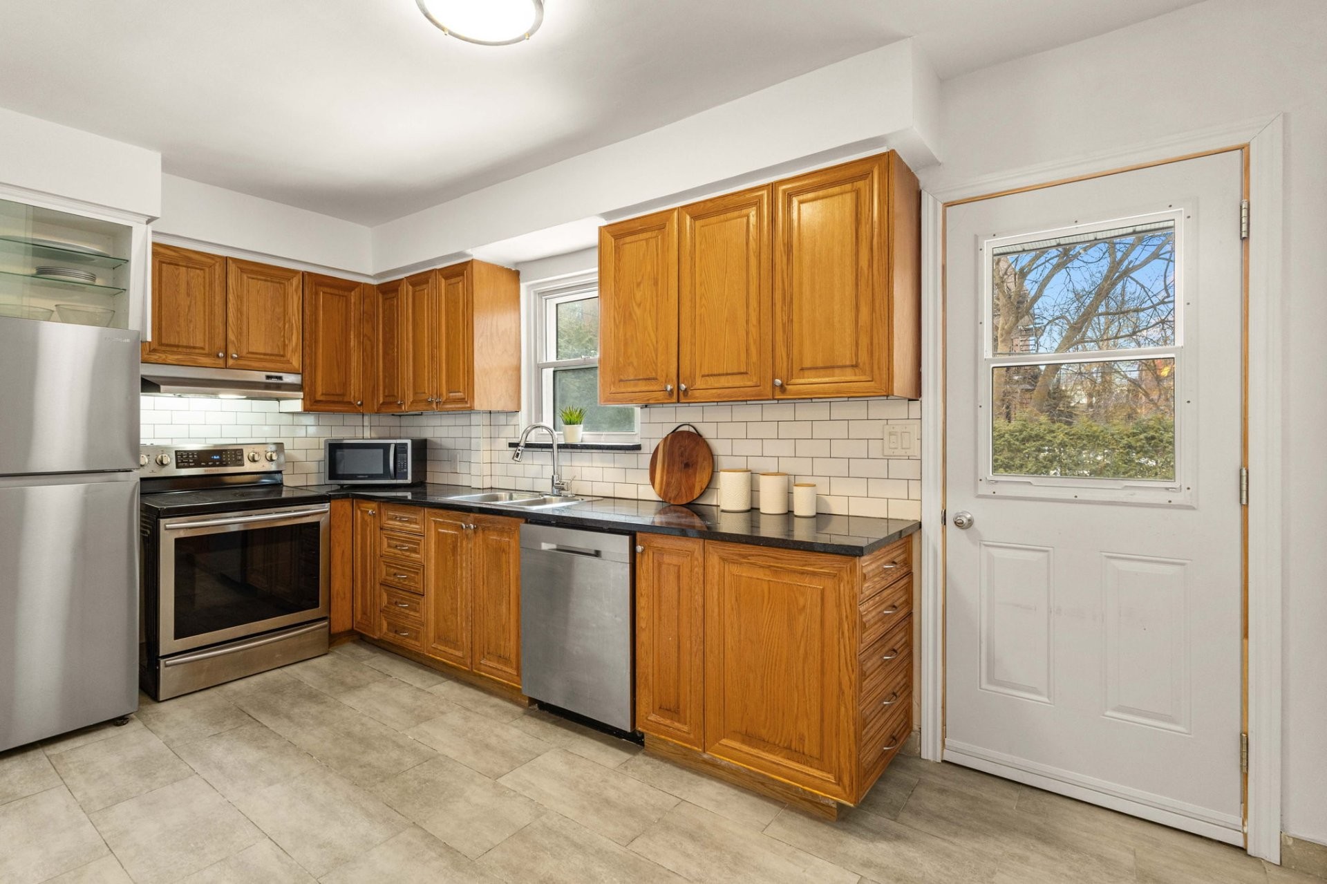 - Cuisine avec beaucoup de rangement et un grand garde-manger walk-in, avec accès au patio couvert à l'arrière et accès complet à la cour