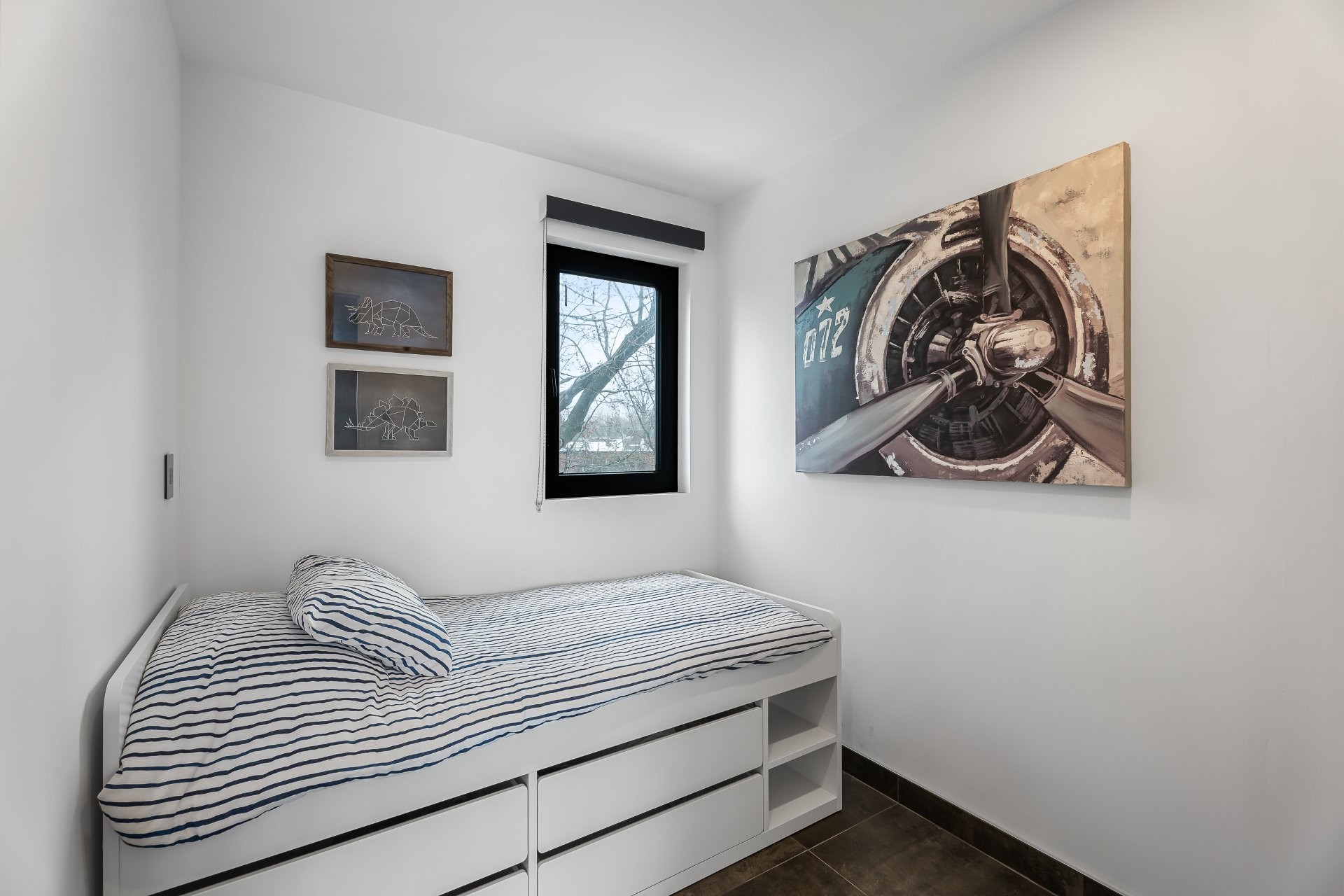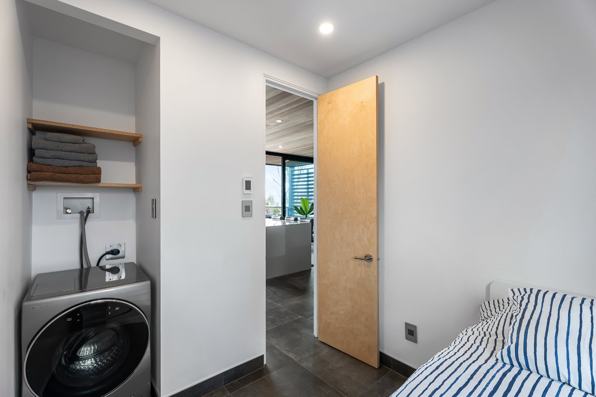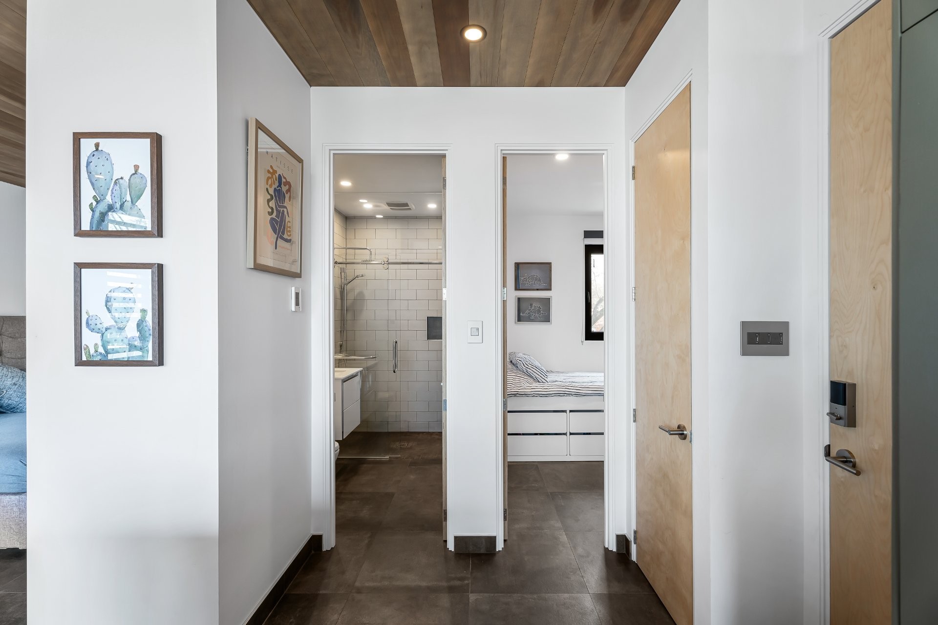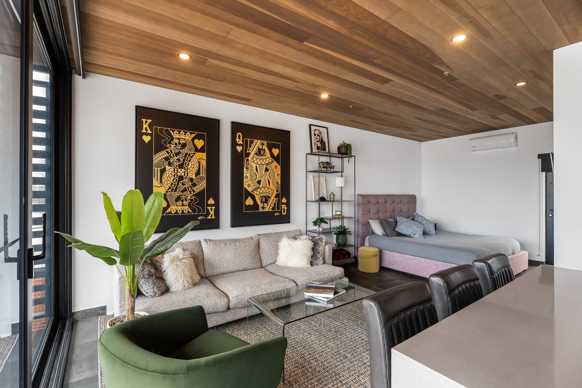 L'espace de vie, baigné de lumière naturelle, comprend une chambre principale à aire ouverte, ainsi qu'une seconde pièce fermée, idéale comme bureau privé ou chambre d'invités. Le tout est conçu pour répondre aux plus hautes attentes en matière de confort et de fonctionnalité.