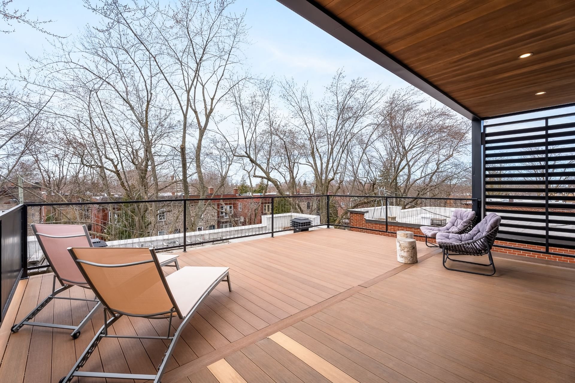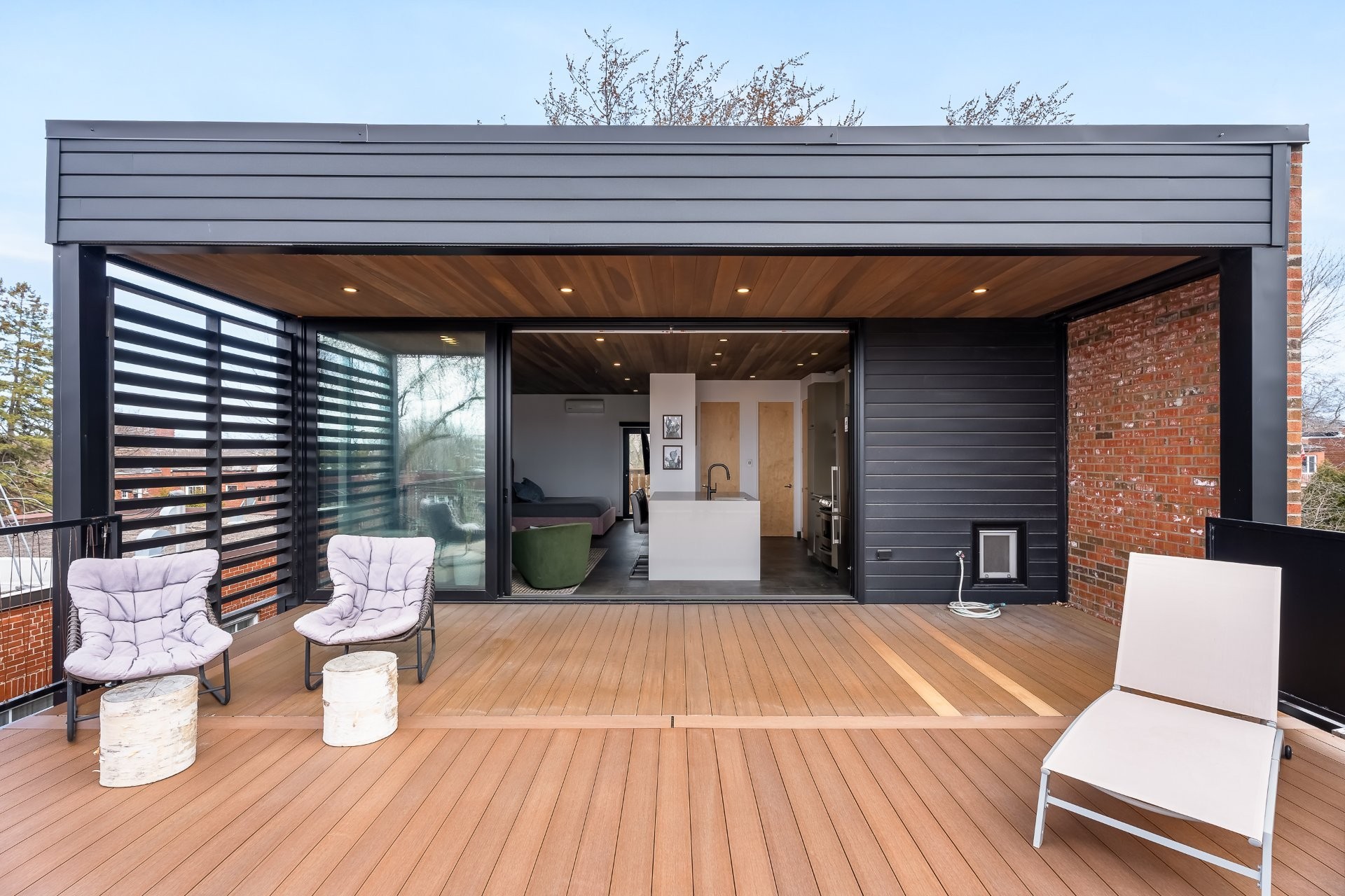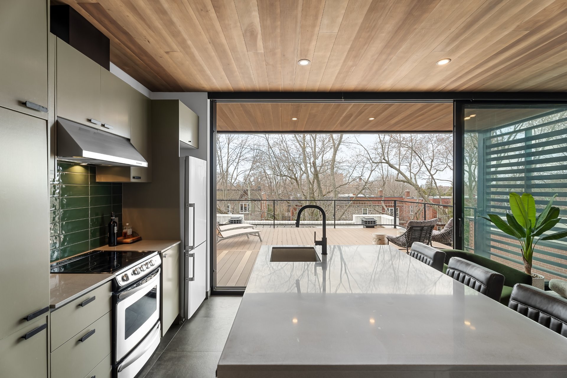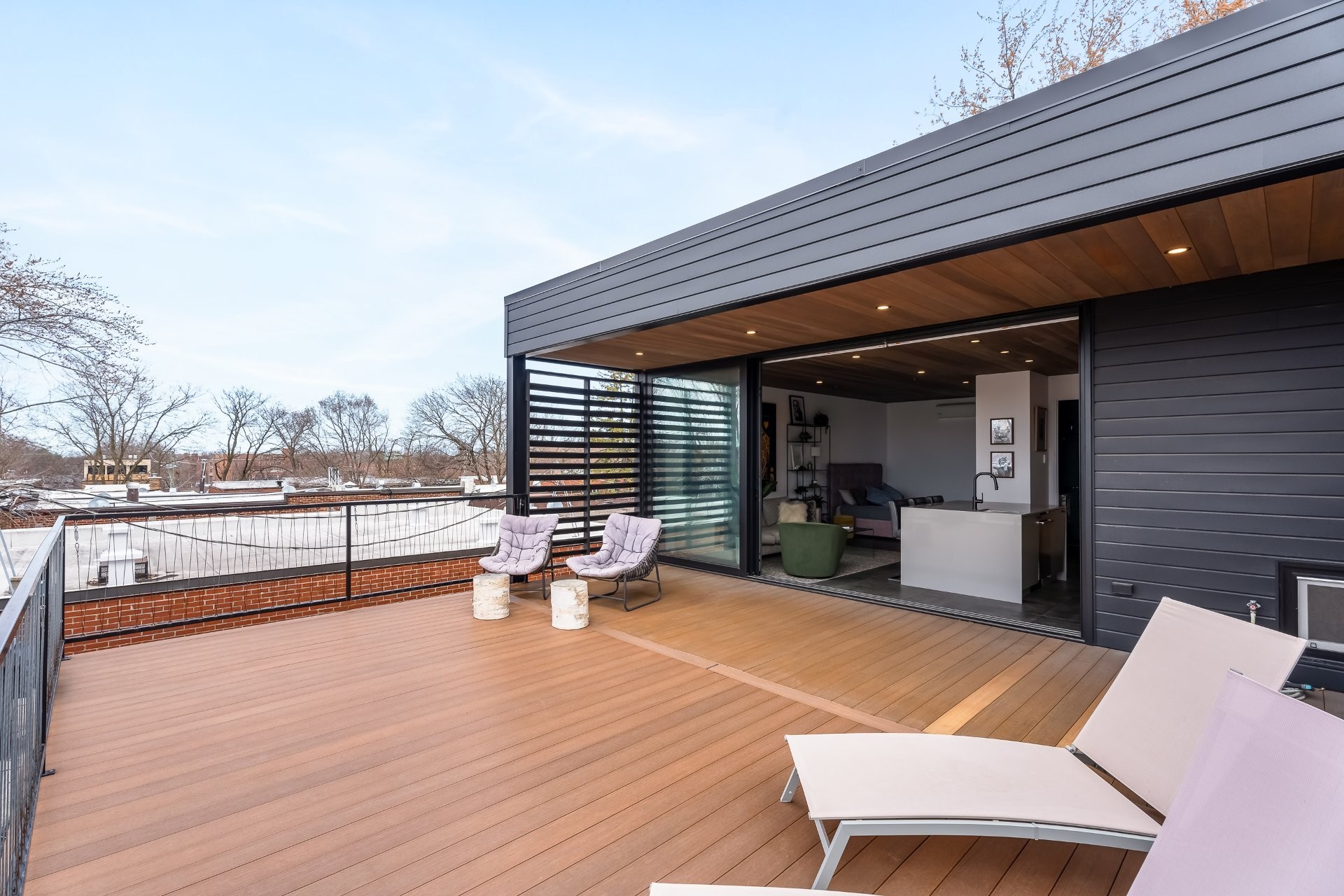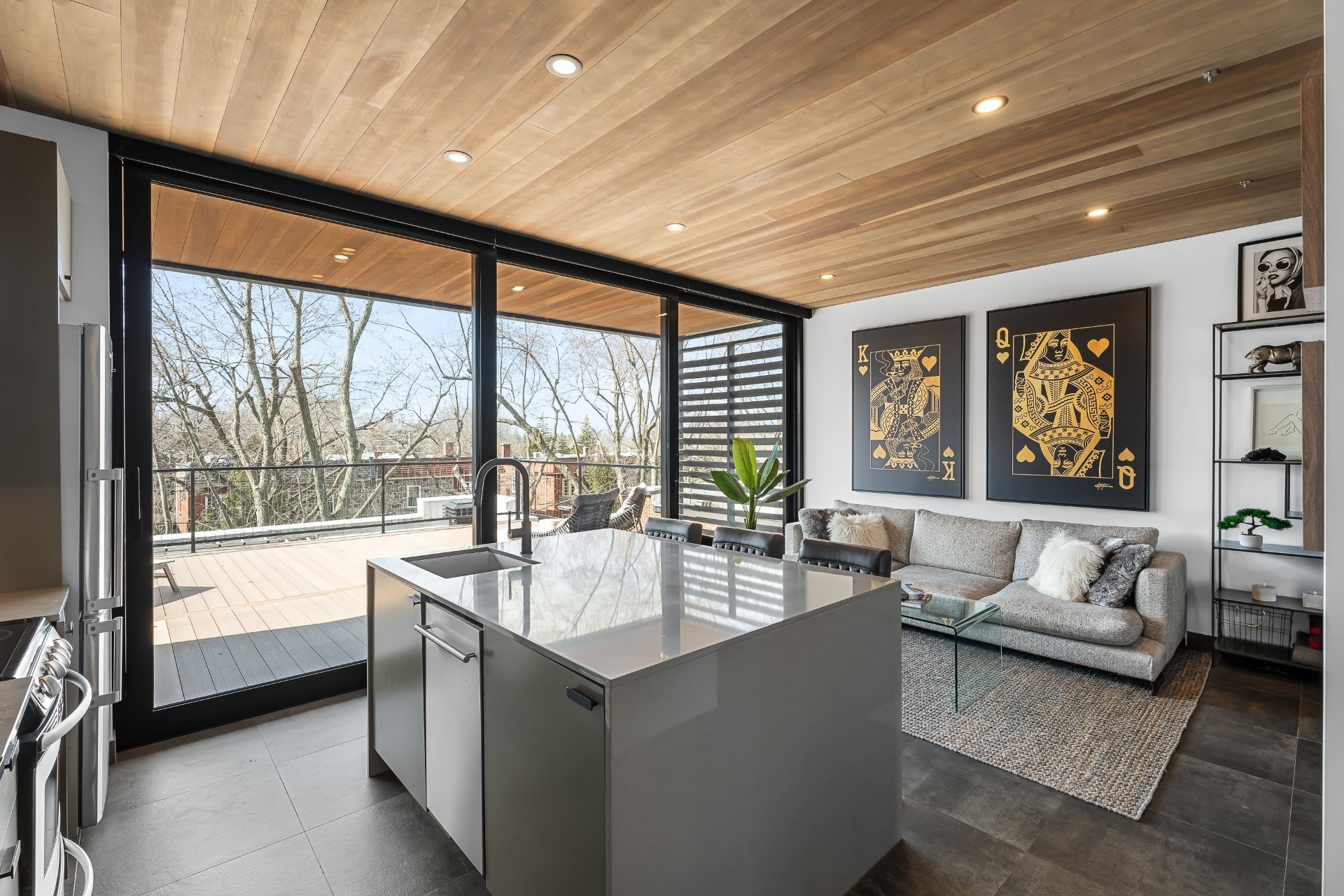 À l'extérieur, une superbe terrasse de plus de 400 pi², accessible par de grandes portes coulissantes, offre un prolongement naturel de l'espace intérieur. Un lieu privilégié pour recevoir en toute élégance, partager un apéritif ou simplement profiter des soirées d'été avec vue dégagée.